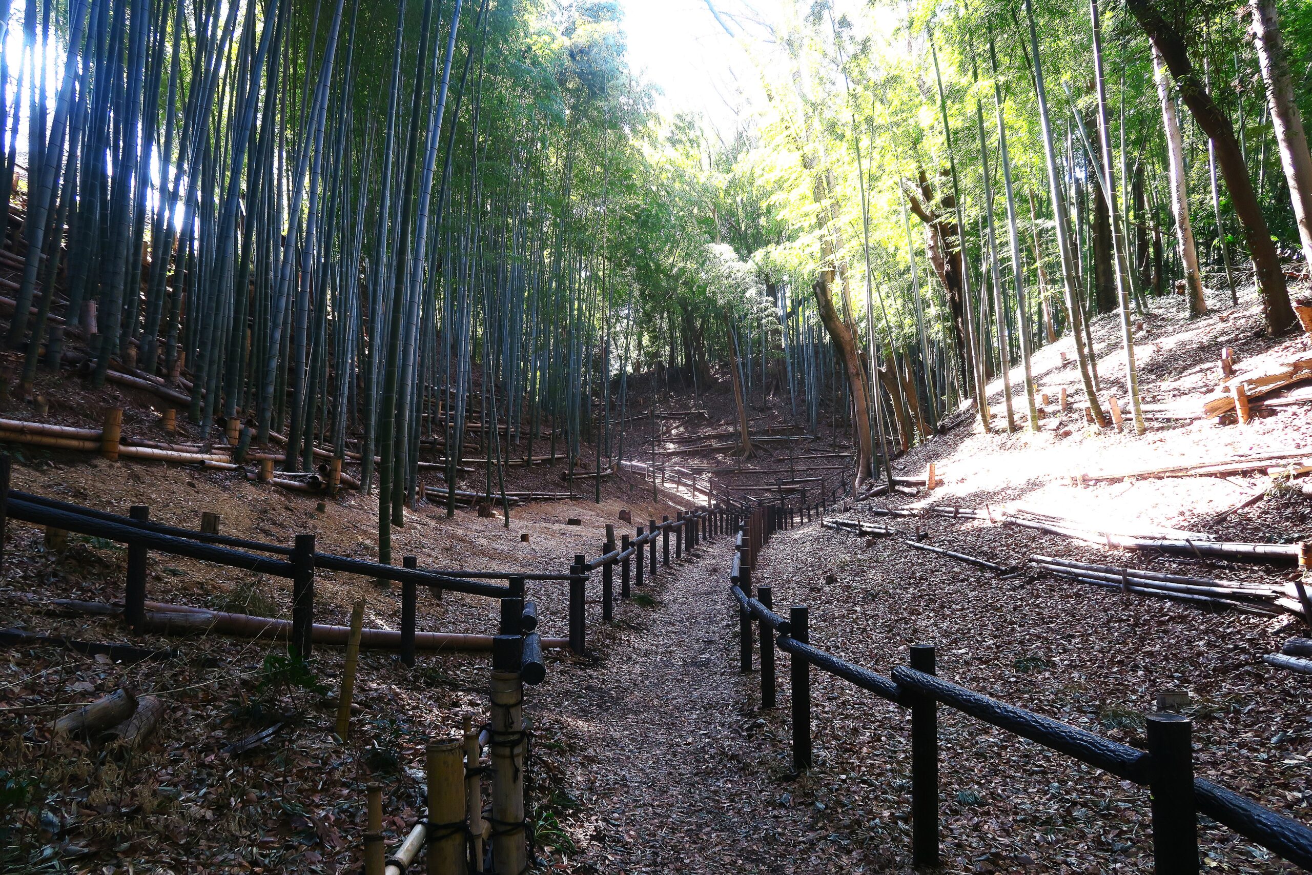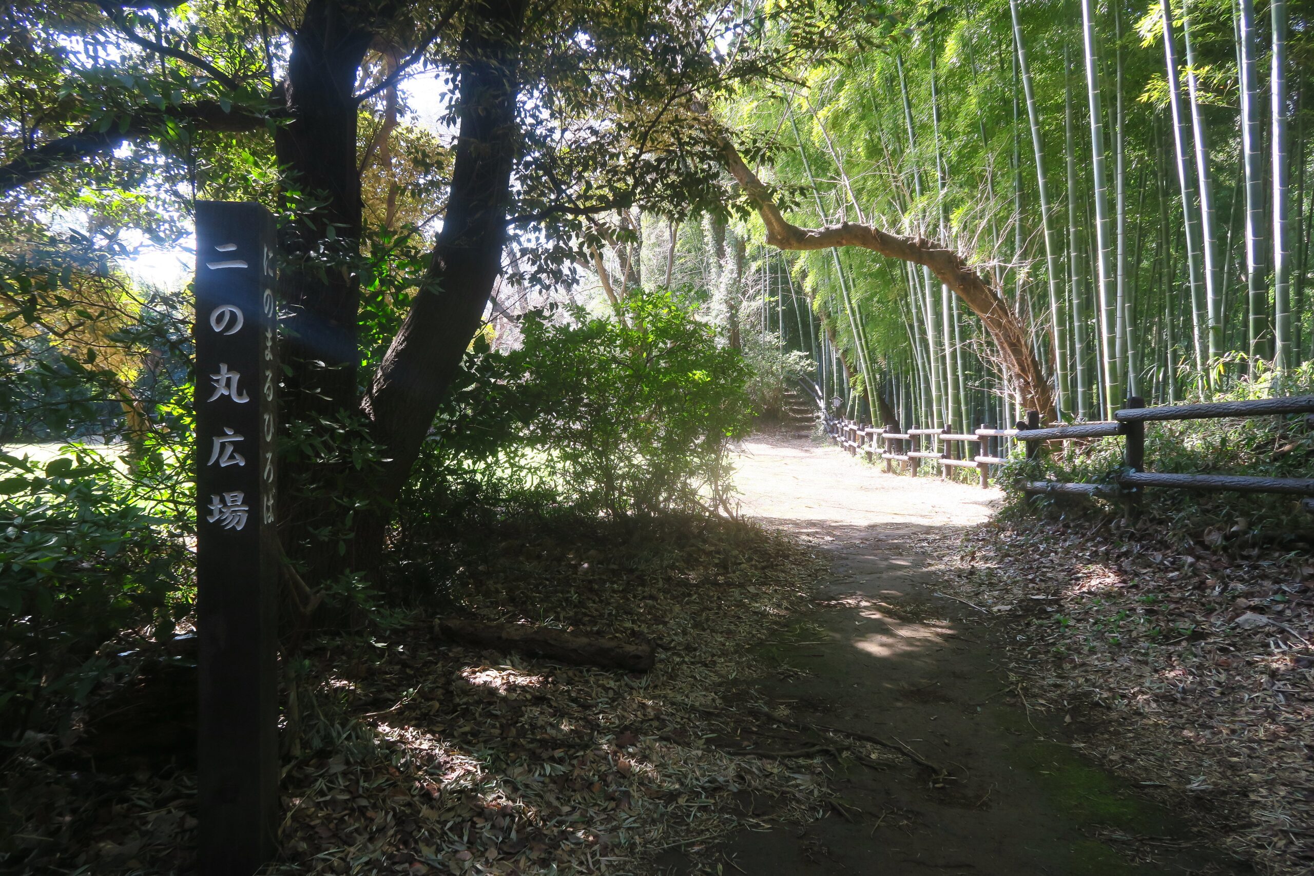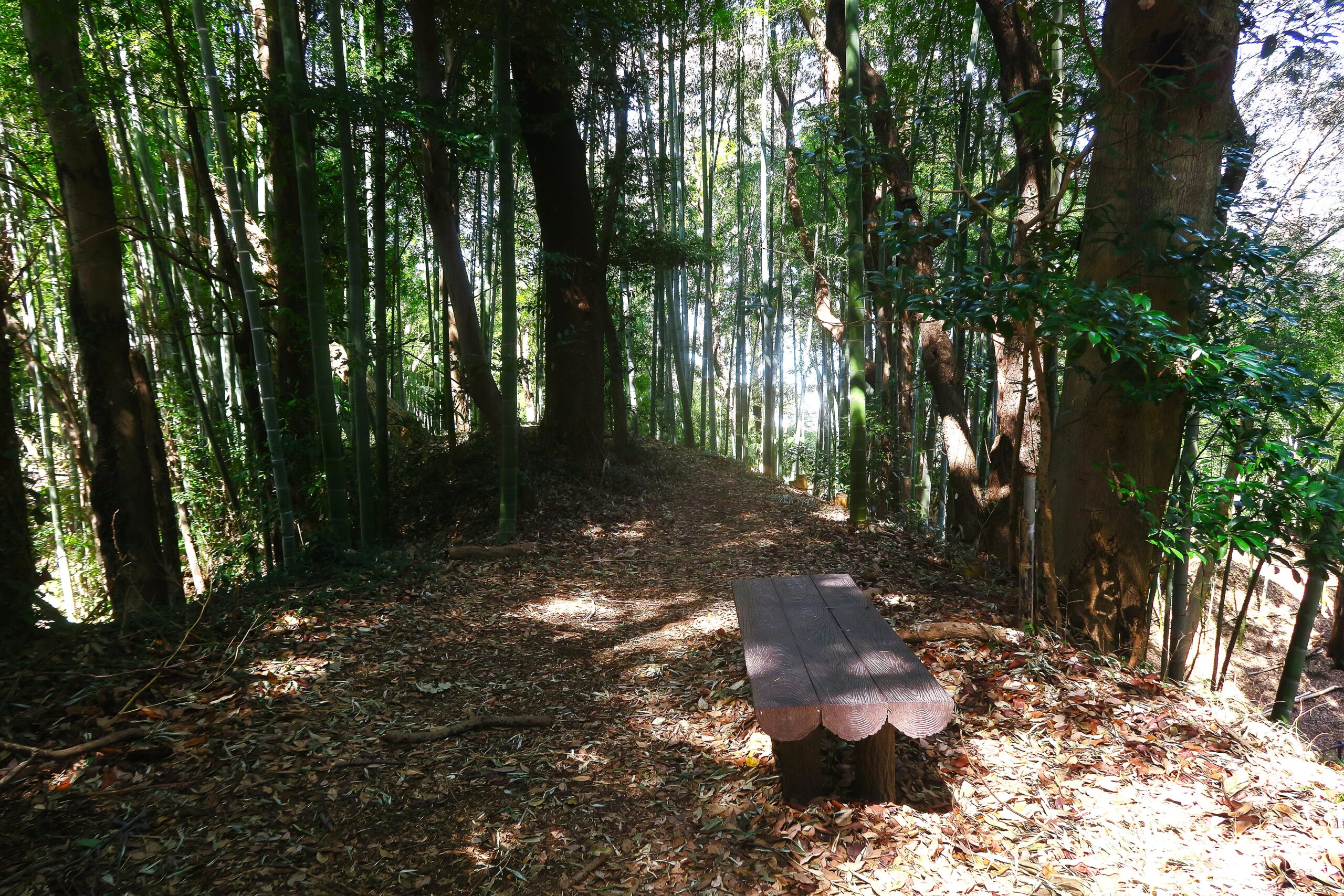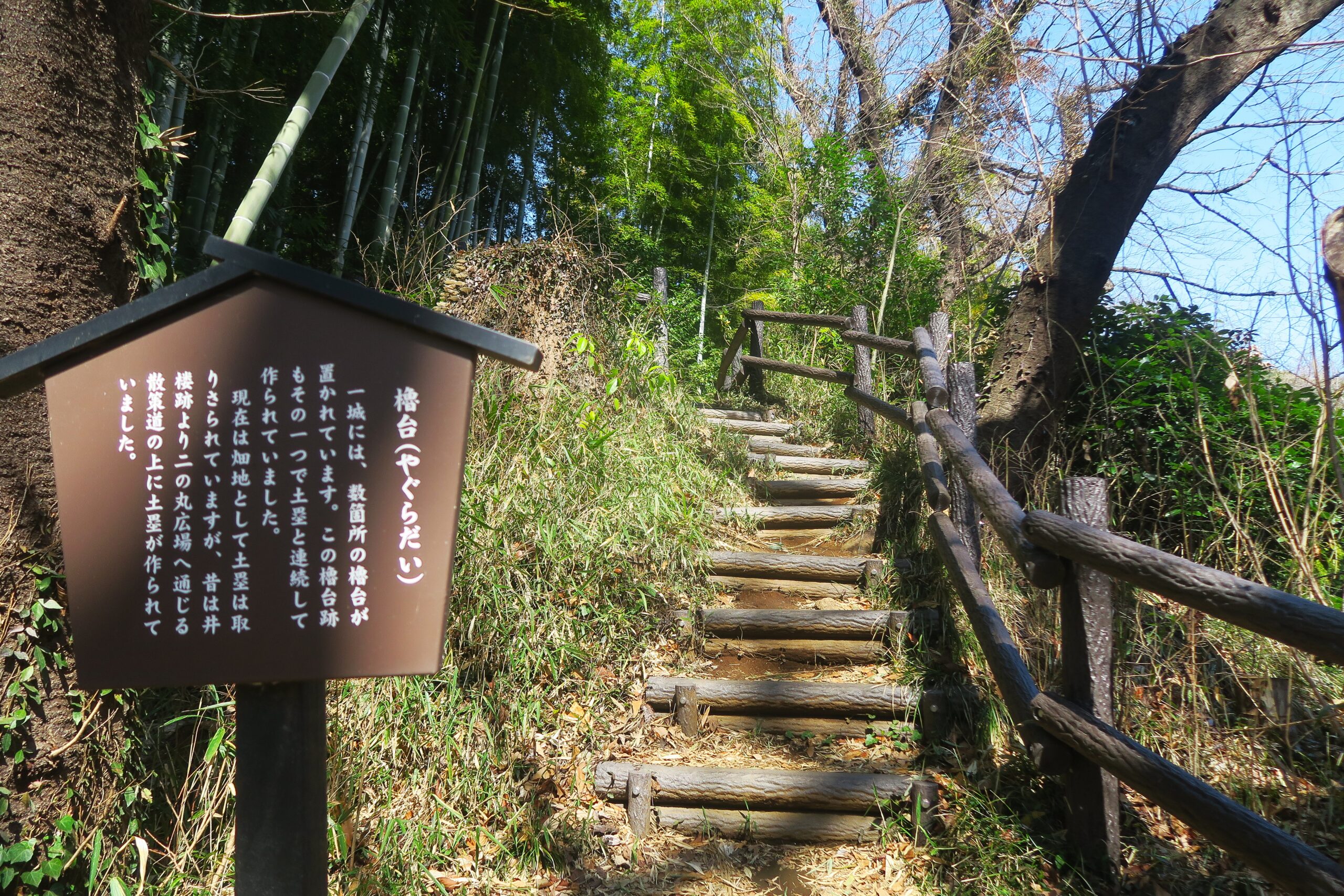 孟宗竹の竹林の中の登城道を登っていきます。登城道はよく整備され、案内標識も随所にあり迷うことはありません。