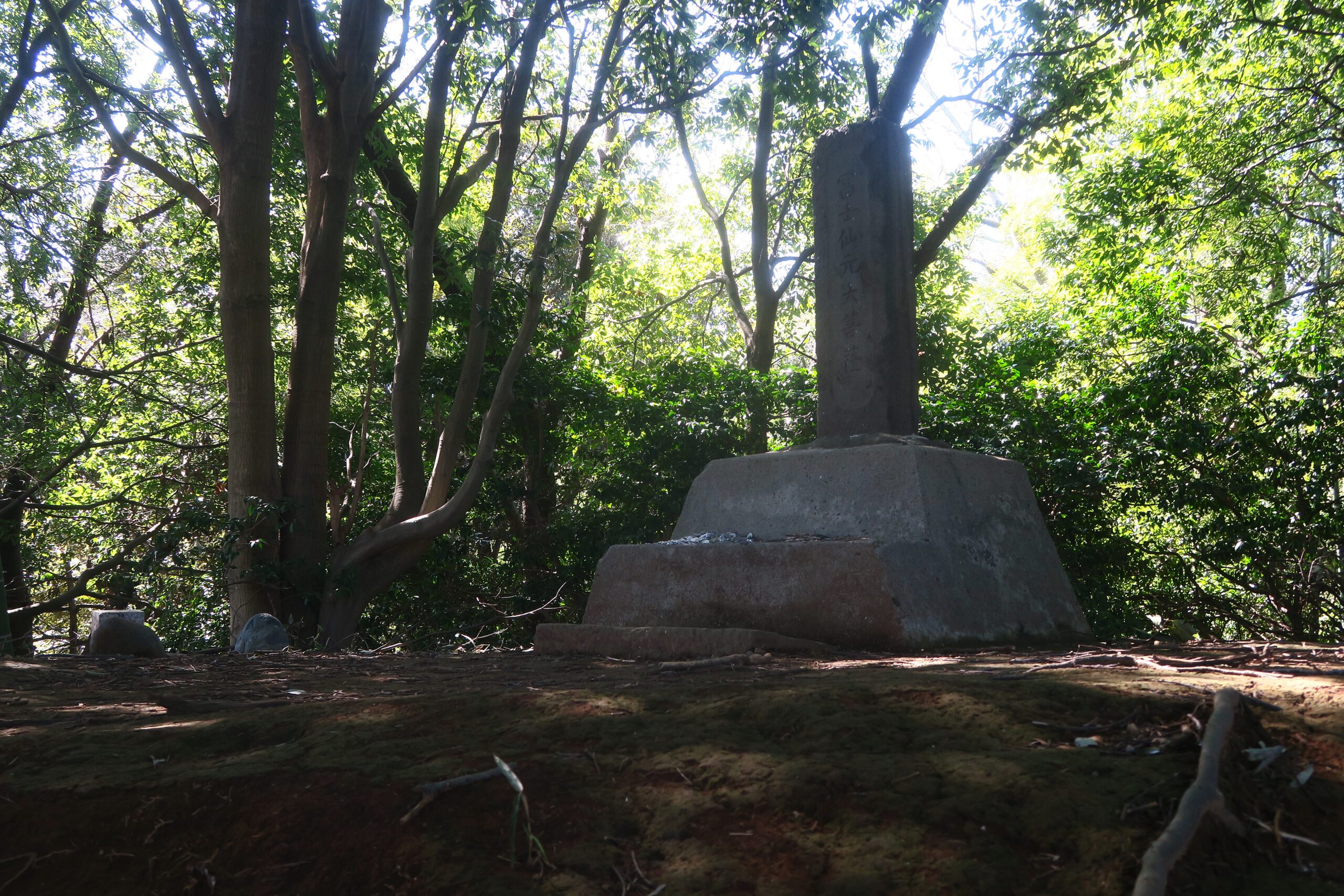角馬出から城山を下り、第三京浜道路をくぐり、富士塚の富士仙元の石段を登ります。富士塚は富士山を神の宿る場所として信仰する人々の集まりである「富士講」によって、江戸時代後期以降に主として富士登山が困難な人々のために江戸とその周辺地域に築かれました。最盛期には「江戸八百八講」と称されるほど数多くの講が結成されていた代表的な庶民信仰です。小机城の「富士仙元」は出丸のような郭にあった櫓台に建てらた富士塚と考えられています。石碑には富士仙元大菩薩と記されていて、富士山に祀られている木花咲耶姫と同一の名前です。見通しが良ければ富士山が拝める場所なのでしょう。