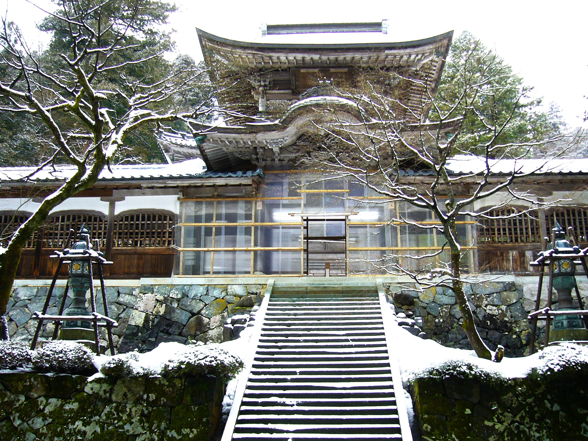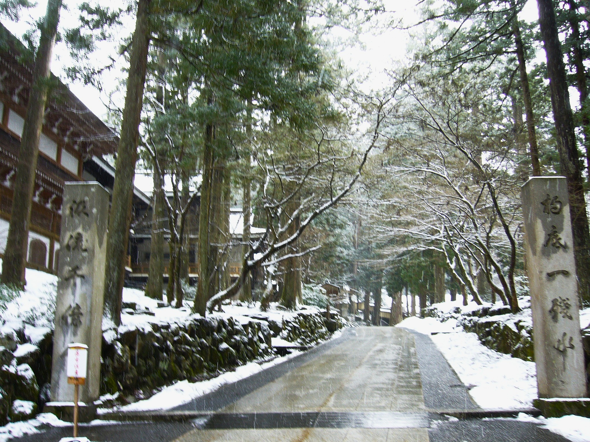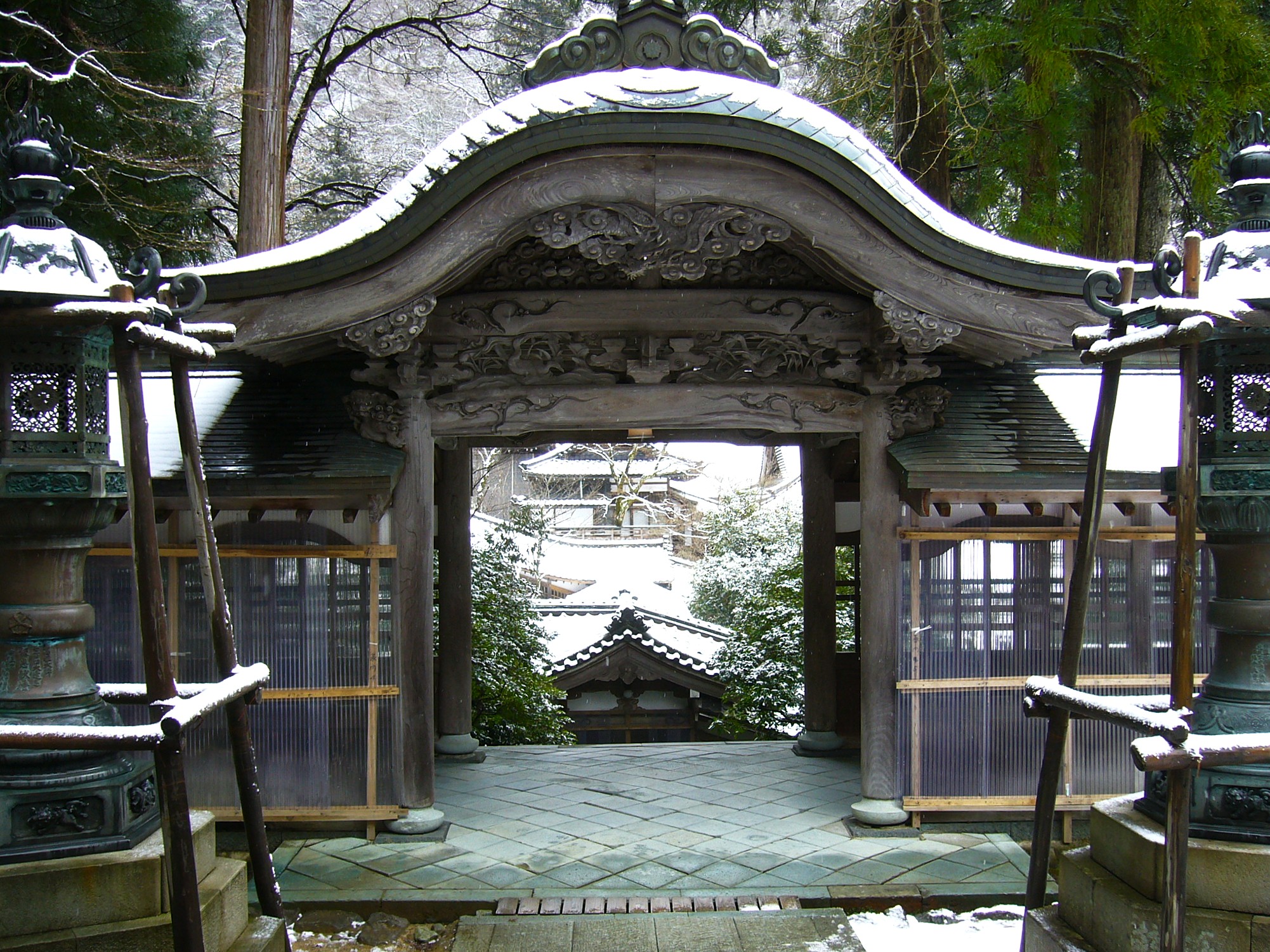しんしんと降る雪の中、一歩一歩踏みしめながら参道を歩く。その奥には大本山永平寺の象徴である唐門が端然と屹立しています。天保10年(1839)再建の勅使門ともいわれる木々の奥に建つ荘厳な唐門は、ポスターによく使われている永平寺のシンボル。新たな住職の入山や賓客の訪問時に開かれる以外は一般の参拝者は入れません。(大晦日の夜だけ一般開放される)石段の下から見学するだけですが、空気は澄み渡り、まるで山水画のような世界が広がっています。