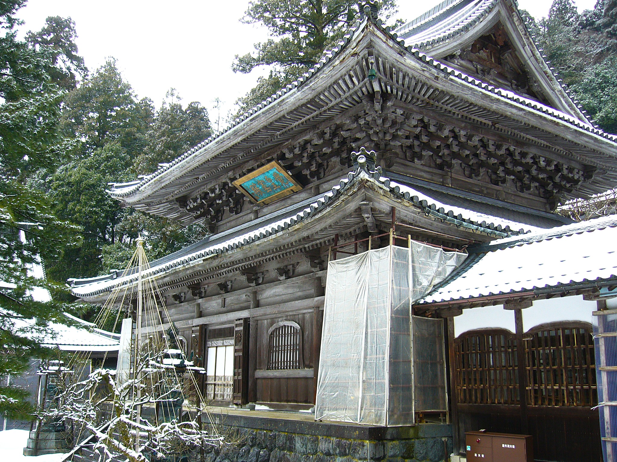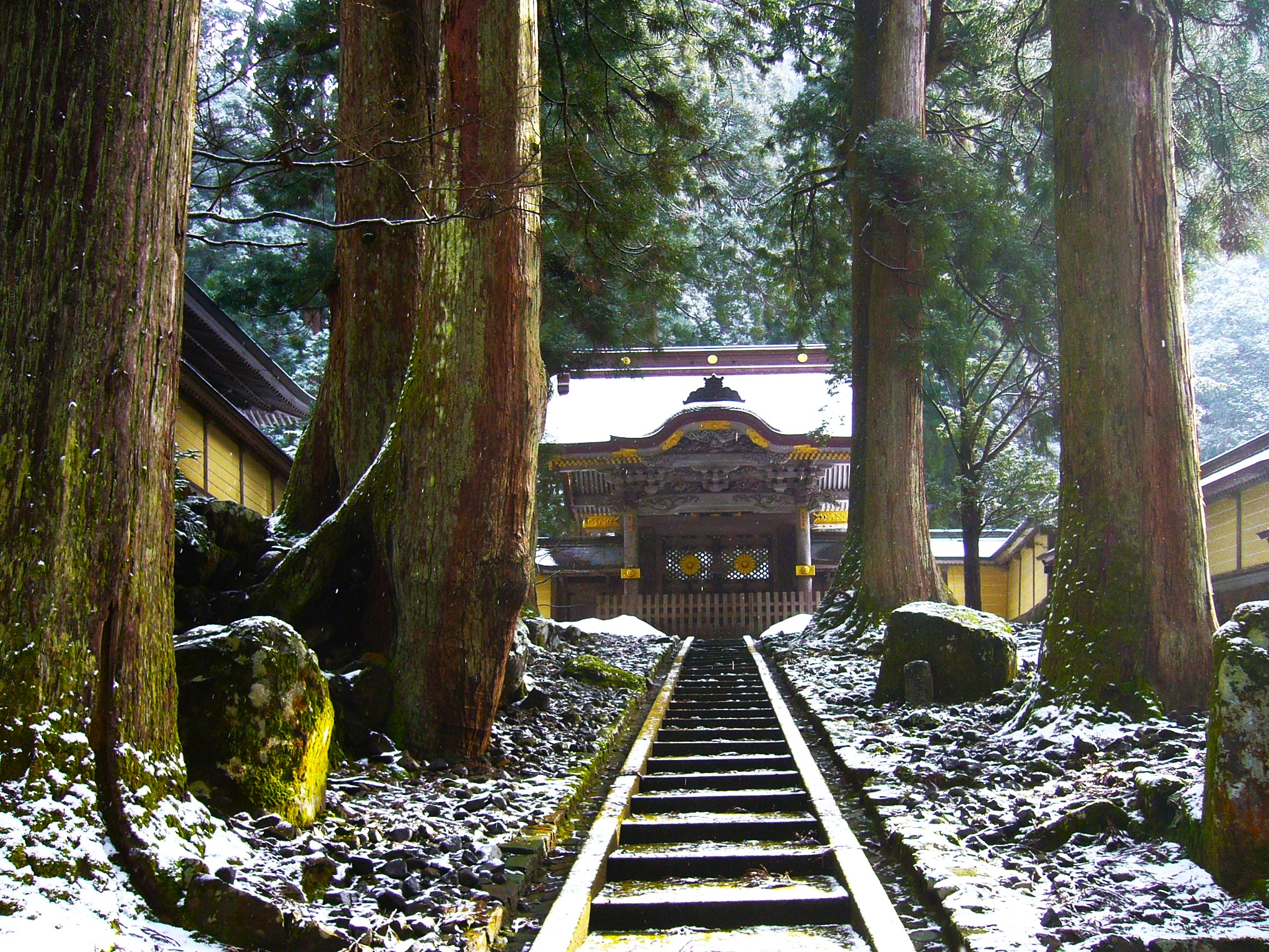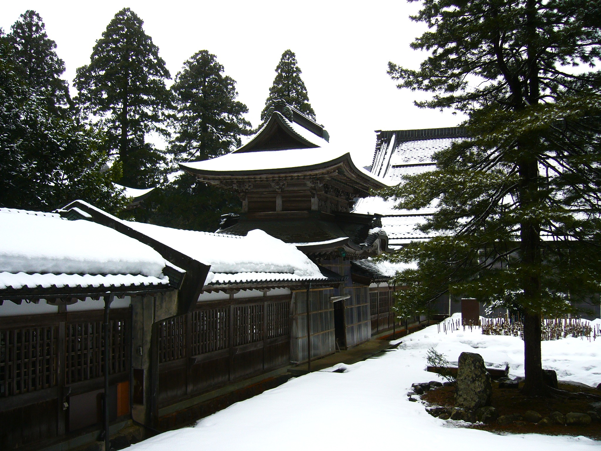 しんしんと降る雪の中、一歩一歩踏みしめながら参道を歩く。その奥には大本山永平寺の象徴である唐門が端然と屹立しています。天保10年(1839)再建の勅使門ともいわれる木々の奥に建つ荘厳な唐門は、ポスターによく使われている永平寺のシンボル。新たな住職の入山や賓客の訪問時に開かれる以外は一般の参拝者は入れません。(大晦日の夜だけ一般開放される)石段の下から見学するだけですが、空気は澄み渡り、まるで山水画のような世界が広がっています。