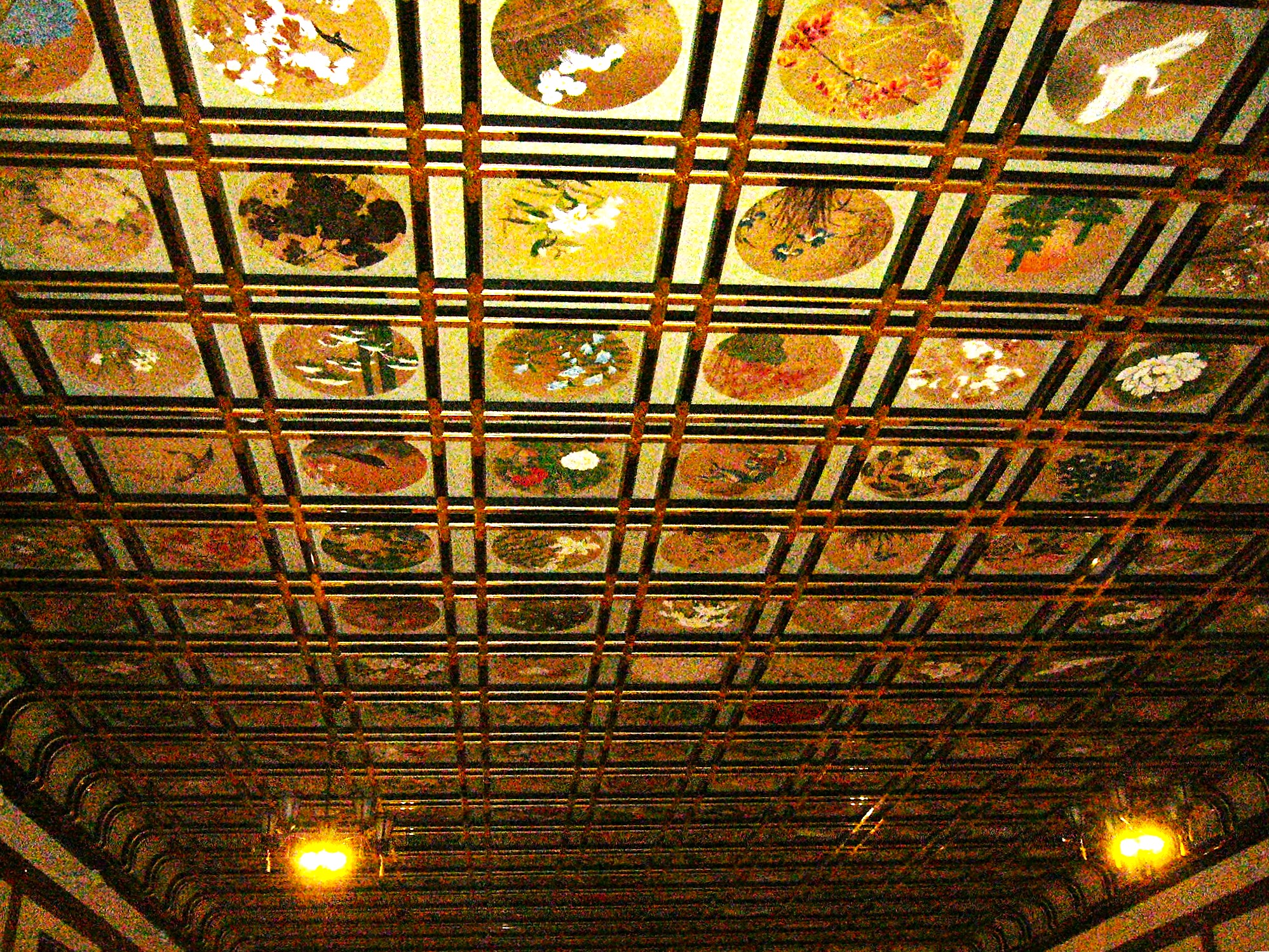 最初は階段を上り隣の②天井絵が美しい「傘松閣」を見学します。2階の156畳敷きの「絵天井の大広間」は、金箔に彩られた昭和5年(1930)建築当時の著名な日本画家144名による230枚の花鳥図が天井一面に広がる。その中には、鯉2枚、唐獅子2枚、リス1枚の3種類の生き物の絵があり、それら5枚を見つけると願いが叶うと言われている。特にリスは難しく葡萄の絵のリスが紛れていますよ。
