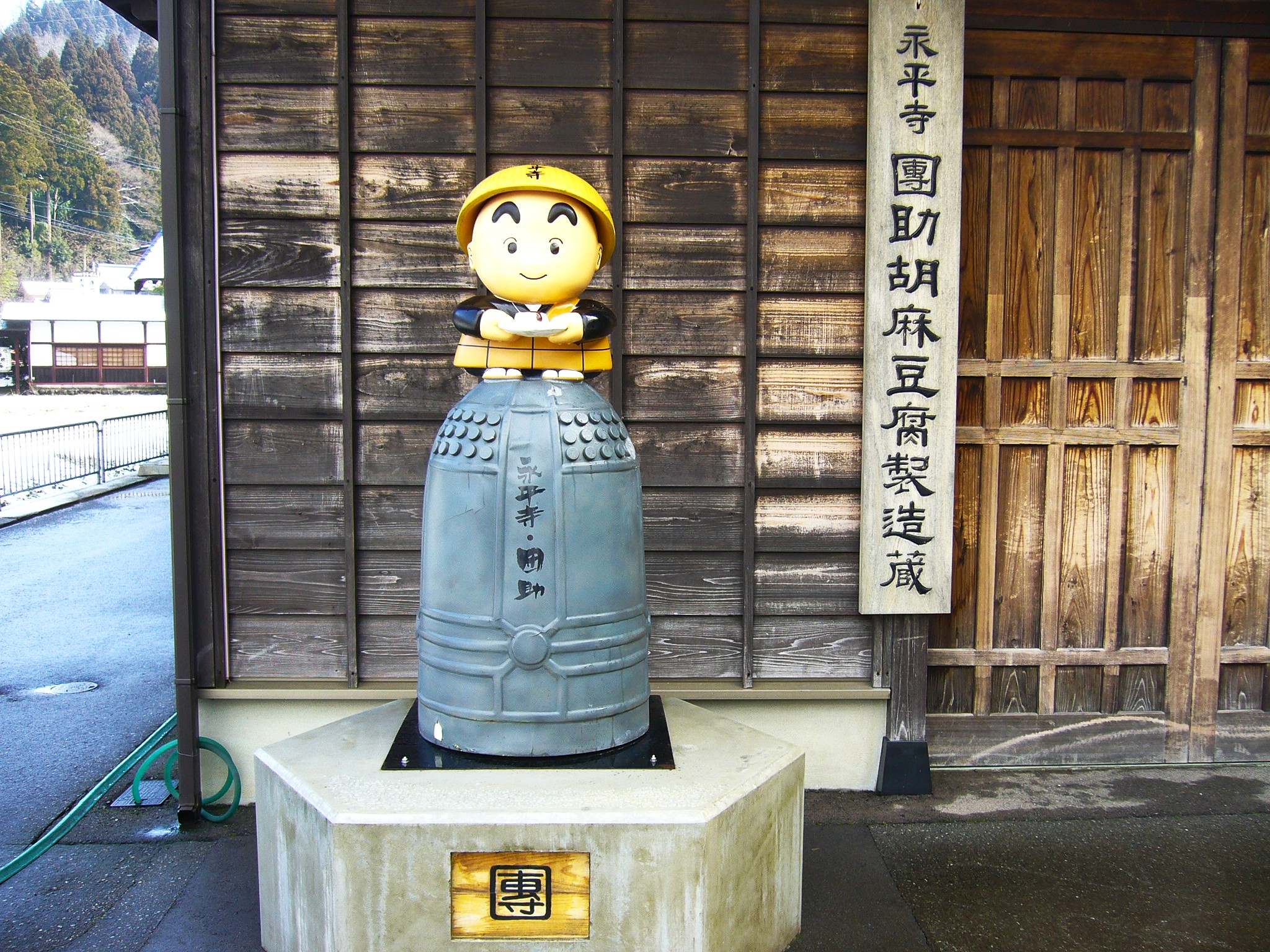 「大本山 永平寺」に向かうため国道364号を走る。永平寺は九頭竜川支流の永平寺川上流に建ち、谷沿いに境内が広がります。永平寺川に沿って正門と通用門を結ぶ参道を歩きます。弓なりの橋は偃月橋