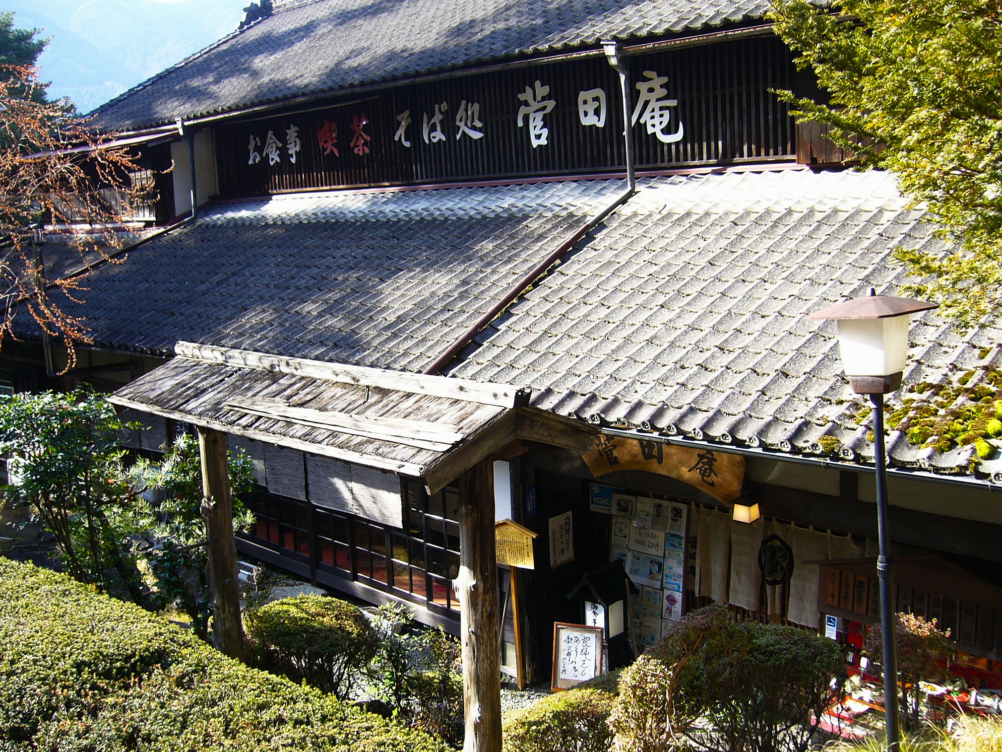 旅に食べ歩きはつきもので、お昼は何たべよう?と悩むのも楽しみのひとつ。下呂温泉では地元の食材を使った下呂ならではのグルメ「G-ランチ&G-グルメ」とを楽しむのもオススメ。下呂温泉合掌村のすぐ手前に下呂の「G-ランチ&G-グルメ」の「トマト丼」を提供する菅田庵があります。築400年程の庄屋造りの邸宅を移築したという店内は、広い店内でゆっくり食事ができます。
