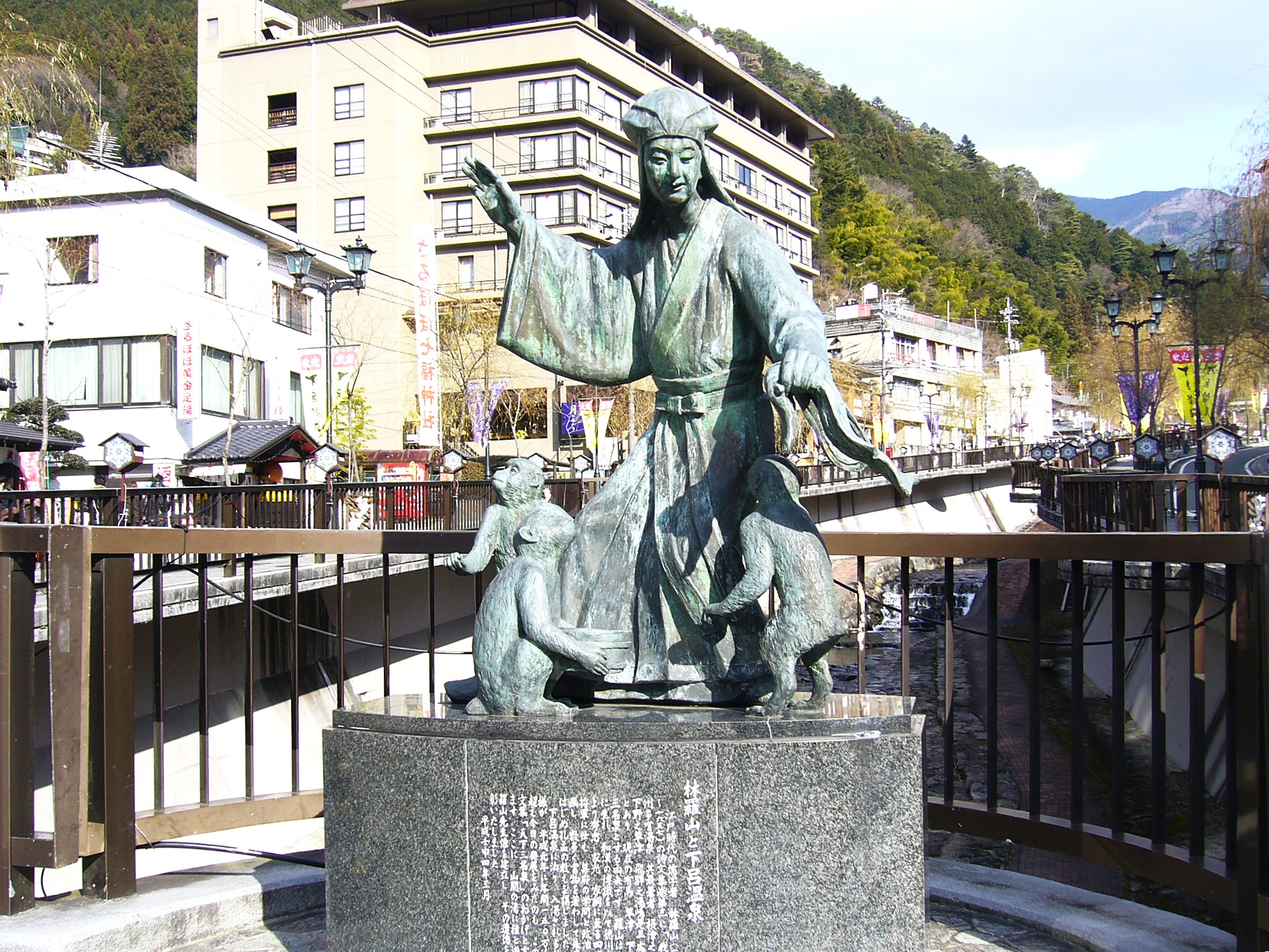街を流れる阿多野川に架かる白鷺橋には、儒学者、林羅山と映画俳優チャールズ・チャップリンの銅像が建てられています。徳川家康から家綱までの4代の将軍に仕えた、江戸時代初期の儒学者である林羅山は、紀行漢詩集第三のなかで 「湯之島は古来の霊湯たること、遠く知るものなしといえども、入湯する人はその験を得ざることなし」 と下呂温泉を日本三名泉の一つと讃えています。この賞賛の言葉が影響したのか、江戸時代中期には、年間3万人もの湯治客が訪れたといいます。またその近くにはさるぼぼ神社があったり、あちことにカエルの置物があったりします。