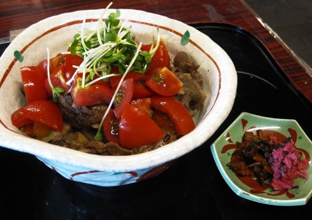 下呂市内の標高600m前後の地域では、昼夜の寒暖差が大きく、栽培される夏秋トマトは甘味が多いと市場評価も高く、生産量も多い。トマトの産地ということでご主人の岡田周平氏が開発したもので、飛騨牛を地元産のマイタケなどとしぐれ煮にし、トマトをトッピングした丼です。甘辛く煮込んだ飛騨牛の肉汁とトマトの酸味が以外とあいます。2010年5月8日放送の情報・教養バラエティ番組『SmaSTATION‼』で、「特別企画:今年ブレイクしそうな最新B級グルメ ベスト10」で13位でした。