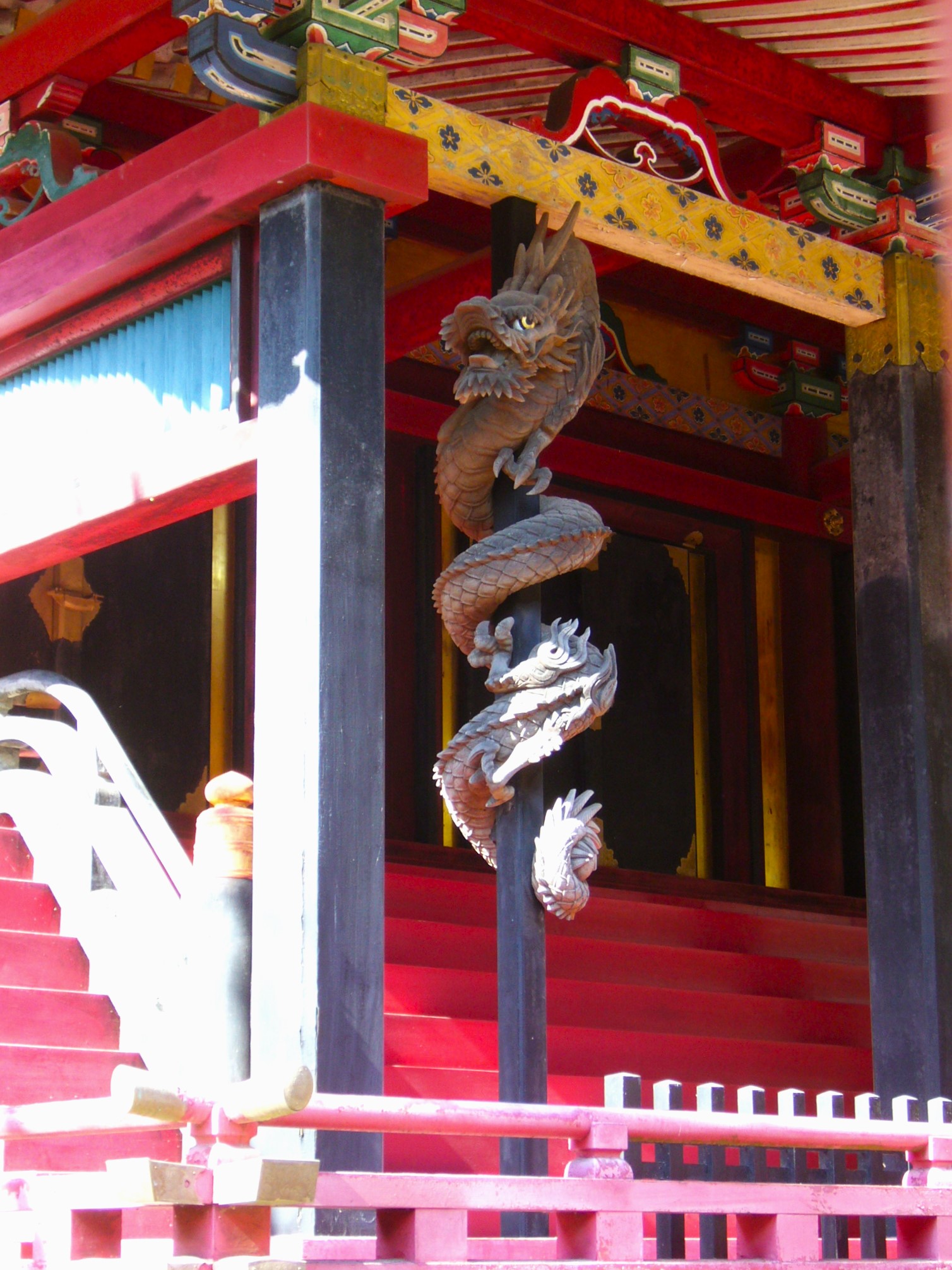 266段の石段を上って杉木立エリアを抜けると大理石の龍が巻きついた柱が二本建っています。