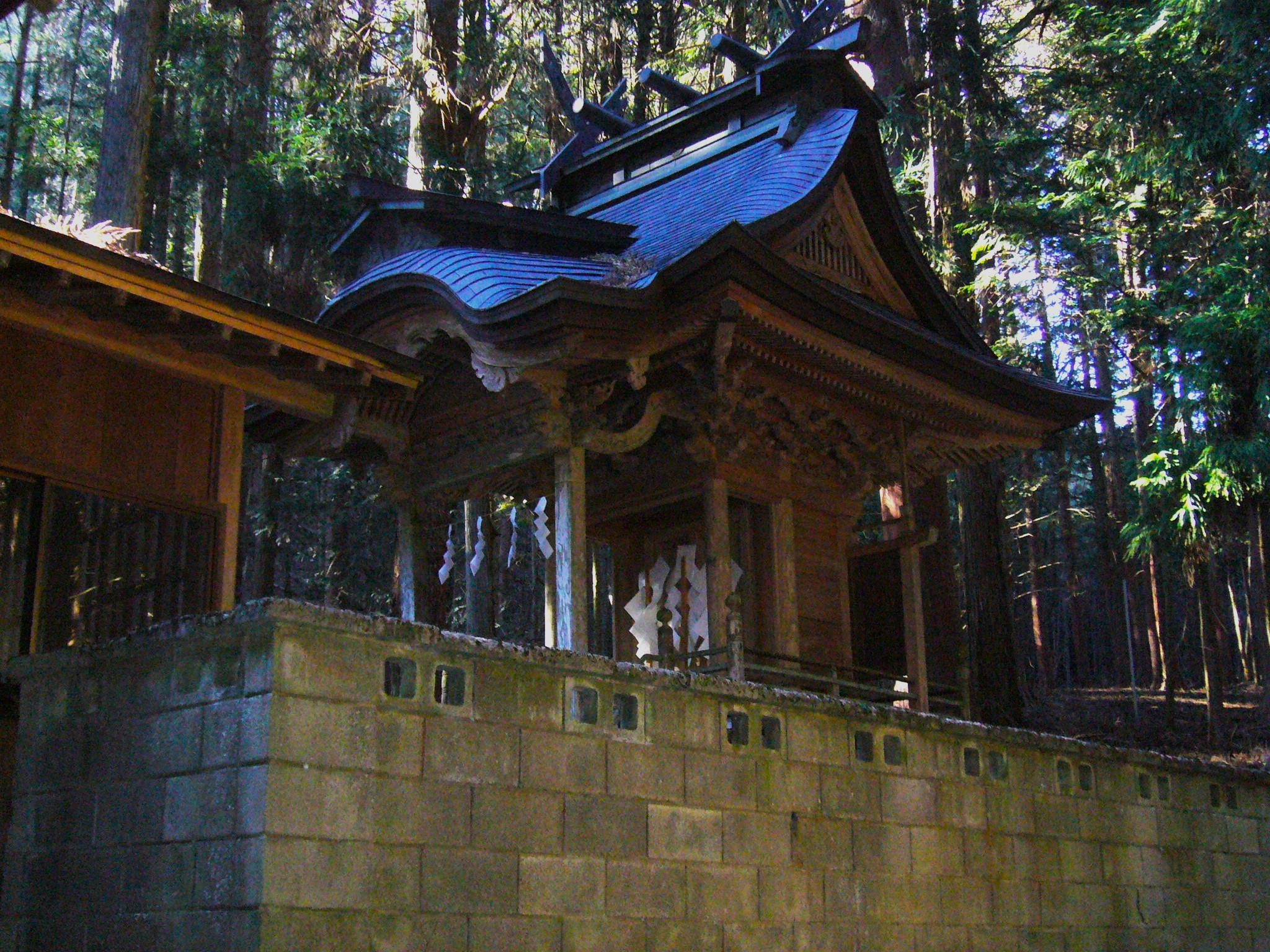 本殿は一間社唐破風付向背にて屋根は銅板葺入母屋造りで箱棟に千木をのせています。身舎は円柱にて前部と後部に分れ、正面に開扉があります。高欄付縁を四方にめぐらし、木造彫刻の狛犬は古く、その伝説が残されています。