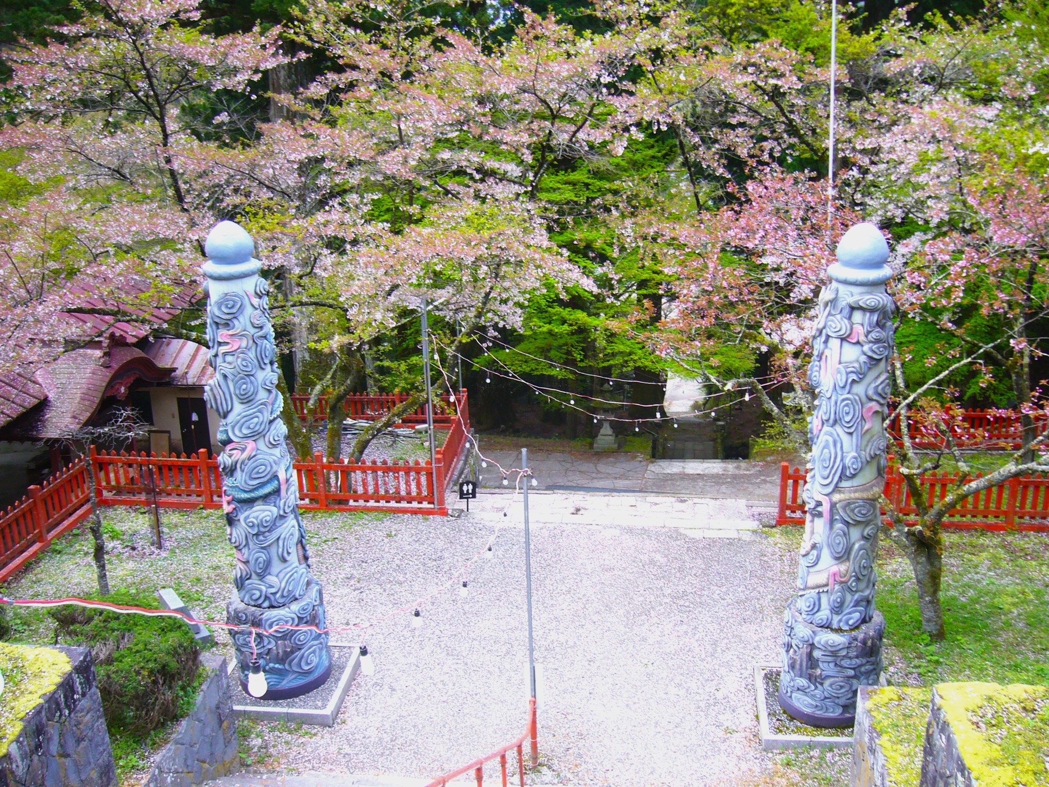 杉木立の暗がりとは対照的に、色の濃く美しい枝垂れ桜や八重桜が境内を彩っています。御岳金櫻神社は日本三御嶽の一つに数えられ、古くから桜の里として知られてきたことから、特に「花の御嶽」ともいわれている。