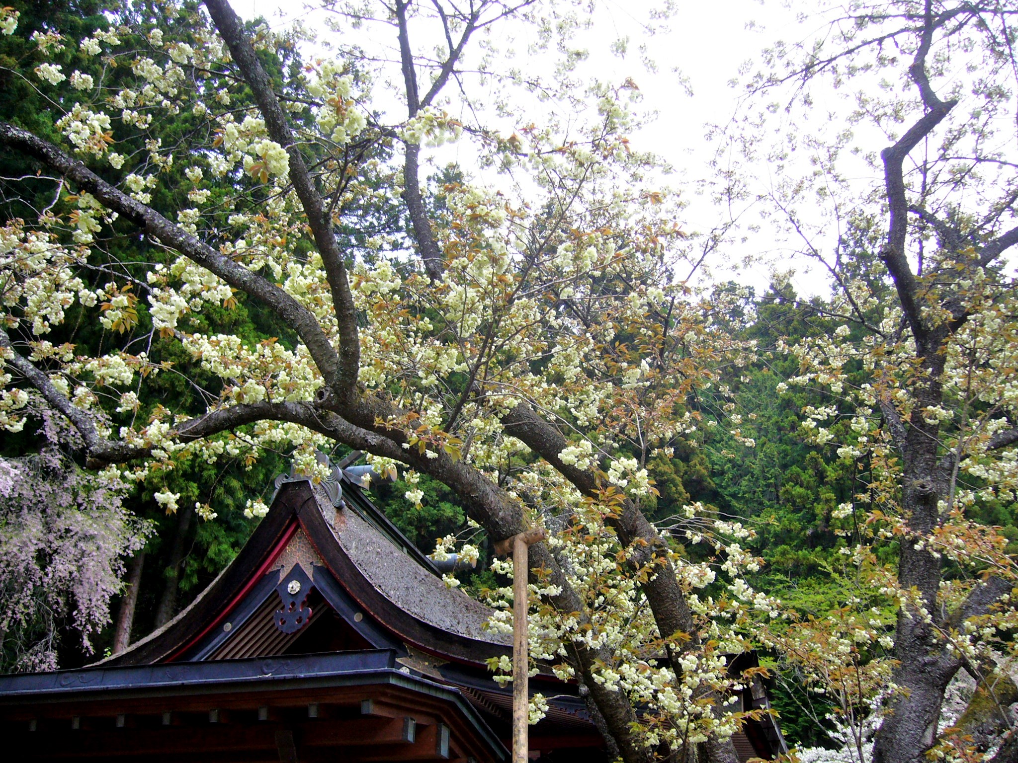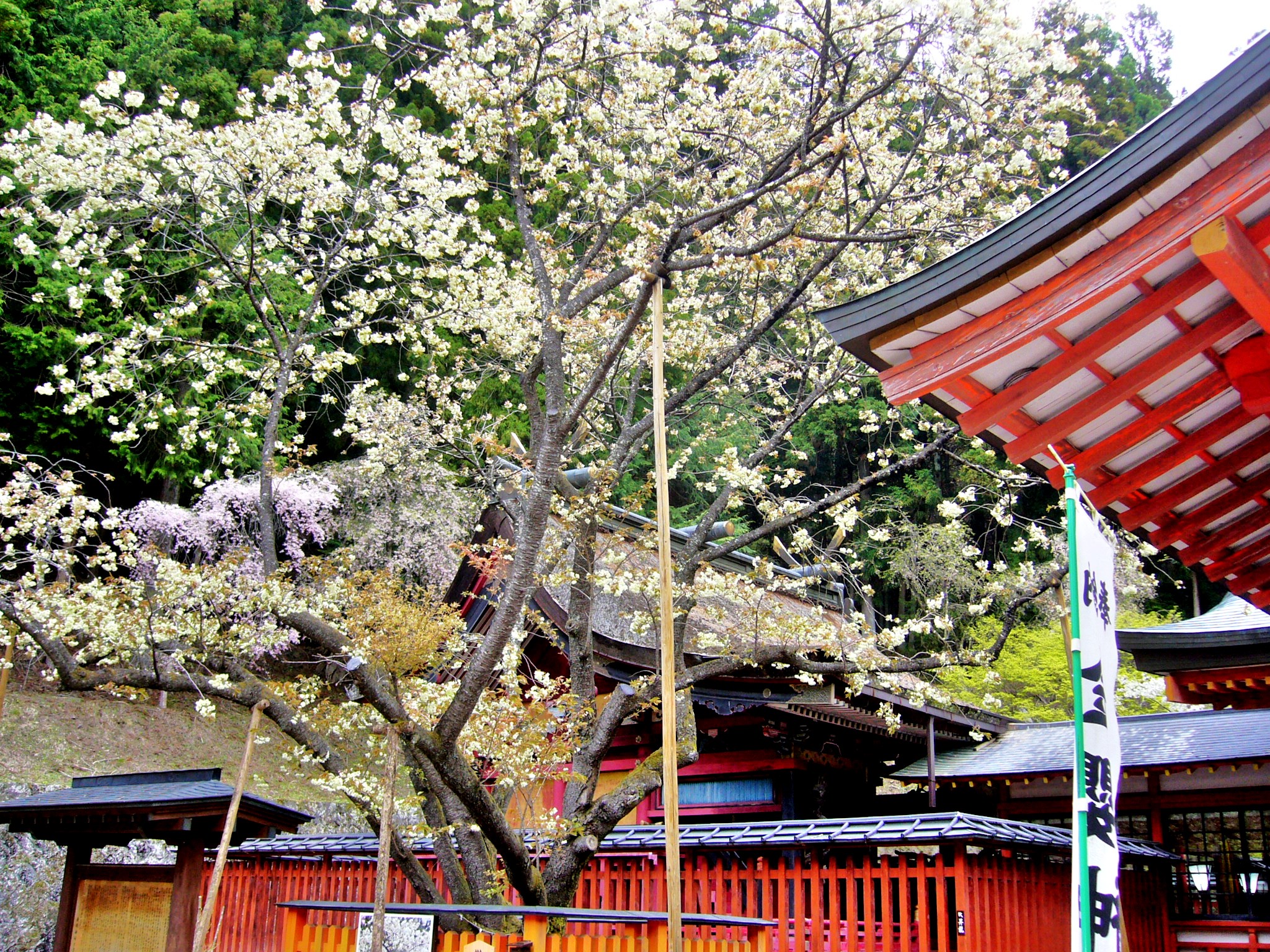 4月も下旬になると境内周辺に植えられたおよそ500本の山桜や枝垂れ桜が一斉に開花し、境内にある100本を超える桜とともに神社はよりにぎわいを増します。あでやか山桜や枝垂れ桜の紅色に対して、本殿脇で4月下旬から5月上旬にやや大きめで淡い黄緑色を帯びた独特のゆかしい花を咲かせる桜「鬱金の桜」が満開に咲き誇ります。鬱金桜は、全国的にも希少な存在である園芸種の里桜の一種で、役の行者の「以金為成 以桜為霊」という宣託によって古くから「金の成る木の金櫻」と民謡に唄われているとおり昔から崇められてきた御神木です。水晶発祥の神社ともいわれ、この時期に桜を拝み水晶のお守りを頂くと金運アップのご神徳があるとされています。