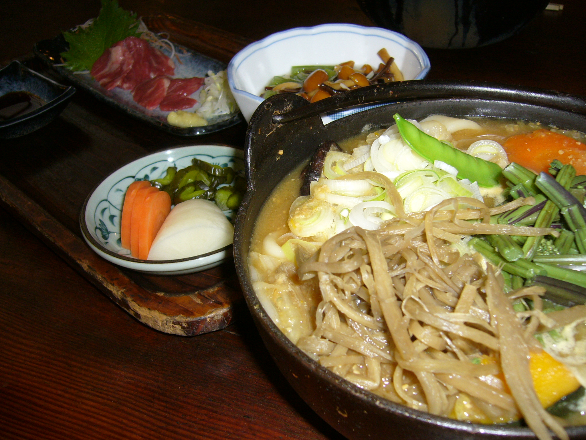 ほうとうは小麦粉を練った平打ち麺に、かぼちゃや芋類、きのこ、季節の野菜、肉などの具材を加えて、味噌仕立ての汁で煮込む素朴な料理です。武田信玄が陣中食にしていたとも伝えられています。注文したほうとうは一番人気の「熟瓜(かぼちゃ)のほうとう」それに酢の物、香の物、馬刺しのセットになったほうとうセットを注文する。なめこと蕗であろうか酢の物が大ヒットでした。