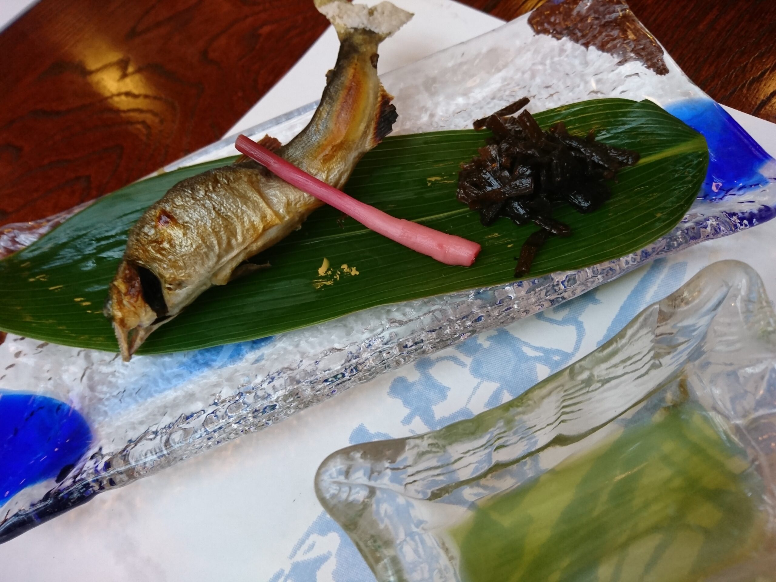 焼物の鮎の塩焼きは小ぶりながら身が引き締まってホクホク、川魚臭さもなく、頭からかぶりつけます。関西以外ではなかなか添えられていない「たて酢」もついています。