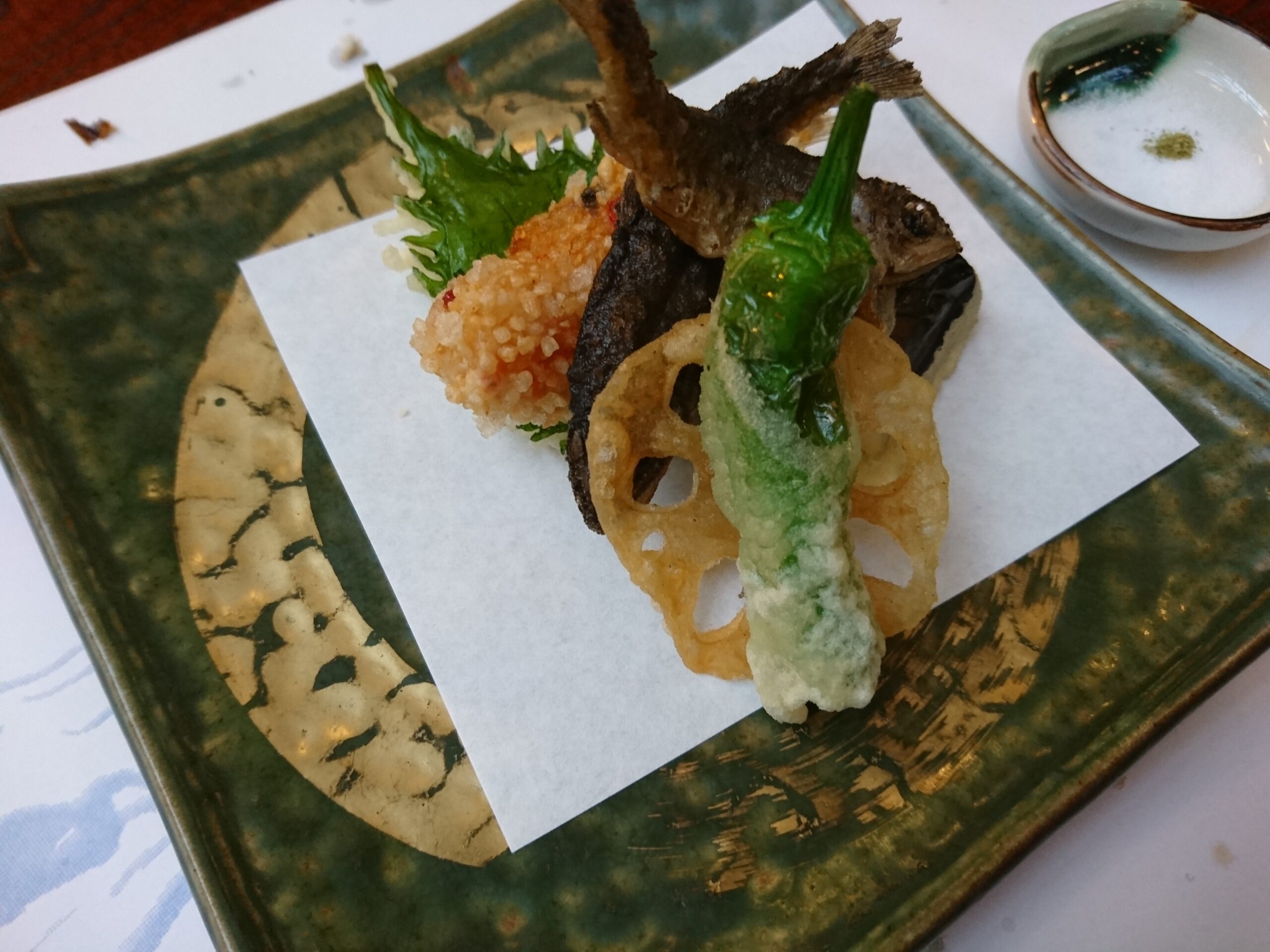 油物は、ししとう、レンコン、岩魚の唐揚げ、すり身と揃い踏み