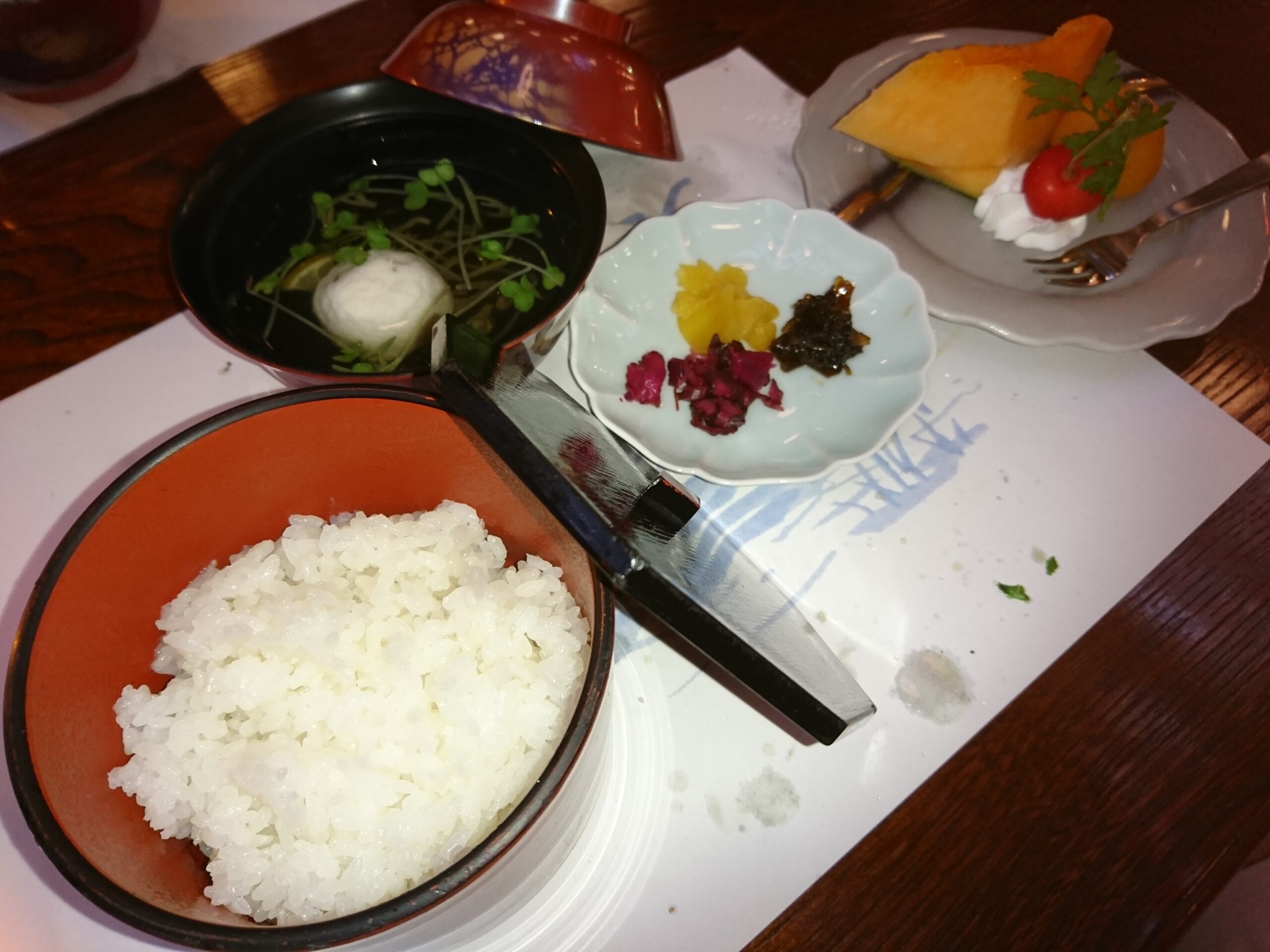 おいしい湧水で焚かれたごはんと吸い物。香の物にデザートのメロンと御馳走様でした。