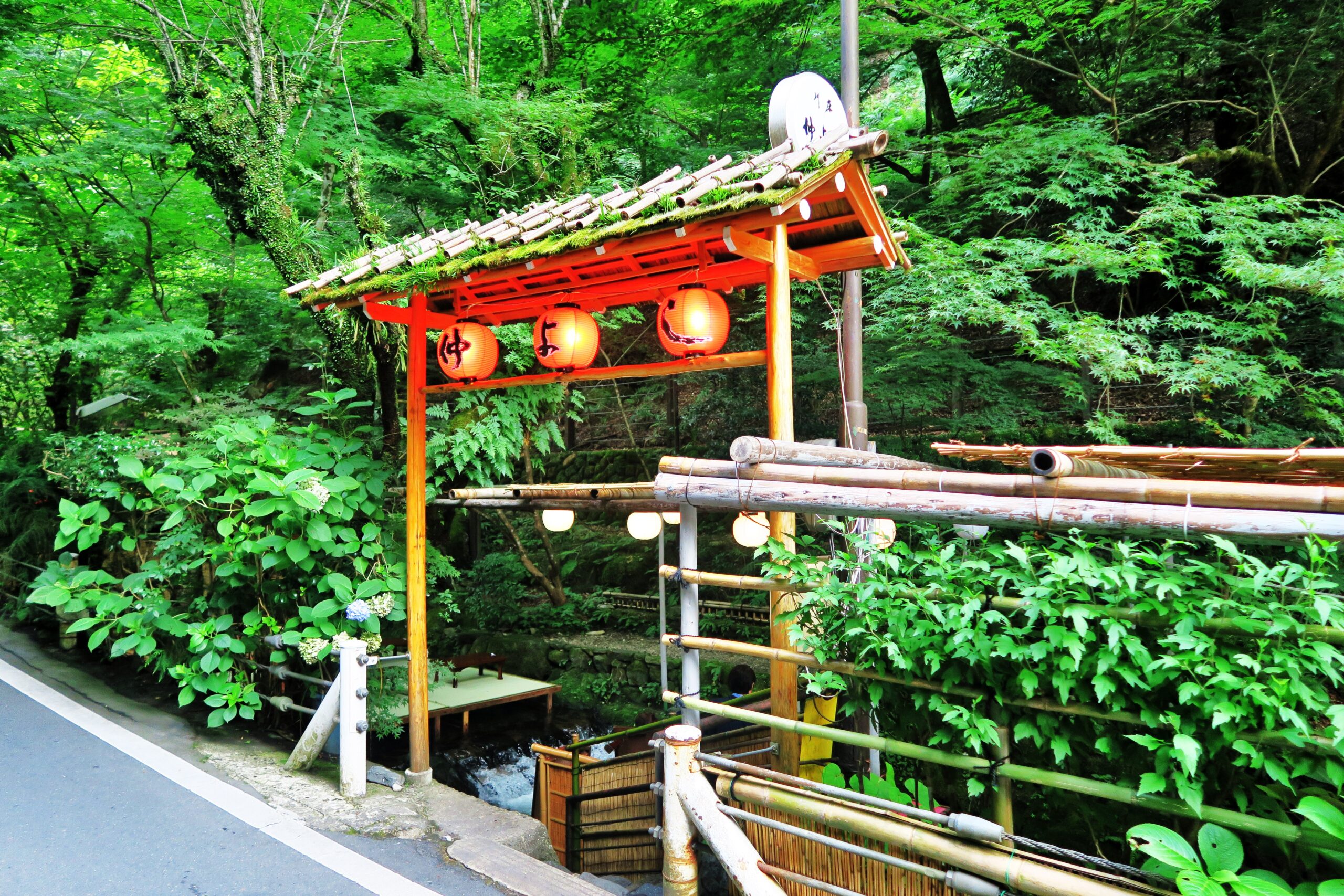 料理店が並ぶ貴船の玄関口にあるのが、貴船の川床としては200席と最大級の広さを持つ料理旅館「貴船 べにや」さん。下流にあるので川幅が広くゆったりとした雰囲気です。
