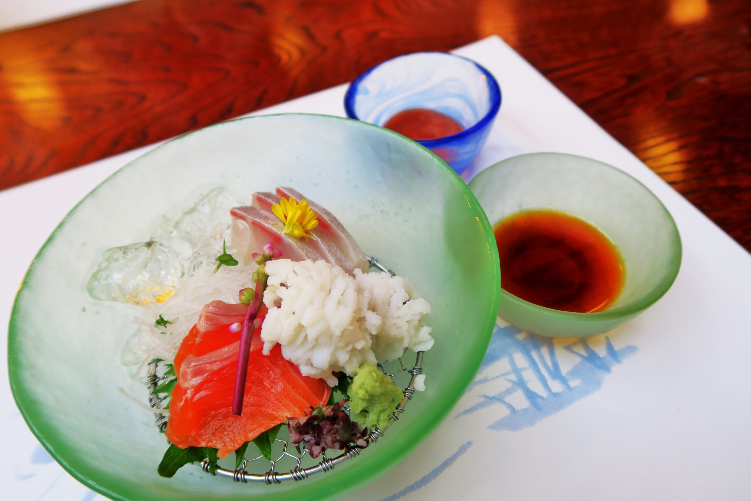 造りはサーモン、ハマチに鱧落としである。梅肉が添えられていた。