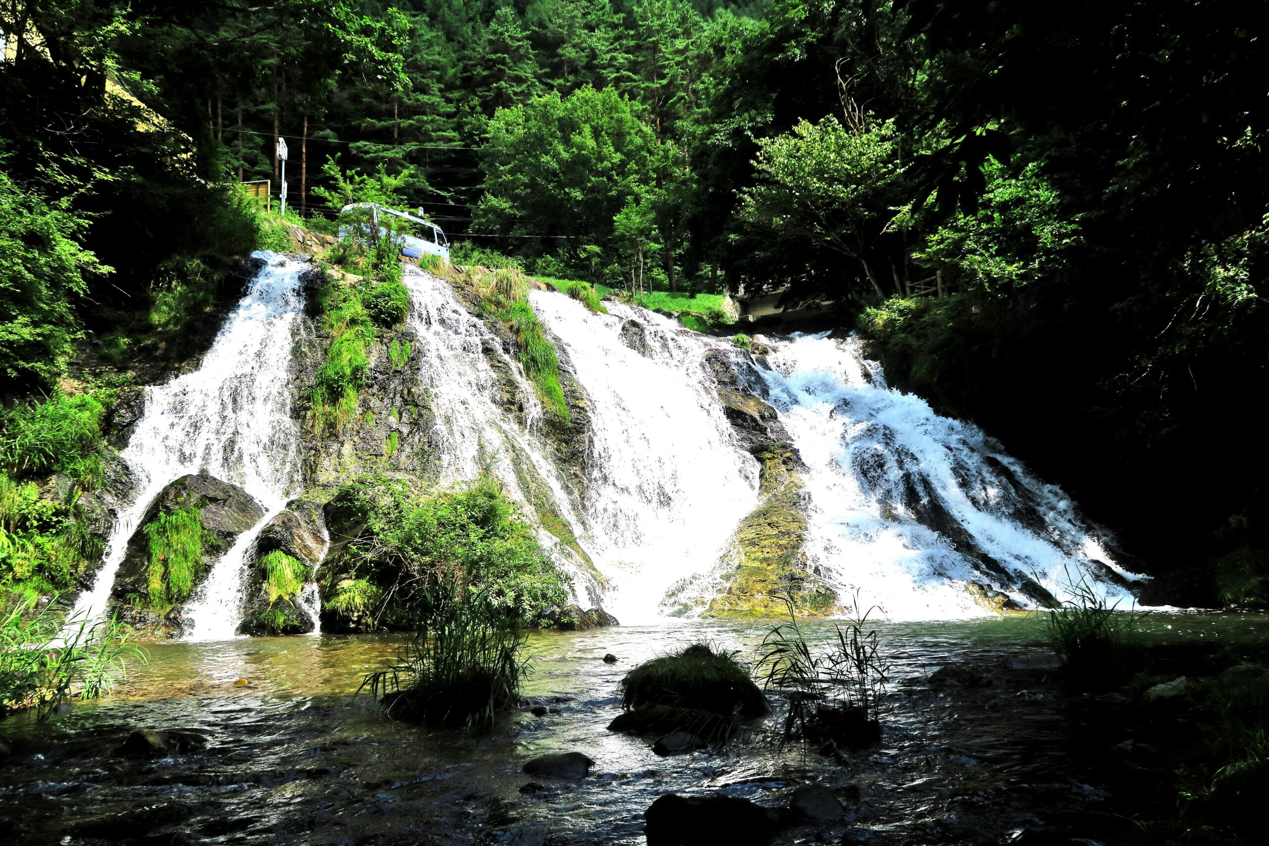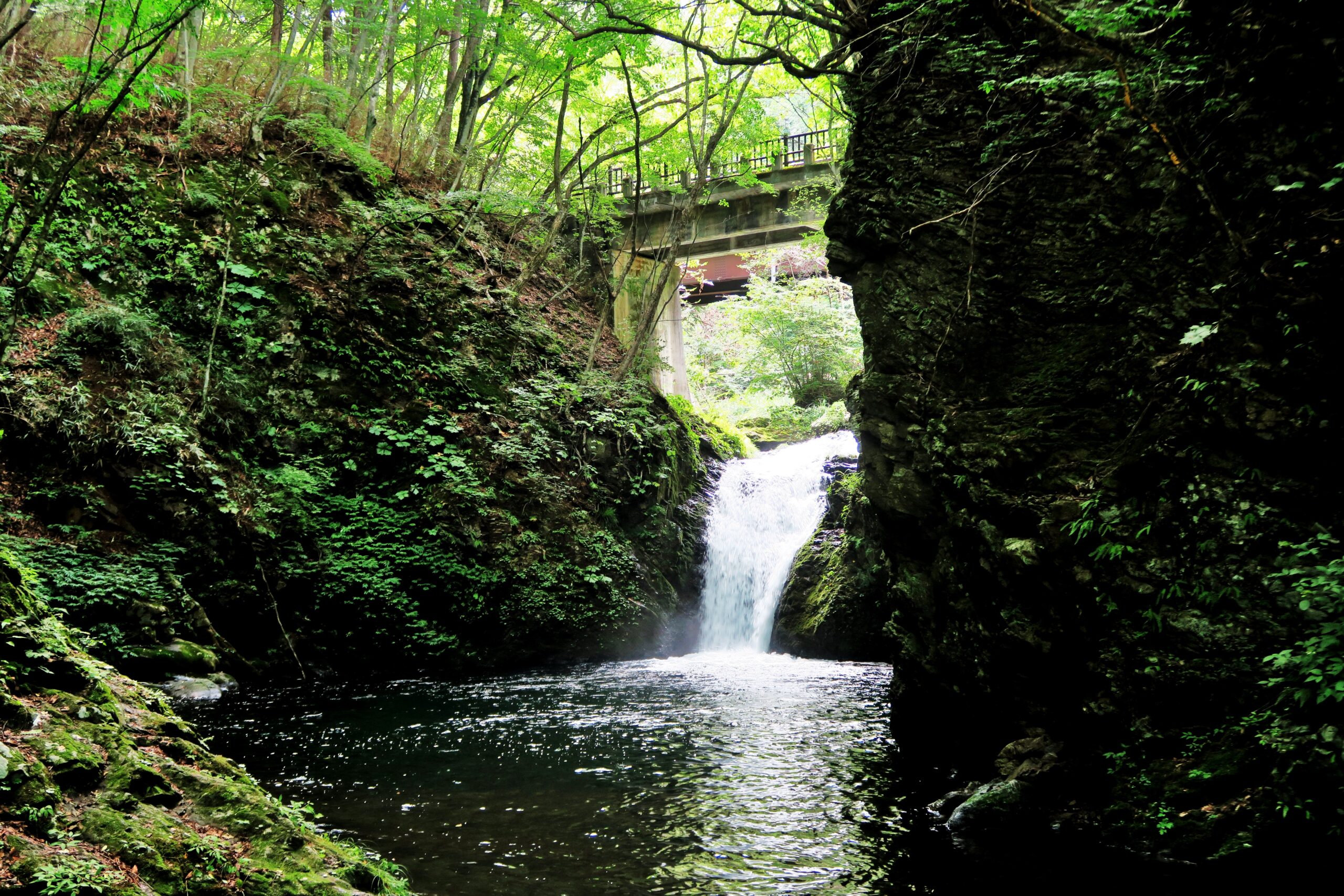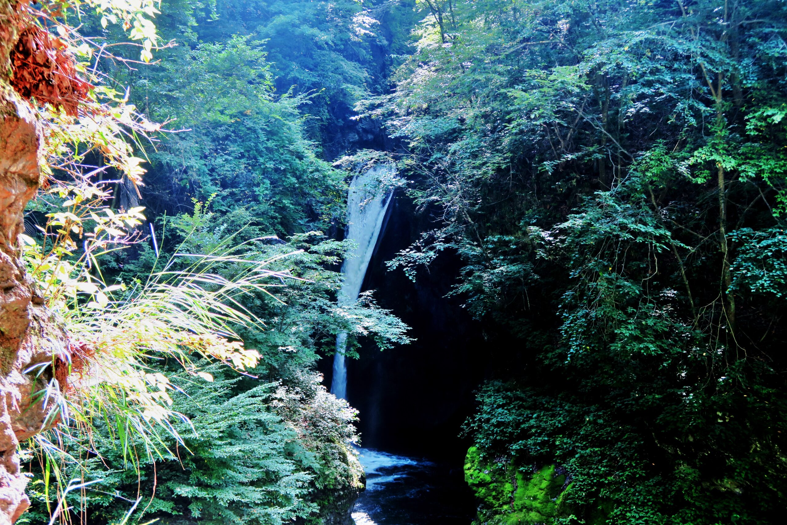 南相木ダムに近い場所にある「千ヶ滝」は、自然豊かな山中、奥三川渓谷に入口にあります。駐車場が近くにあるので、車を降りて2~3分ほど歩けば見ることができます。美しい水と広い滝壺をもち、渓谷に光が差し込んで神秘的な雰囲気です。