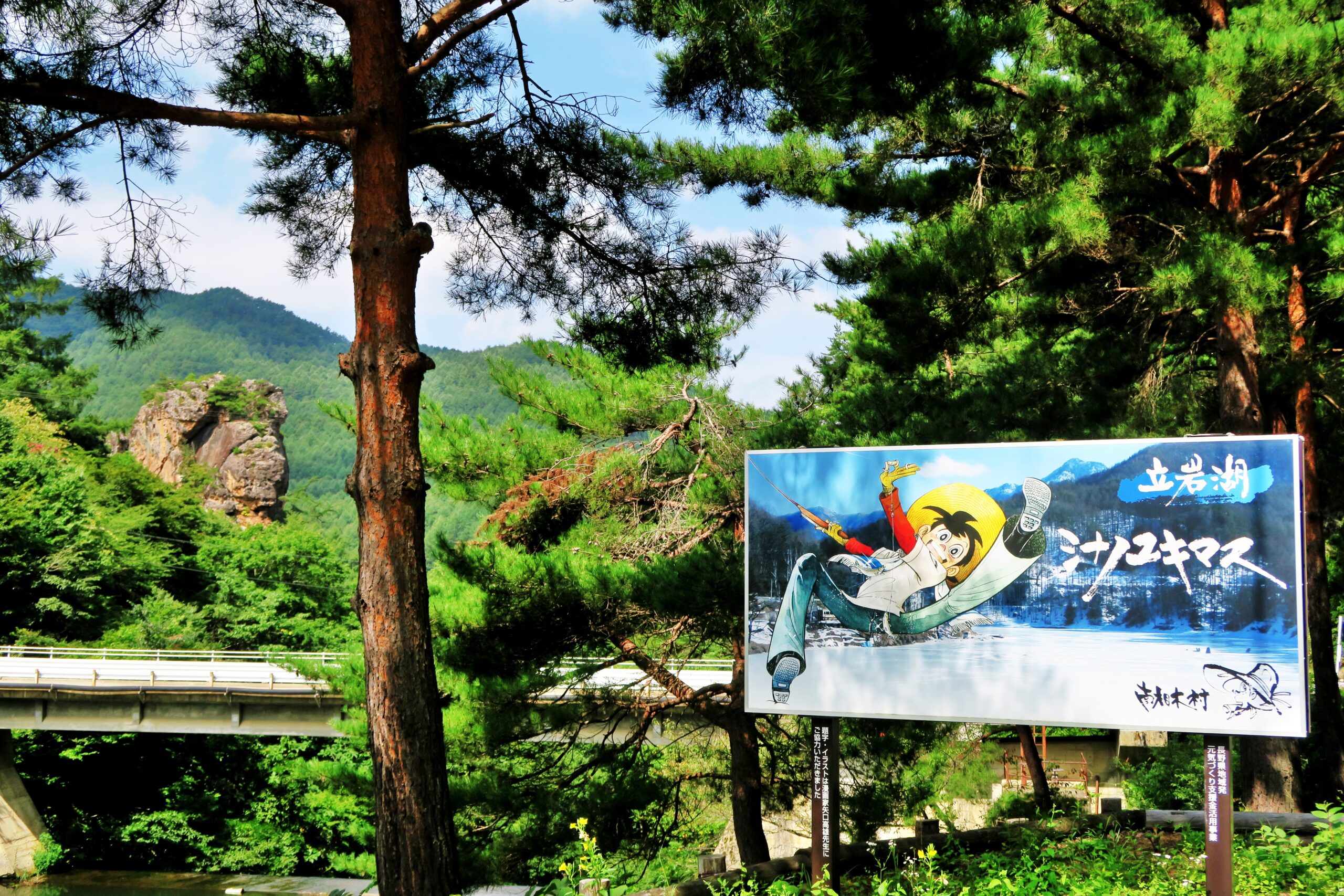立岩のすぐ上流にはカラマツやシラカバがせり出す山中の人造湖「立岩湖」があります。昭和40年(1965)12月に砂防ダムとして完成した湖で年間を通じてシナノユキマスが釣れます。写真の左奥に立岩、手前の立岩湖の看板には『釣り吉三平』が描かれています。