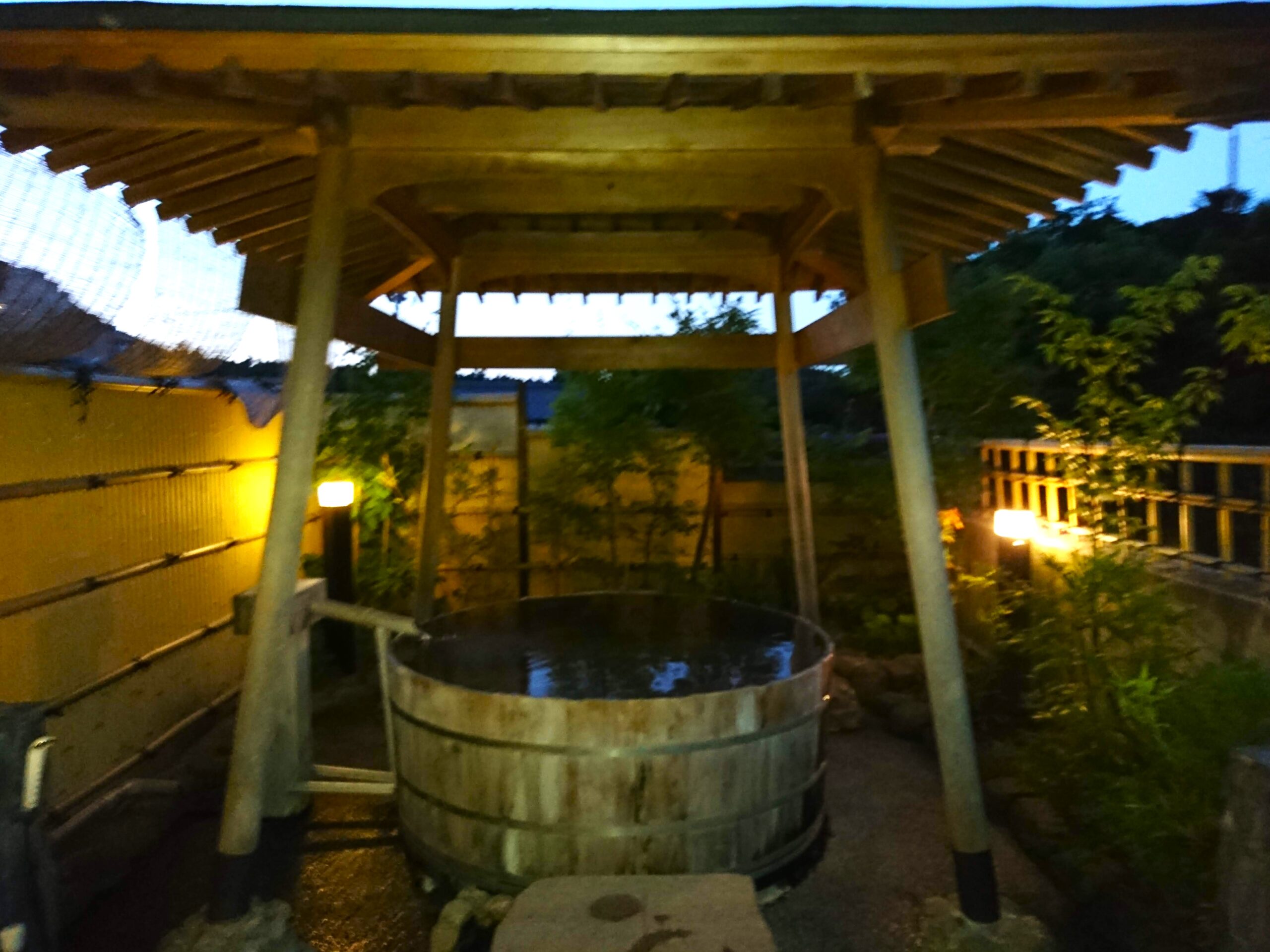 弥彦の町を一望できる「弥彦の湯」では、誰にも邪魔されない贅沢な湯浴み時間を過ごすことができます。夜になるとライトアップされ、飴色に輝く湯船と暮れ行くあかね色の風景が幻想的です。