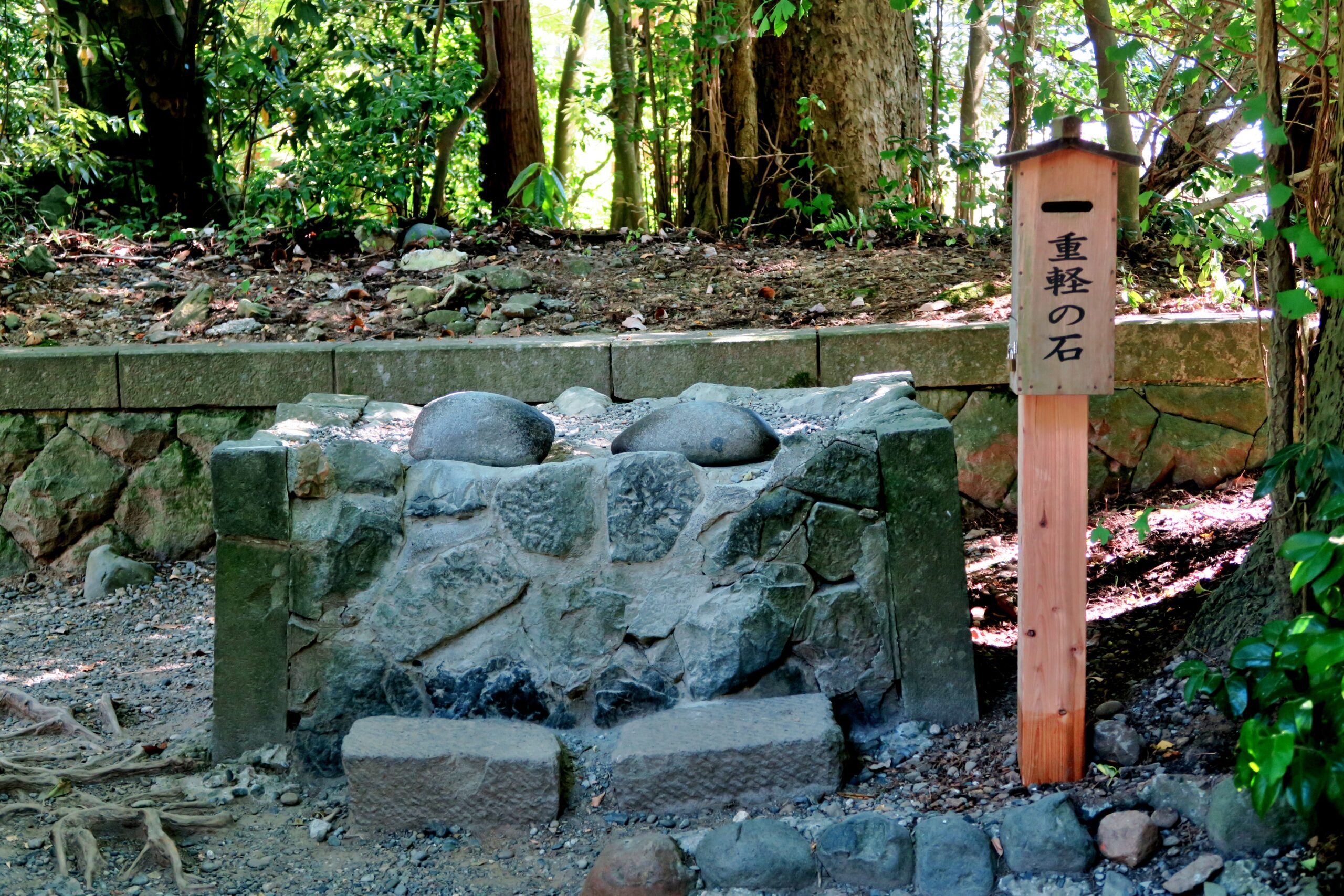 手水舎と神符授与所の間の先に重軽の石「火の玉石」が二つ並んでいます。石を持ち上げて軽く感じると願いが叶うといわれます。どちらも重いです。