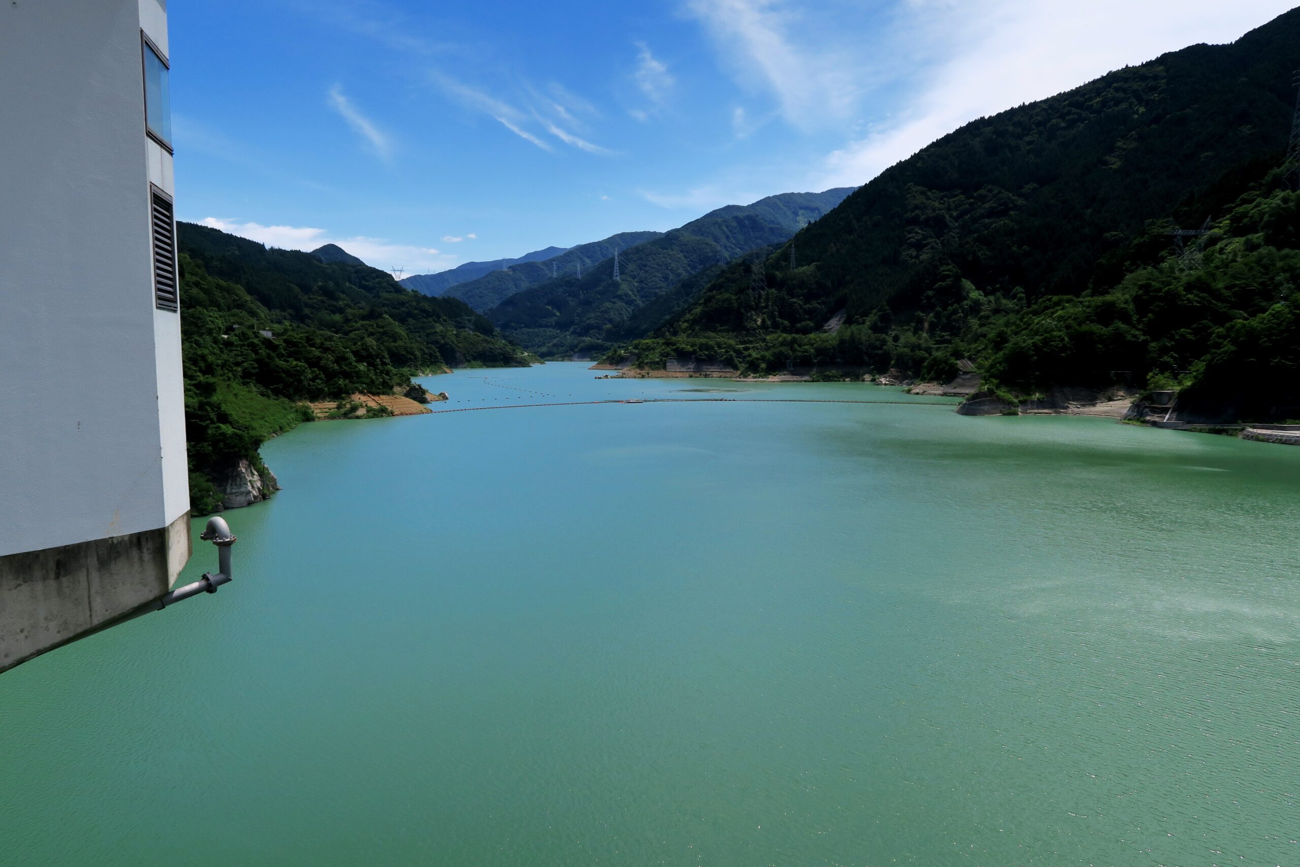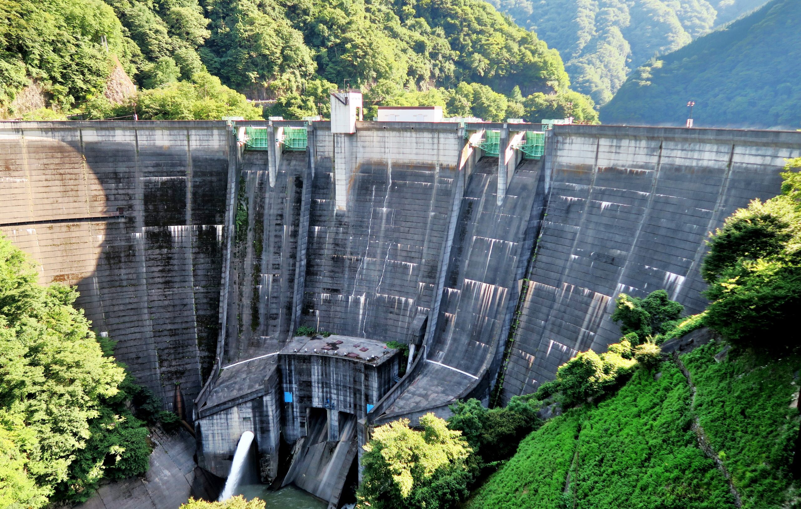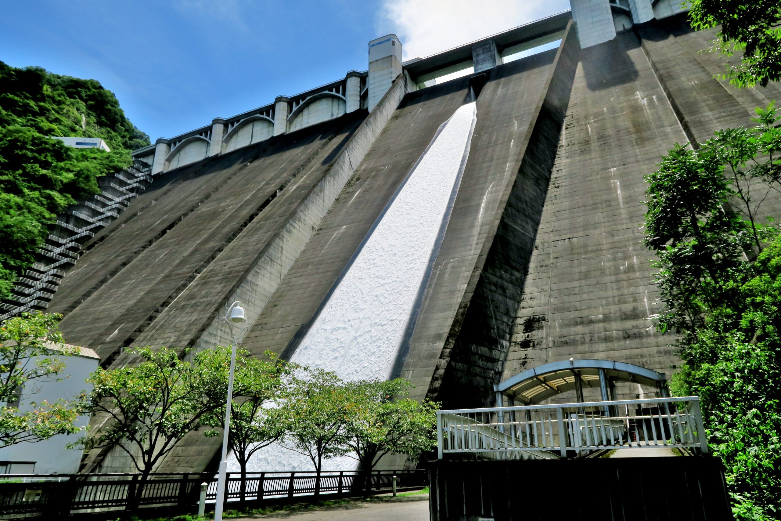 見所はダム堤体が見学できることで高低差132mのエレベーターで一気に降り、下流広場からダムを見上げれば、迫力満点の姿が眺められます、丁度放水時でまるでシルクのように流れる姿はとても美しかったです。