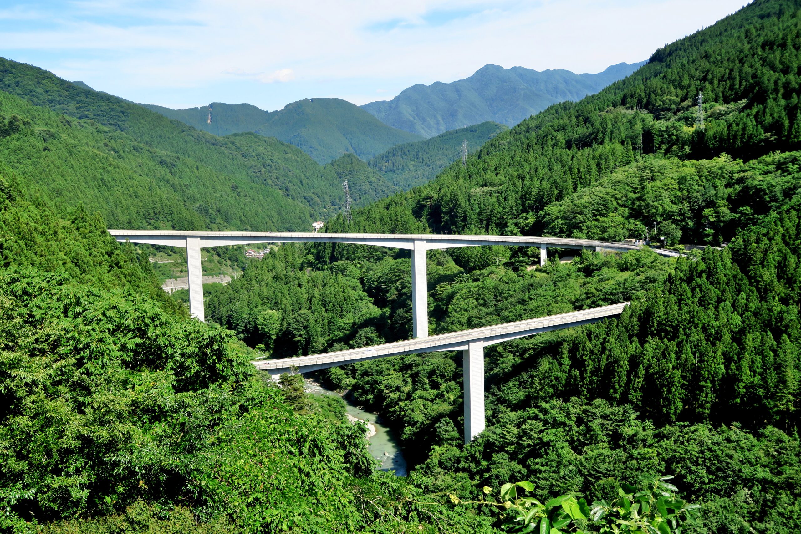 ダムサイト直下流に位置する2橋でできた美しいループ形状の「雷電廿六木(らいでんとどろき)橋」は、国道140号「彩甲斐街道」の一部として建設されました。細く、美しく見えるための橋脚の、陰影、優美さを生むデザインの統一化、景観とマッチした夜間照明の配慮などとにかく美しく見える橋を目指し、平成10年(1998)完成、11年度グッドデザイン賞受賞しています。