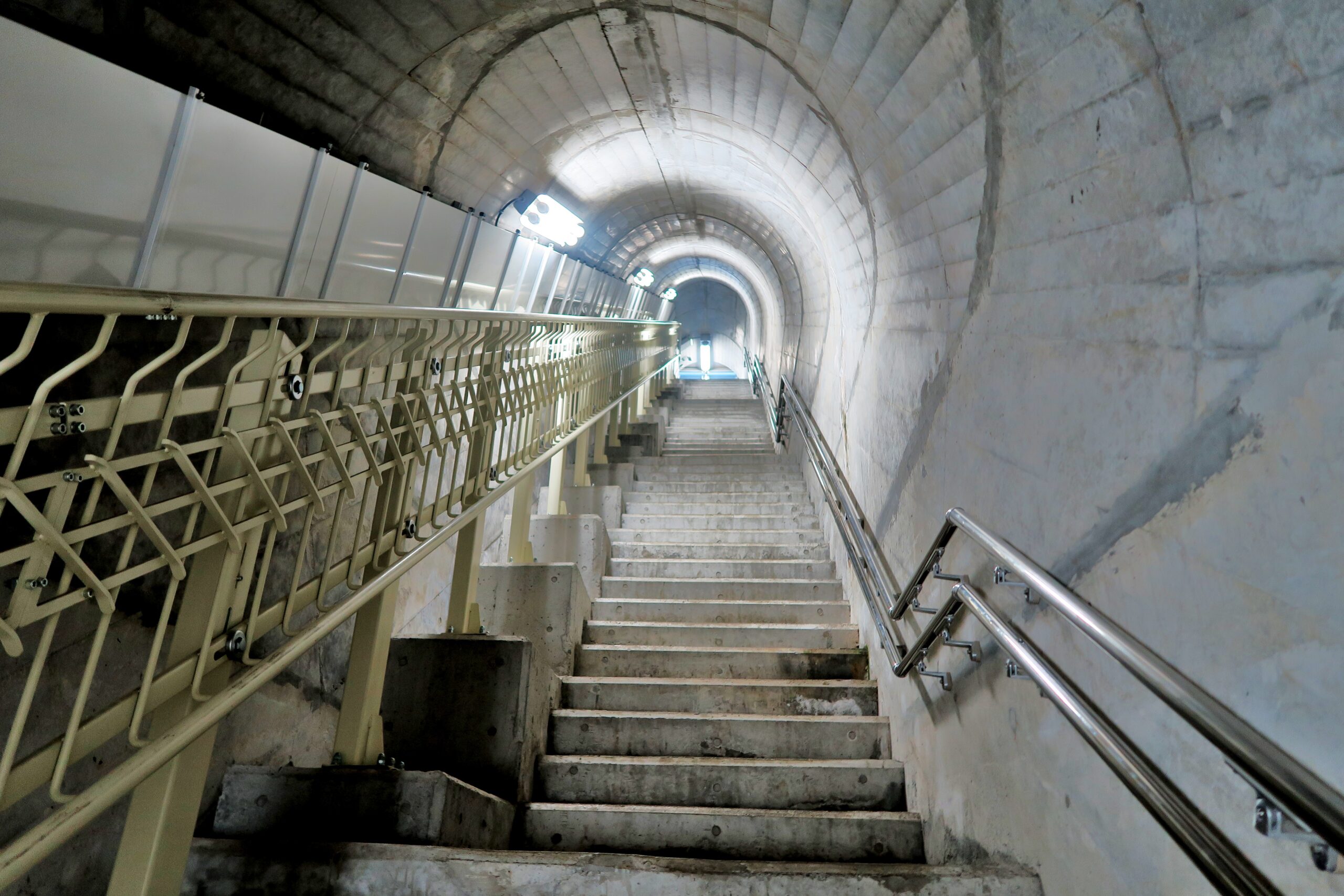 ダム上部の中央付近にダム内部へ降りることができるエレベーターがあり、108m下の下流広場に出れます。