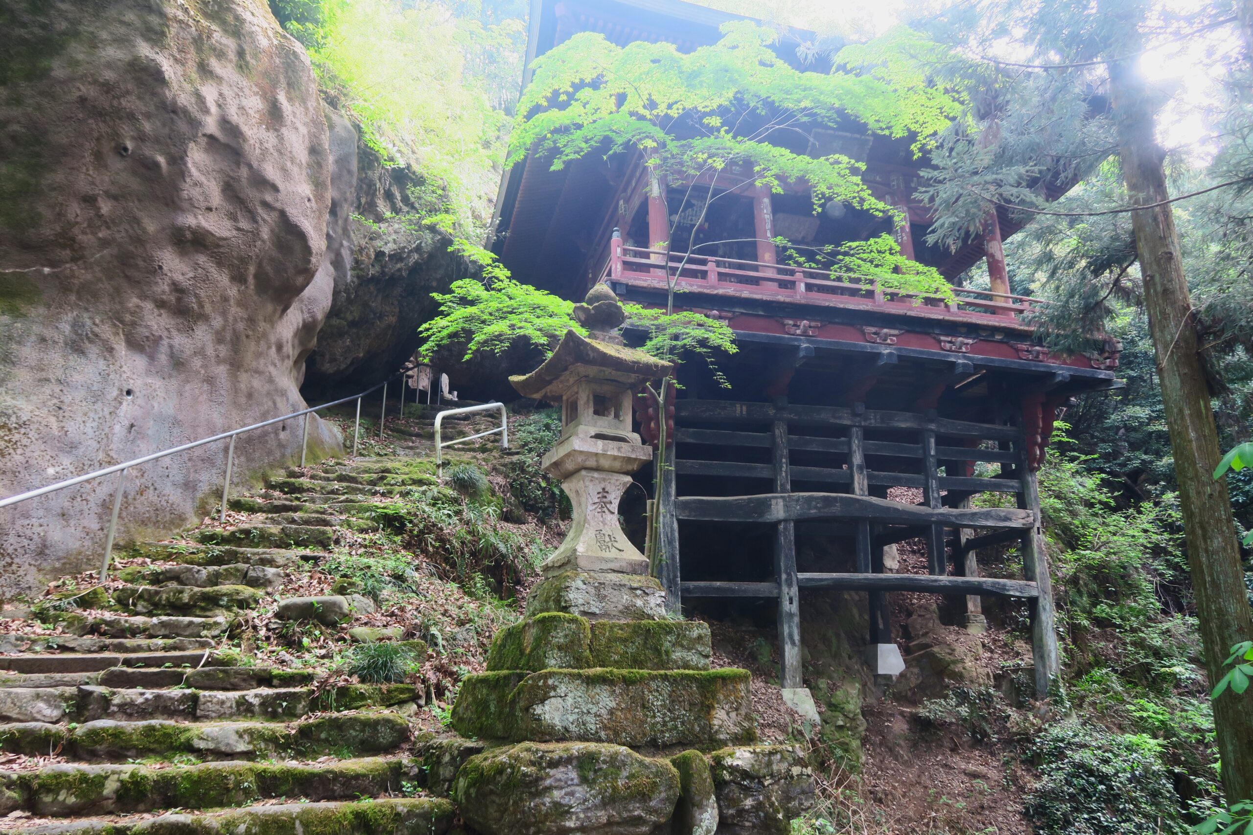 森閑とした山中にあり、霊場らしい厳かな雰囲気が漂います。現在の建物は元久2年(1205)建立。周囲は急峻な地形で岩壁におおわれ、その中腹に三間四面の方形造りに、勾欄をめぐらし唐様の細部をなした美しい堂です。正面谷間に向けての舞台造りは京都の清水寺の舞台を偲ばせます。