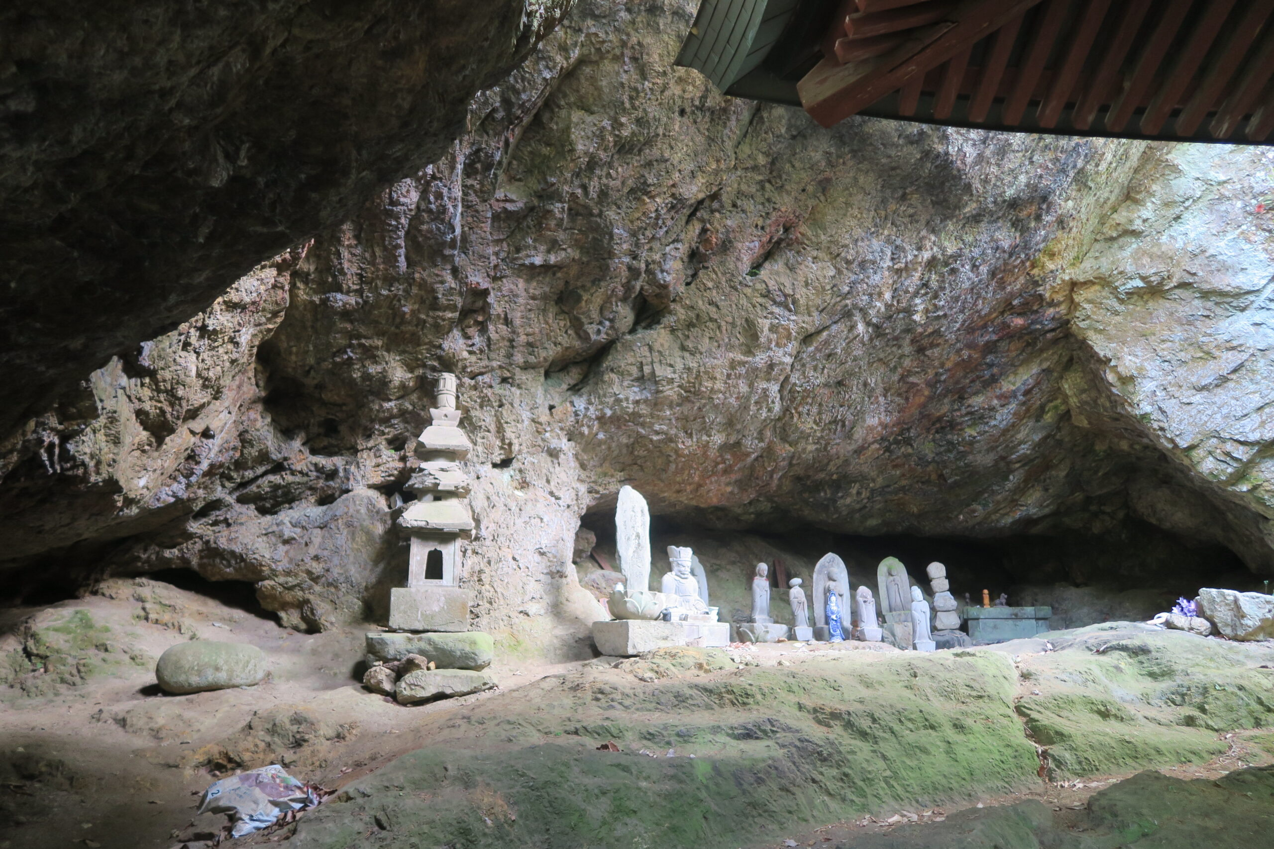 洞内に入るとひんやりとした空気が身体を包みます。全長140m、3分の2が竪穴型で高低差約33m、坑道は迷路のように曲がりくねっています。天井が低いところもあれば、はしごを上る所もあり、通路は狭くなかなかハードな探索になります。鍾乳石、石柱、石筍などが見られる洞内は広くはないが、その分、この自然の造形が昔から「胎内くぐり」の霊場として信仰されてきたことを実感できます。「弘法大師の後姿」「昇り龍の背」などと名付けられた鍾乳石が見ものですが、洞内は撮影禁止とのことで残念です。鍾乳洞を出ると、額に汗が浮かんでいました。