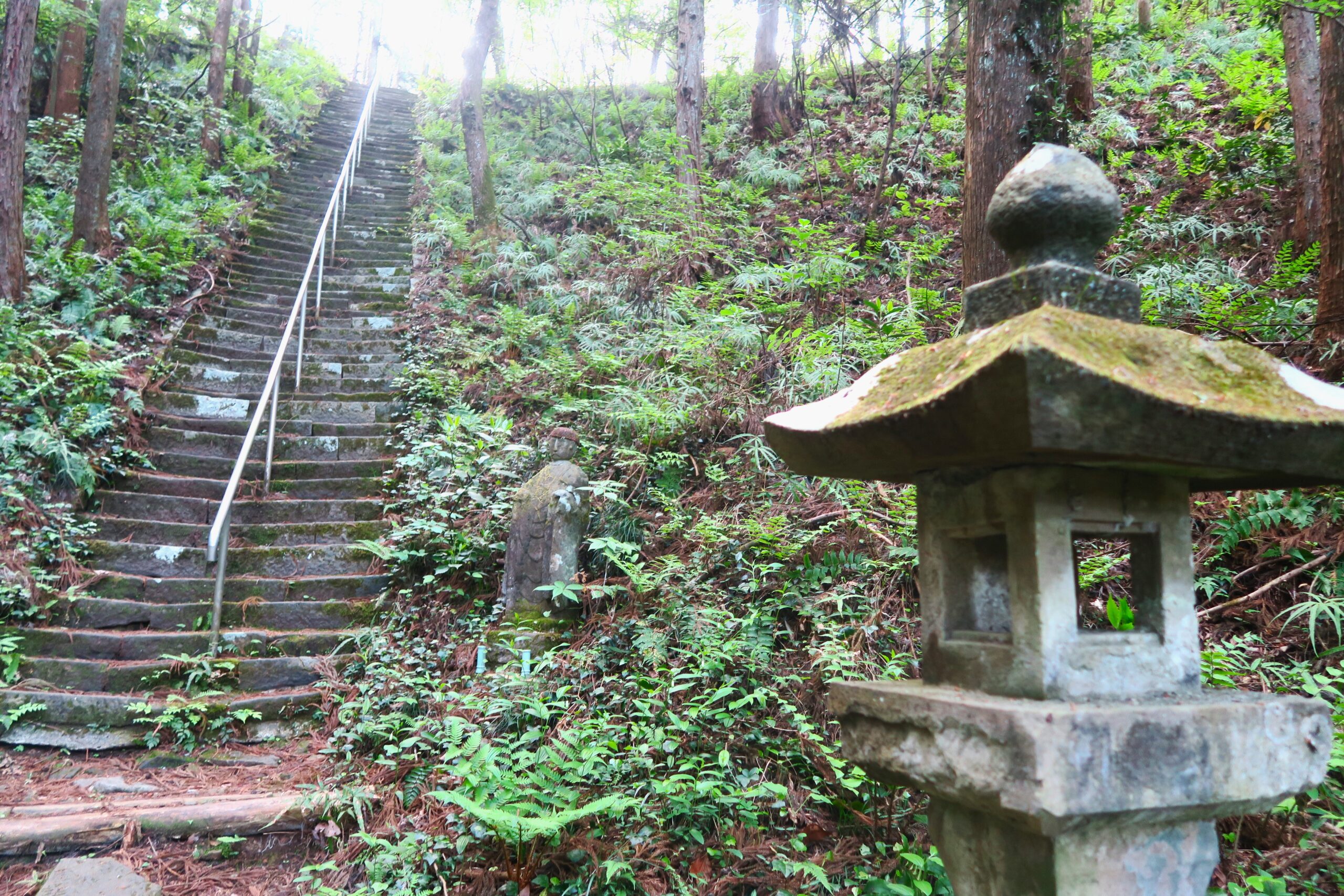 弘法大師が21日間護摩供を修行した地に、平安時代の僧、恵心僧都が里人と堂宇を建立し、八寸七分の聖観音立像を彫り安置したといいます。これが圓融寺の奥の院にあたる岩井堂で、寺より南へ約1.5km、徒歩では山道を30分ほど登ります。参道は昭和電工の工場内を横切るため、守衛さんに参拝であることを告げ、敷地内を通らせてもらいます。琴平神社の鳥居の右脇(駐車場あり)から約300段の苔むした石段を上った先に岩井堂が立っています。石段の歪みに多くの人の巡礼の歴史を感じます。