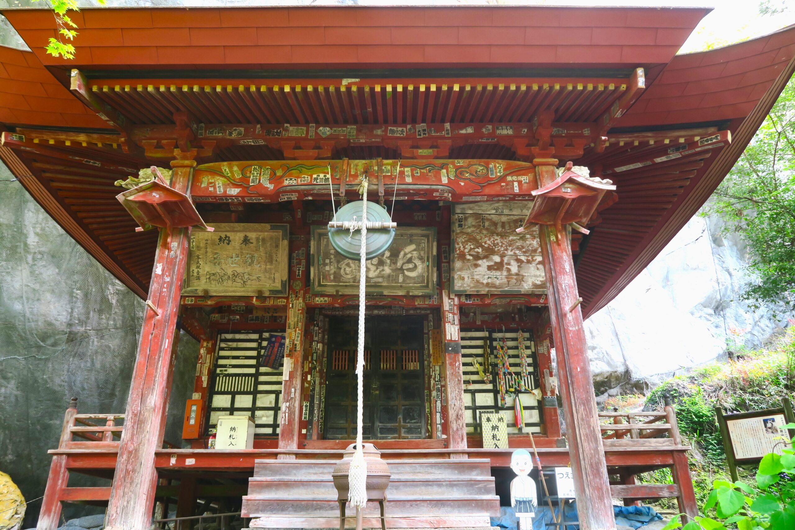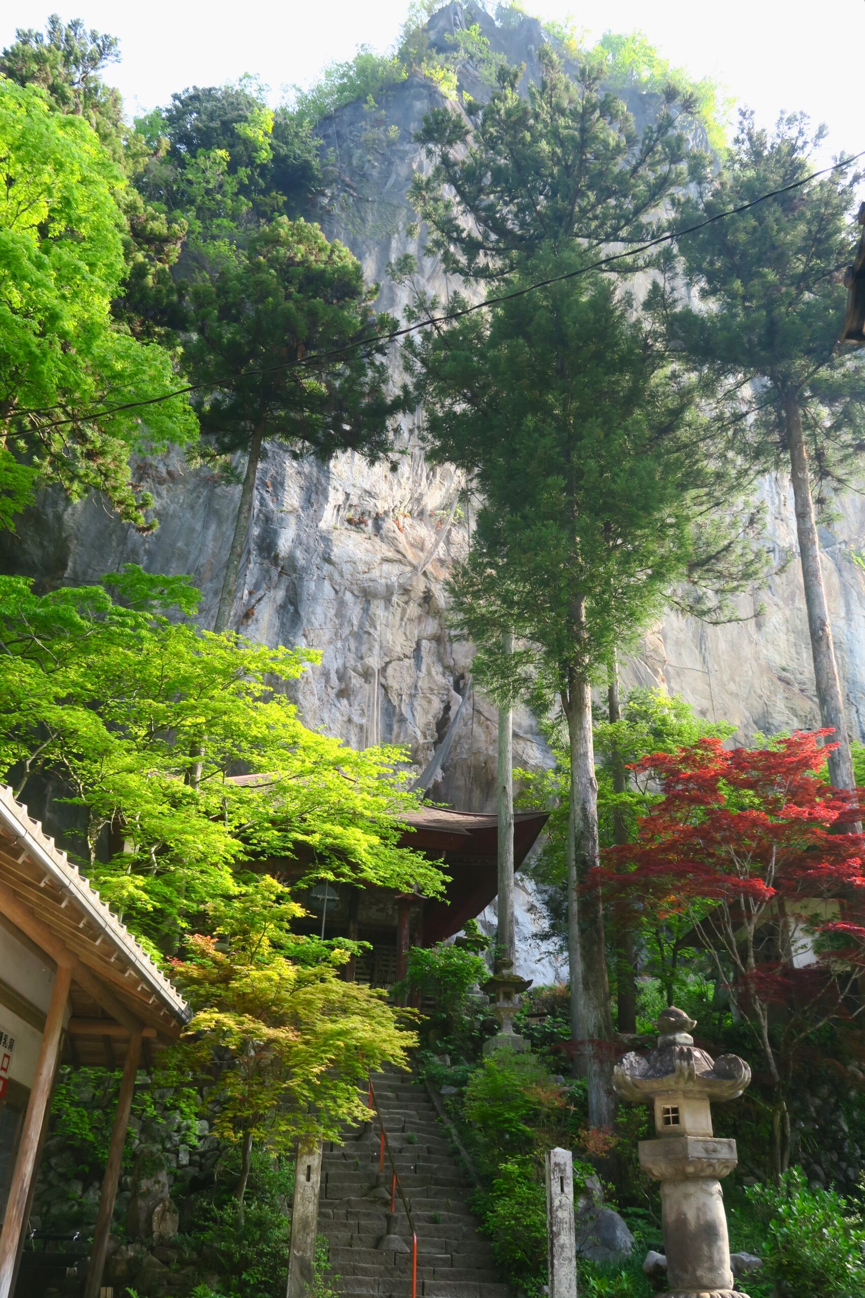 森が深くなった頃、国道を離れて県道73号へ、さらにすれ違い不可能な細道を荒川の支流、橋立川に沿った道を進み28番札所石龍山橋立堂に向かいます。この道は武甲山への裏参道(西参道)で、坂道と石段を上ると、高さ約75mの切り立った岩壁が目の前に現れて息をのみます。秩父のシンボル武甲山の西麓にあり、この巨大な岩壁は武甲山と同じく石灰岩でできています。岩壁の下に佇む、江戸中期の建立の朱塗りの観音堂が目を引きます。