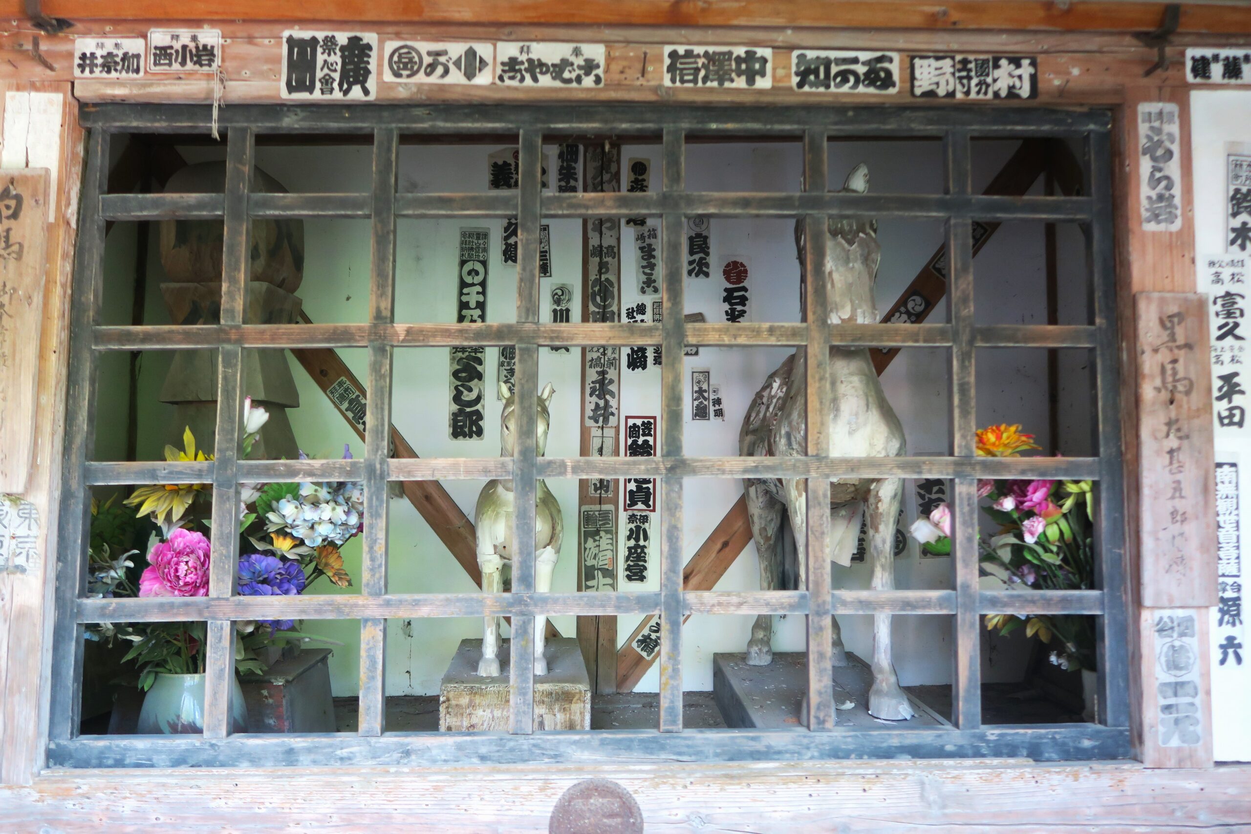 大岩壁を背にした観音堂は、三間四面の流れ向拝を付した方形銅板葺で、宝永4年(1707)の建立といいます。観音堂の軒下には「観音霊験記」の扁額のほかに、馬の群れが遊ぶさまが描かれた絵馬が左右に掲げられています。