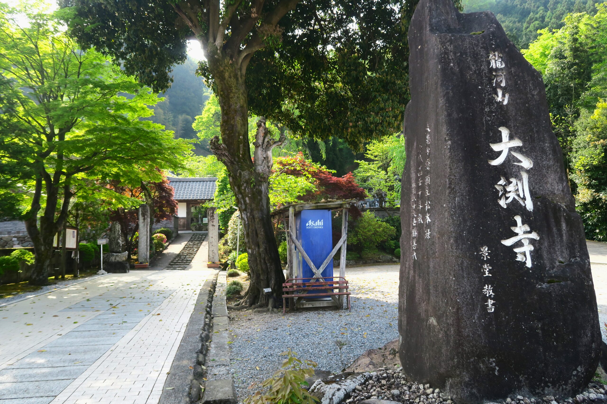 圓融寺から住宅街の中、里道を進むと、深縁に覆われた山を背にした次の27番札所・龍河山大渕寺に。二十七番目と記された「札所碑」の右横の石柱門から石段の参道を進むと、簡素な棟門形式の山門があります。曹洞宗の寺院で明治・大正と二度にわたる大火で堂宇を焼失し、山門から少し登ったところに平成8年(1996)に三間四面、方形屋根の「月影堂」と呼ばれる観音堂が再建されました。