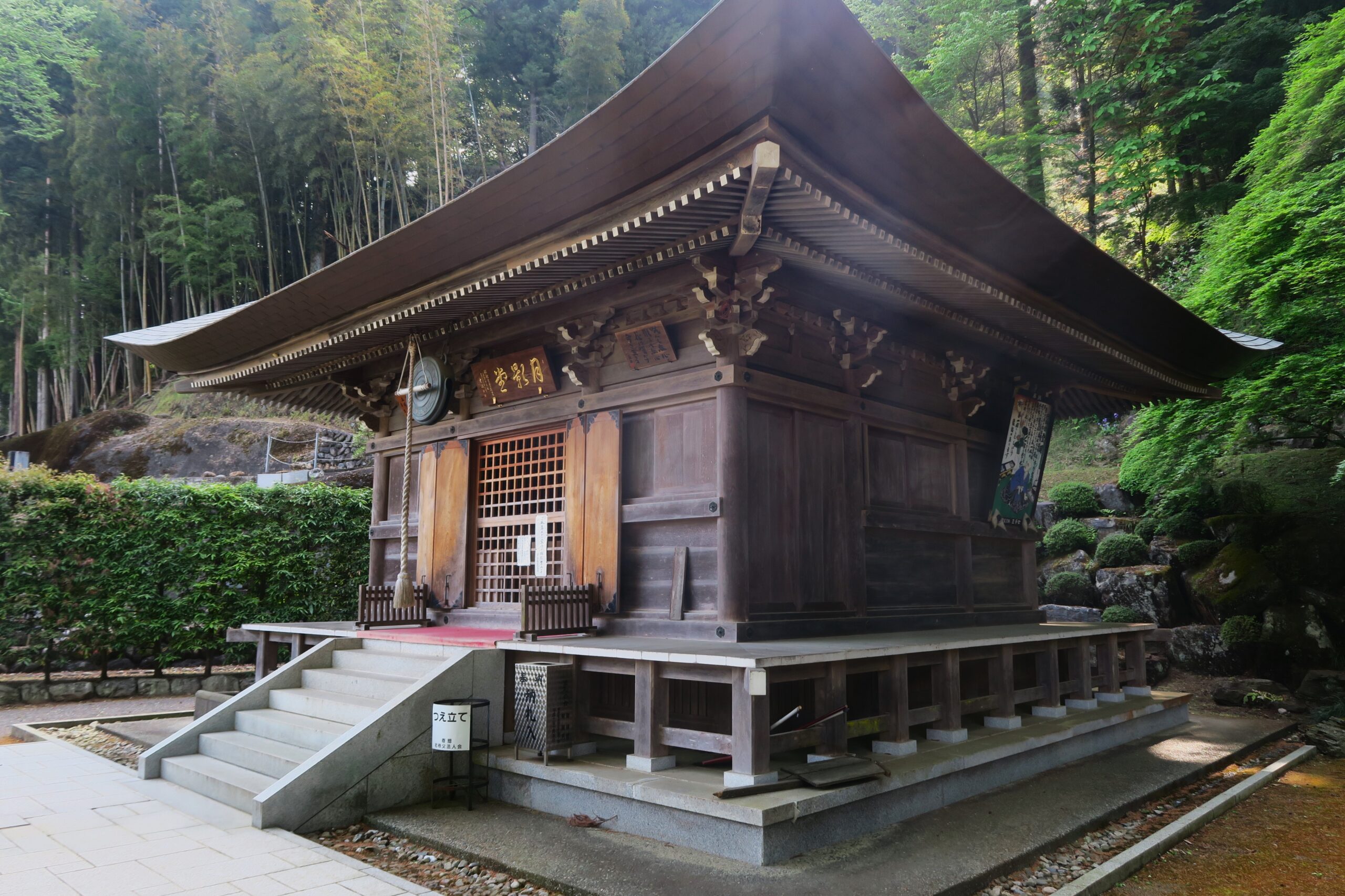 臨済宗の禅寺で本堂は江戸時代中期の建造物。山を背にして間口が8間、奥行きは5間で、間口が広く奥行きは浅いものの堂々とした建物です。外部には高欄のない回廊が付けらています。安置されている本尊の聖観音像はかつて岩井堂に祀らていたものです。また江戸時代中期の狩野派の絵師・鳥山石燕の「景清牢破り」の絵馬を保存しています。浮世絵師としても活躍した人物で、縦86.5cm、横58cm、厚さ2.5cmの桧板3枚に歌舞伎の名場面の一つである「景清のろう破り」と雲上から見守る白衣の観音を描いています。