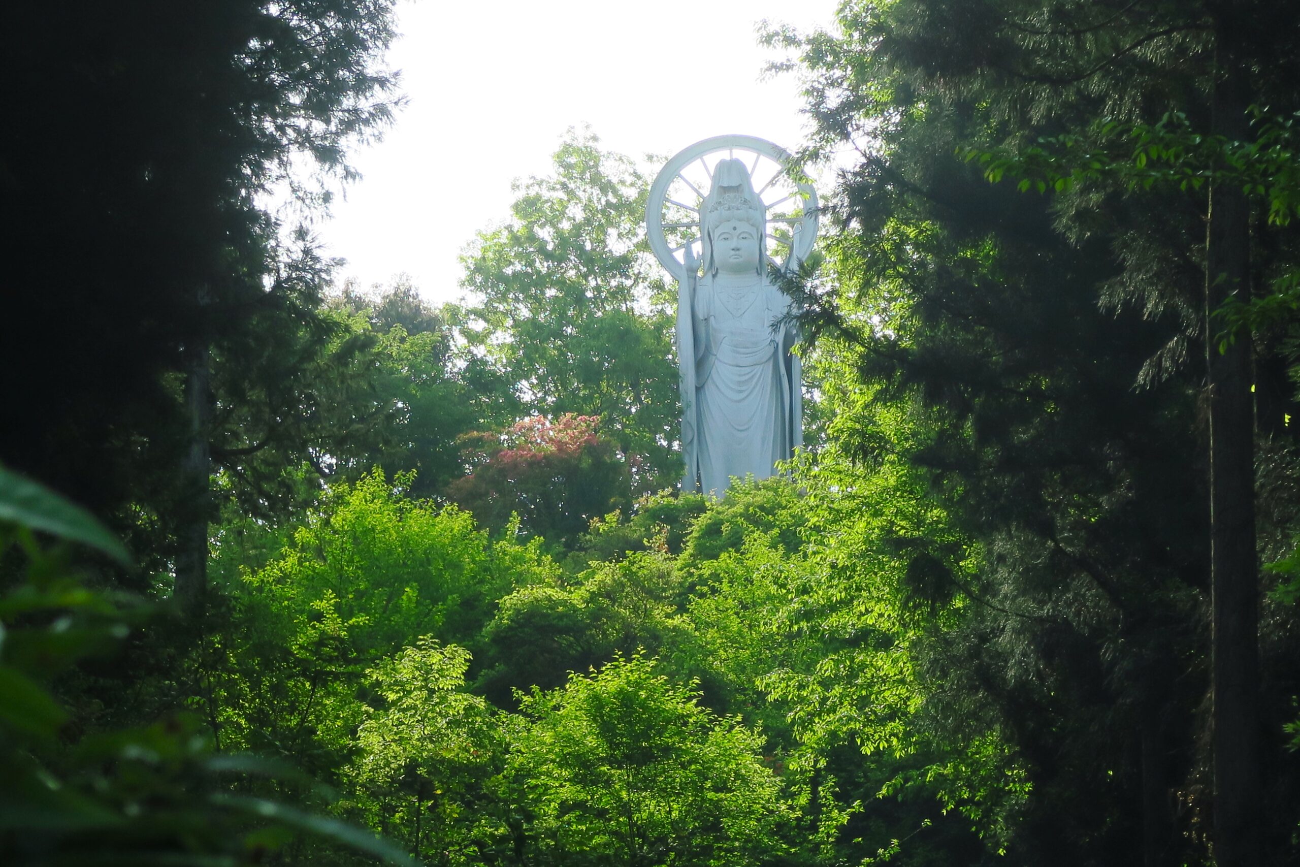 頂上近くには昭和10年(1935)に造立された高さ約15mの護国観音像があります。手に宝剣を持った珍しい観音像で、高崎観音、大船観音とならび関東三大観音と称されます。三門からも見上げることができます。