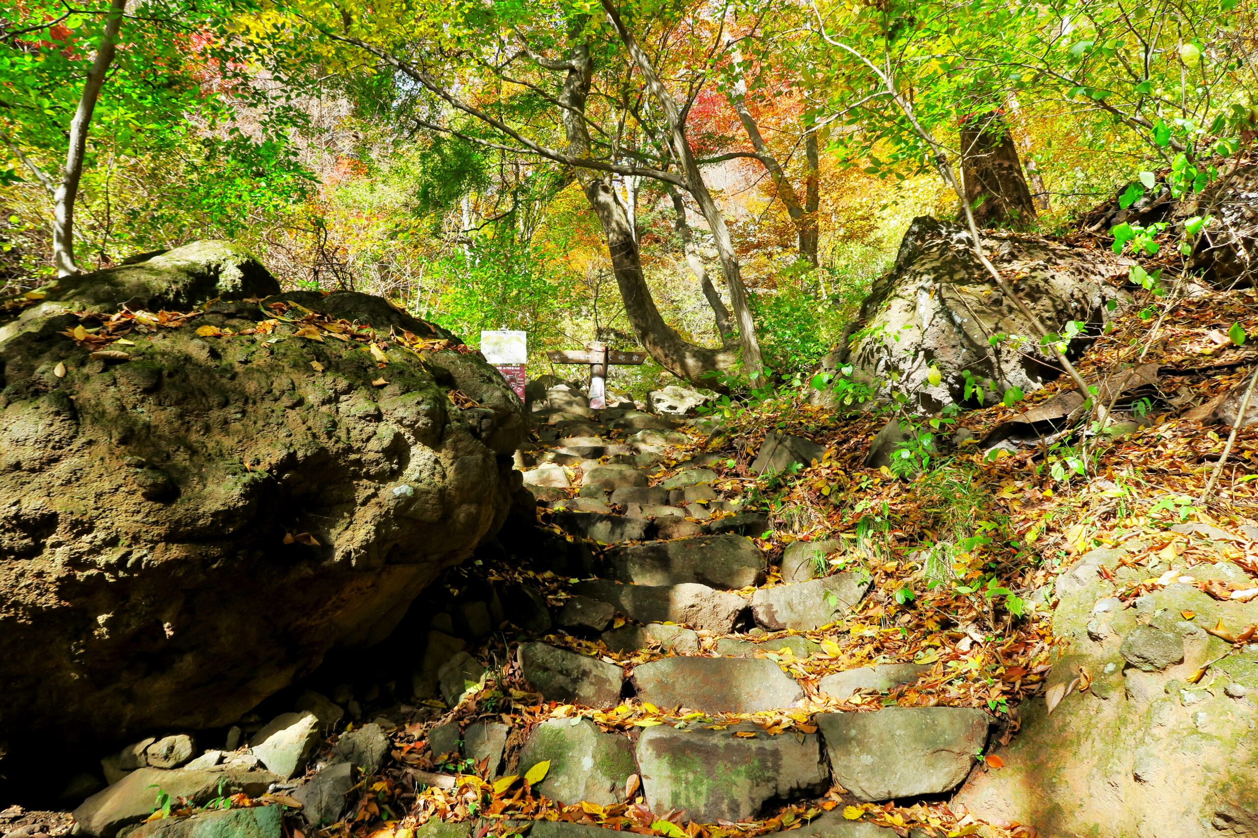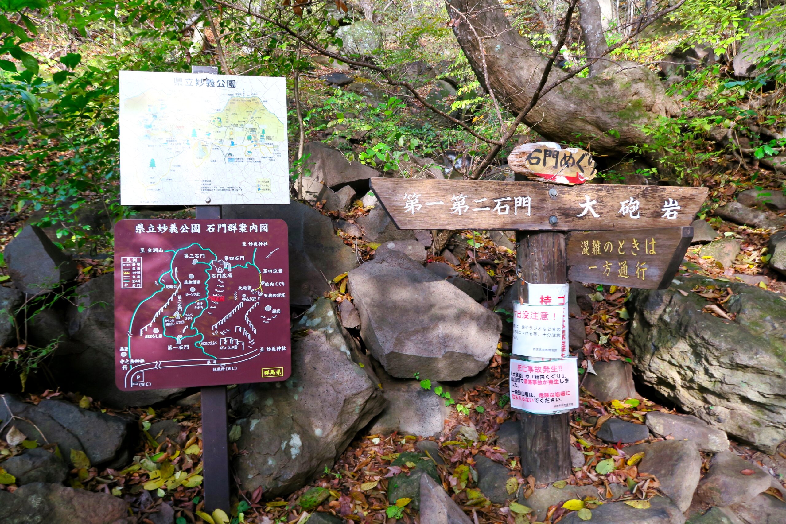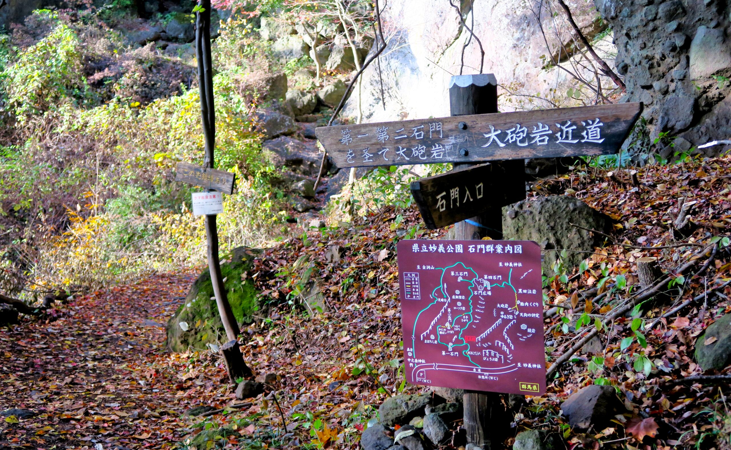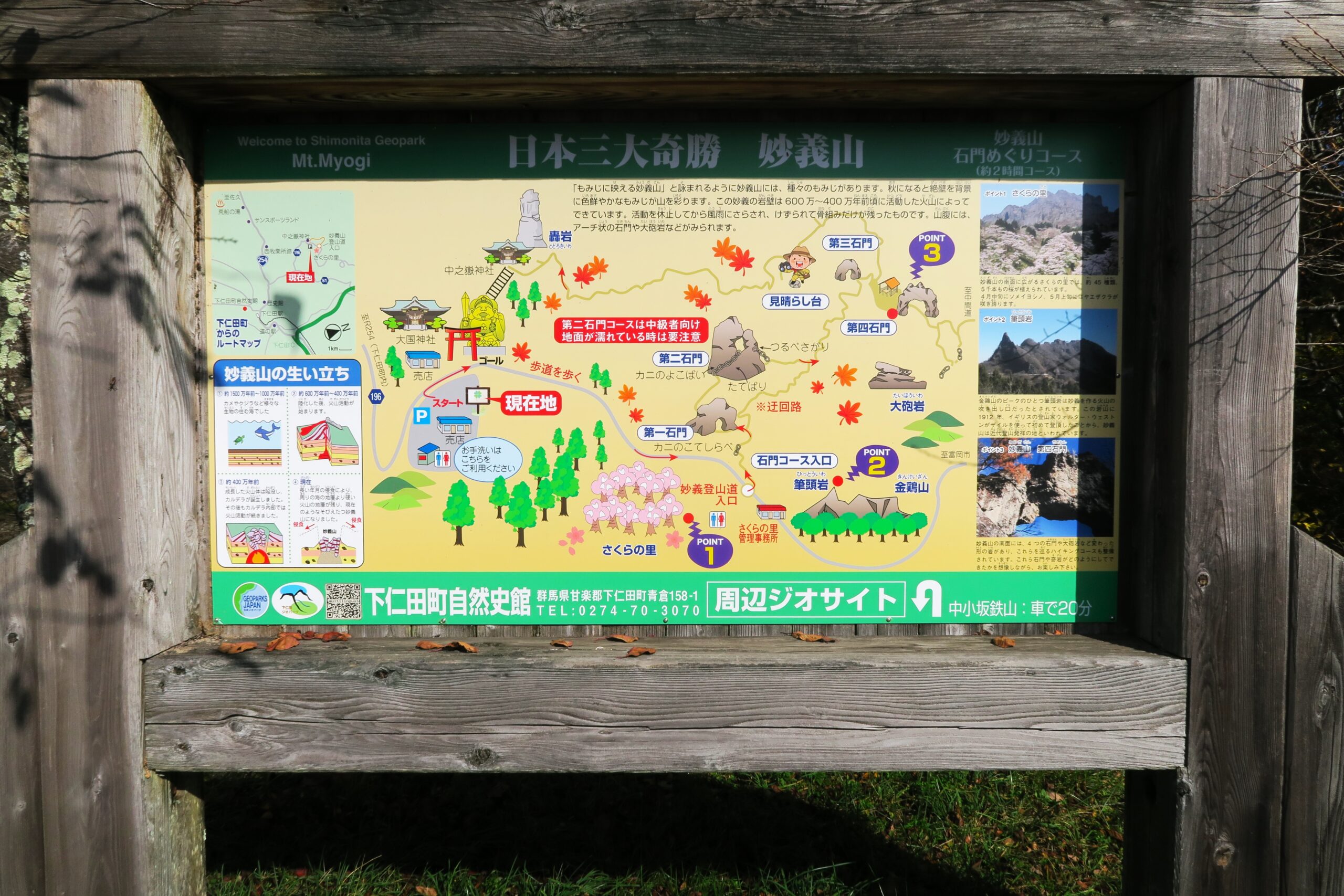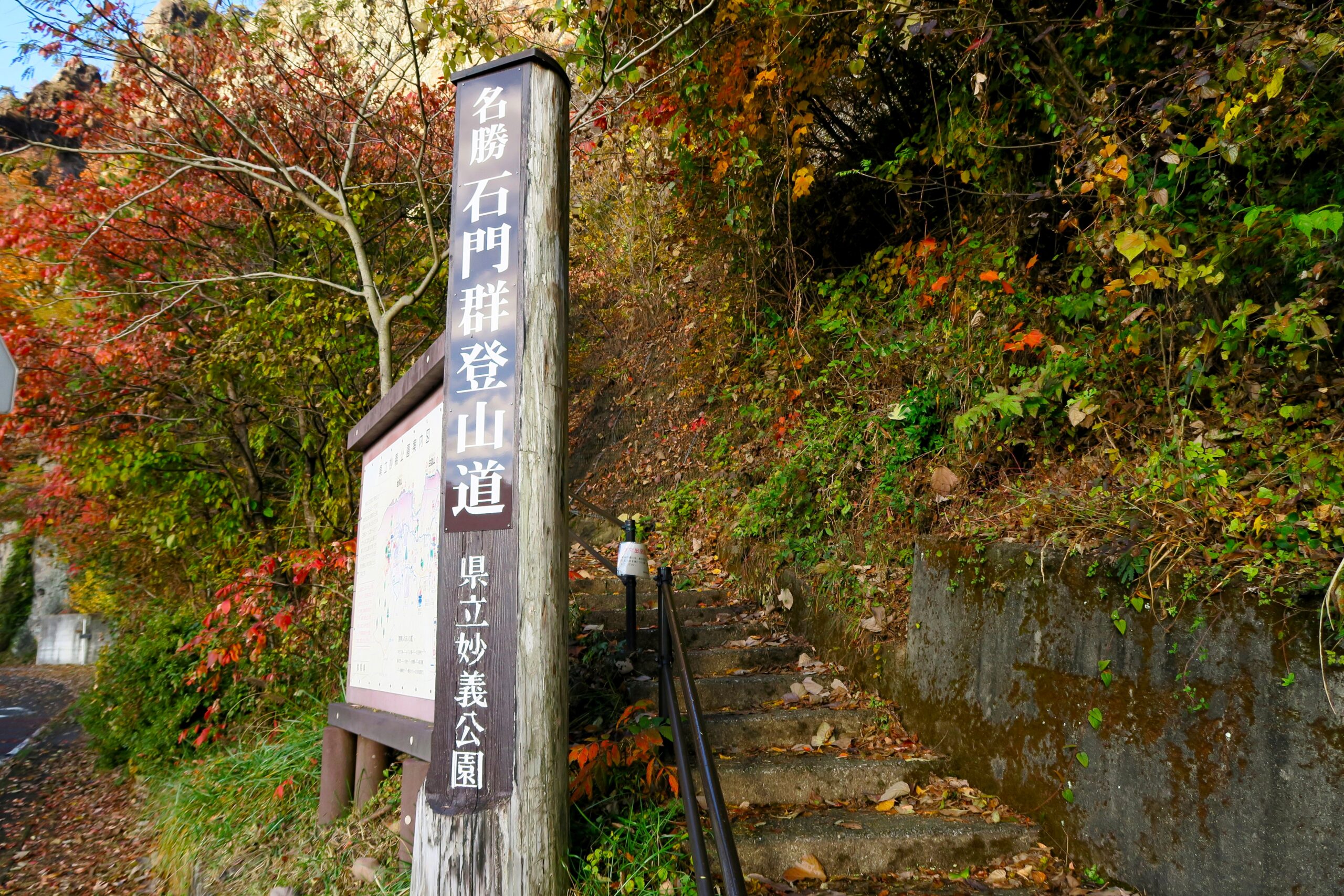 駐車場から400m、5分ほど県道196号を下った左手(山側)先に「名勝 石門群登山道」と書かれた階段の入口が見えてきます。この妙義登山道入口から本格的な登山道へと出発します。(入口前にあるさくらの里駐車場は9時から開門になります) 道路沿いでわかりやすくここから約2時間のアドベンチャーへ出発です。案内図で石門の位置をチェックしておきます。