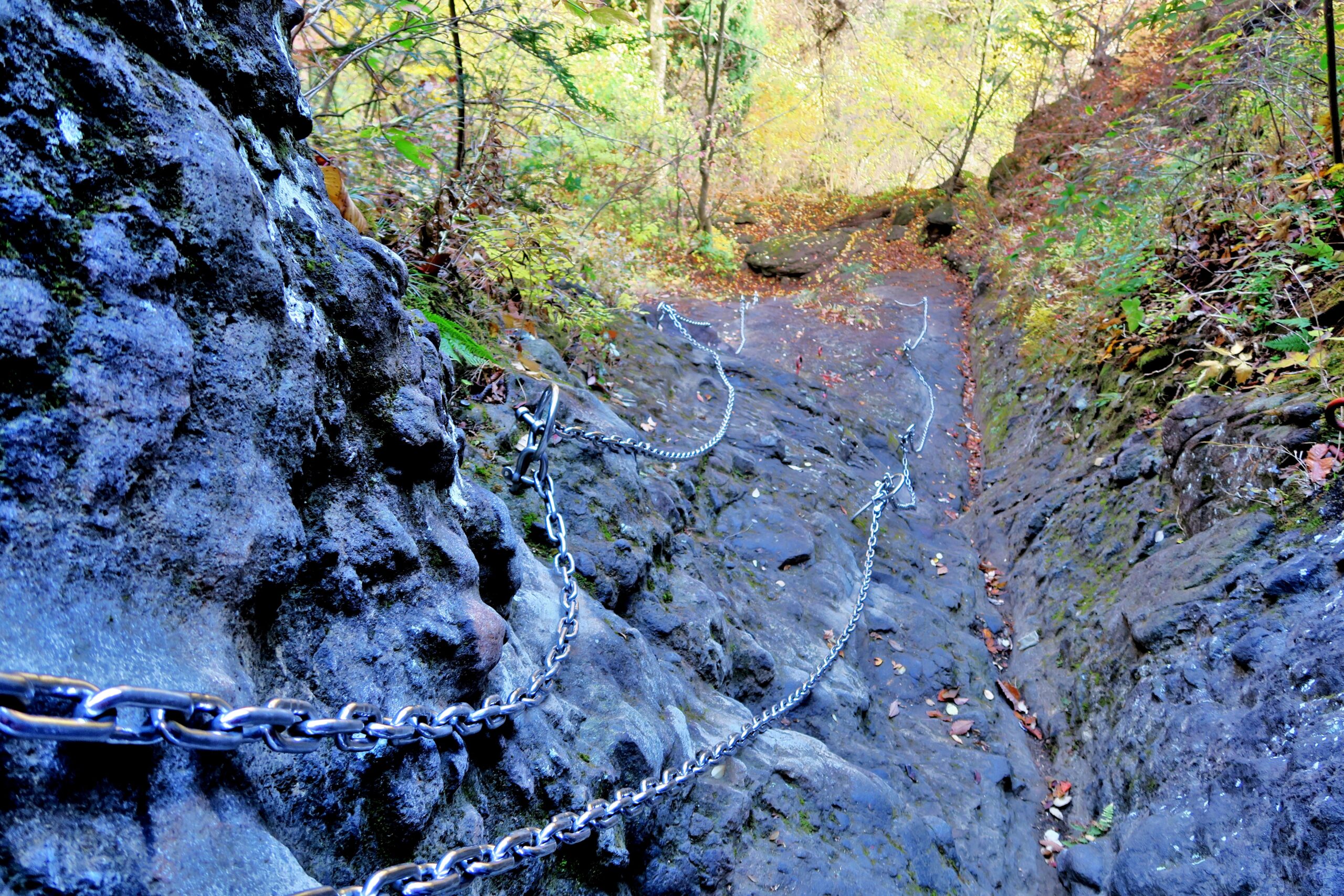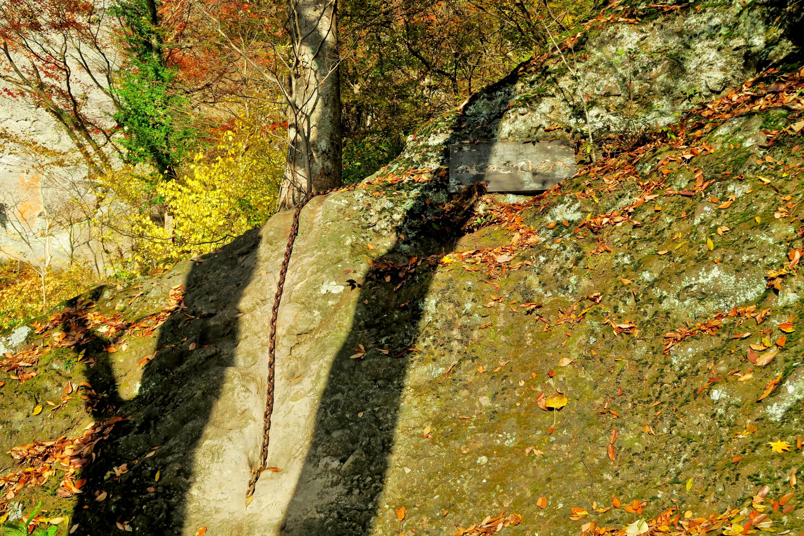 さらに「片手さがり」をおります。写真だとわかりづらいですが結構な高さがありスリリングです。足の置場が狭い岩の階段があるので片手だけで下れそうですが実際はしっかりと両手で鎖を持って足場を確保しながら慎重に下りていきます。