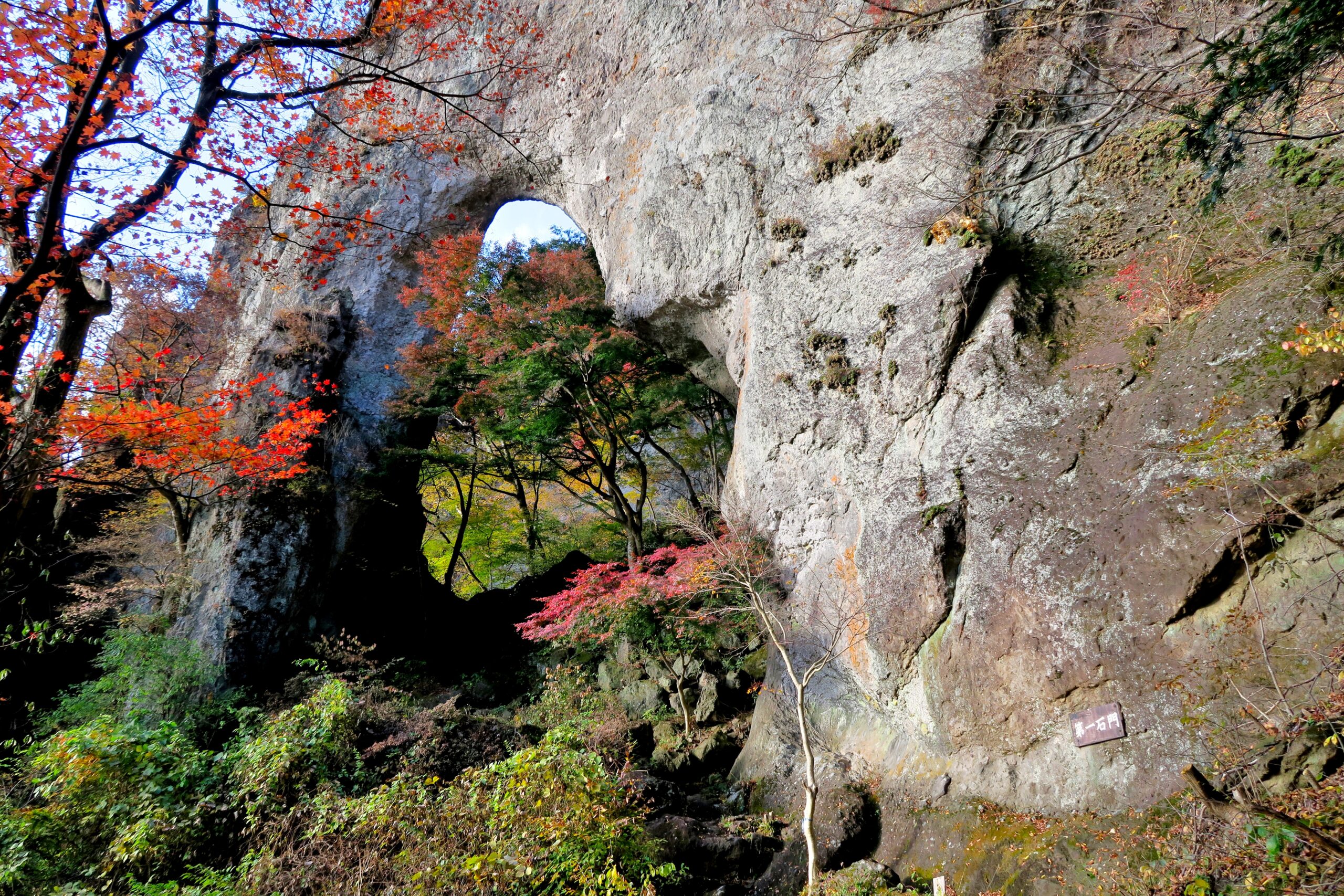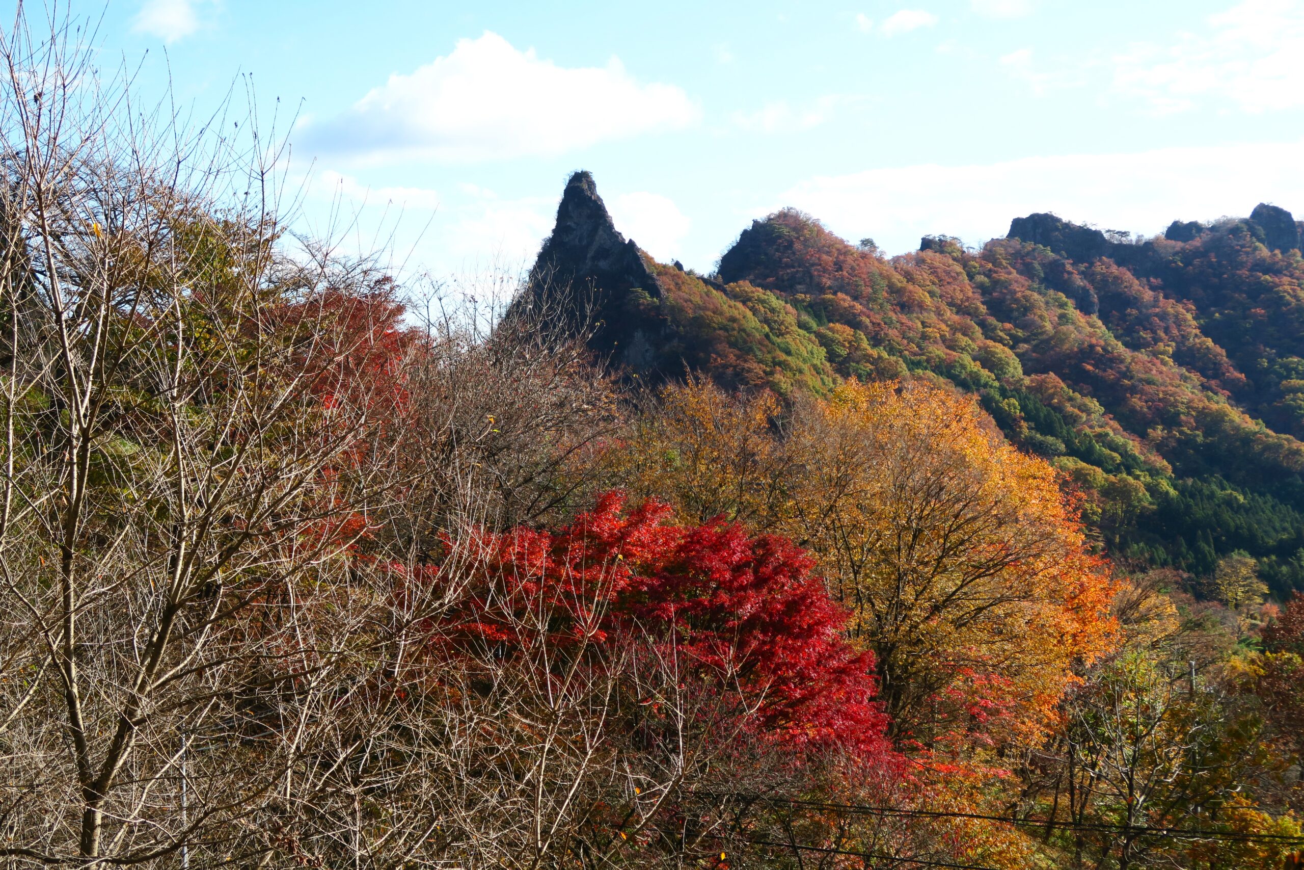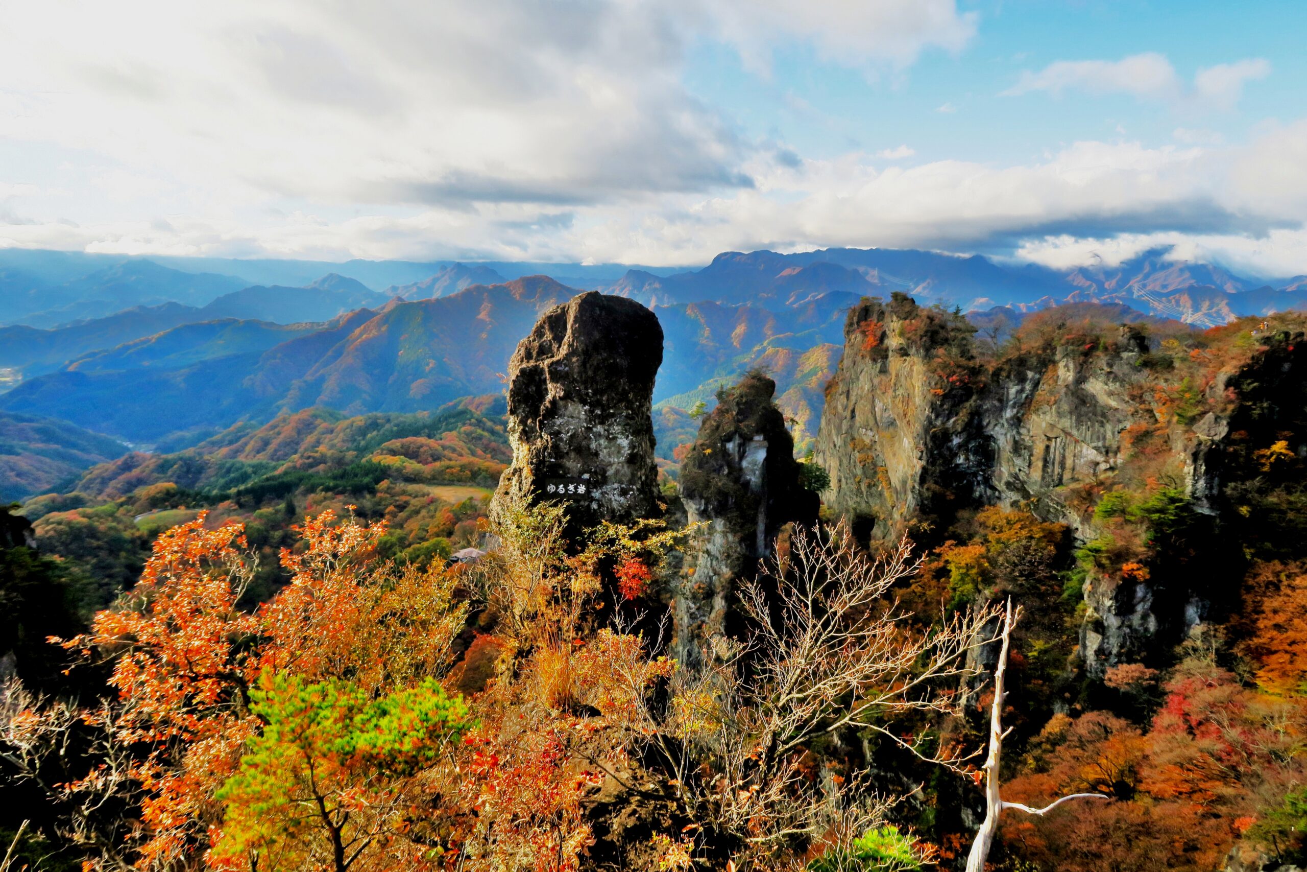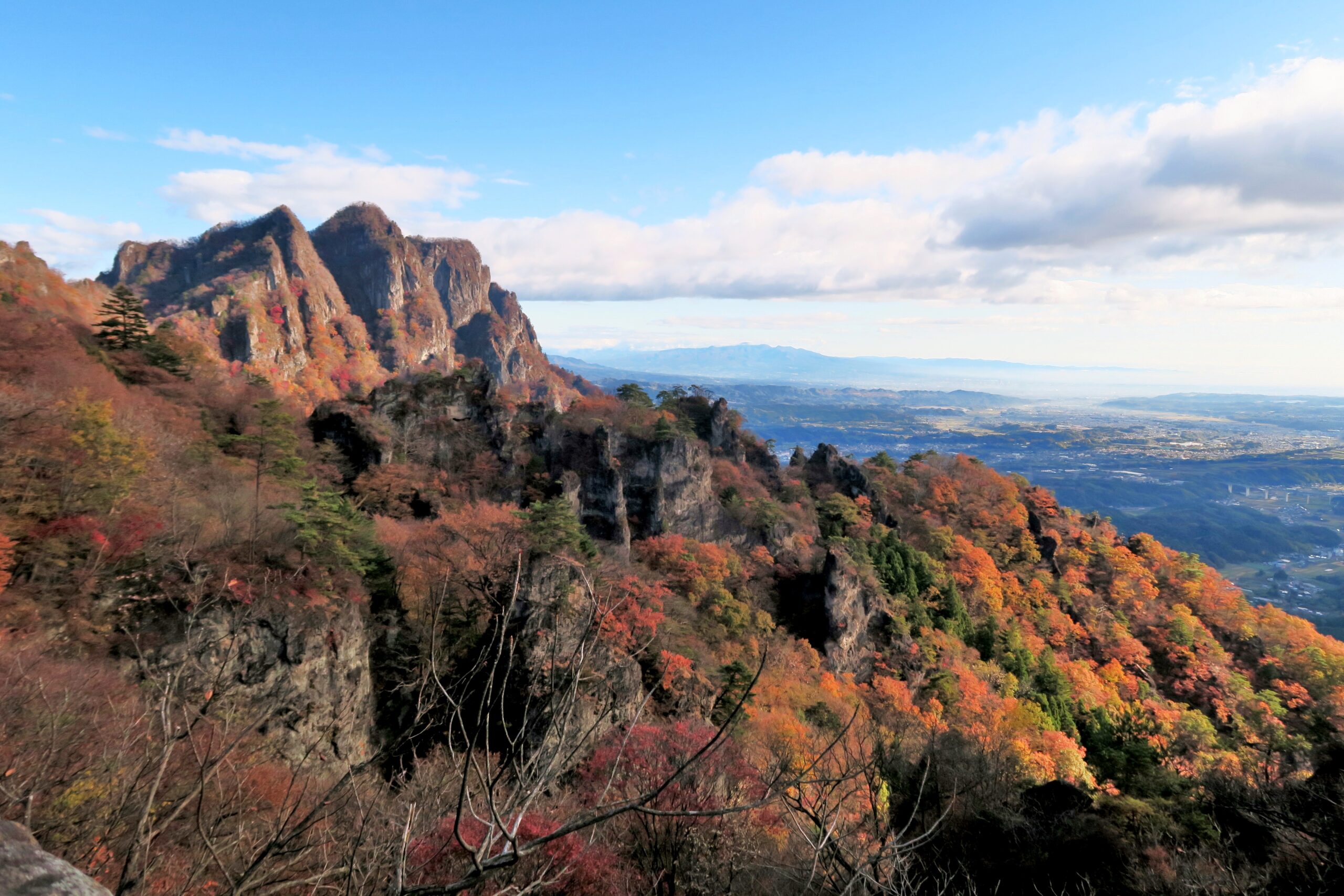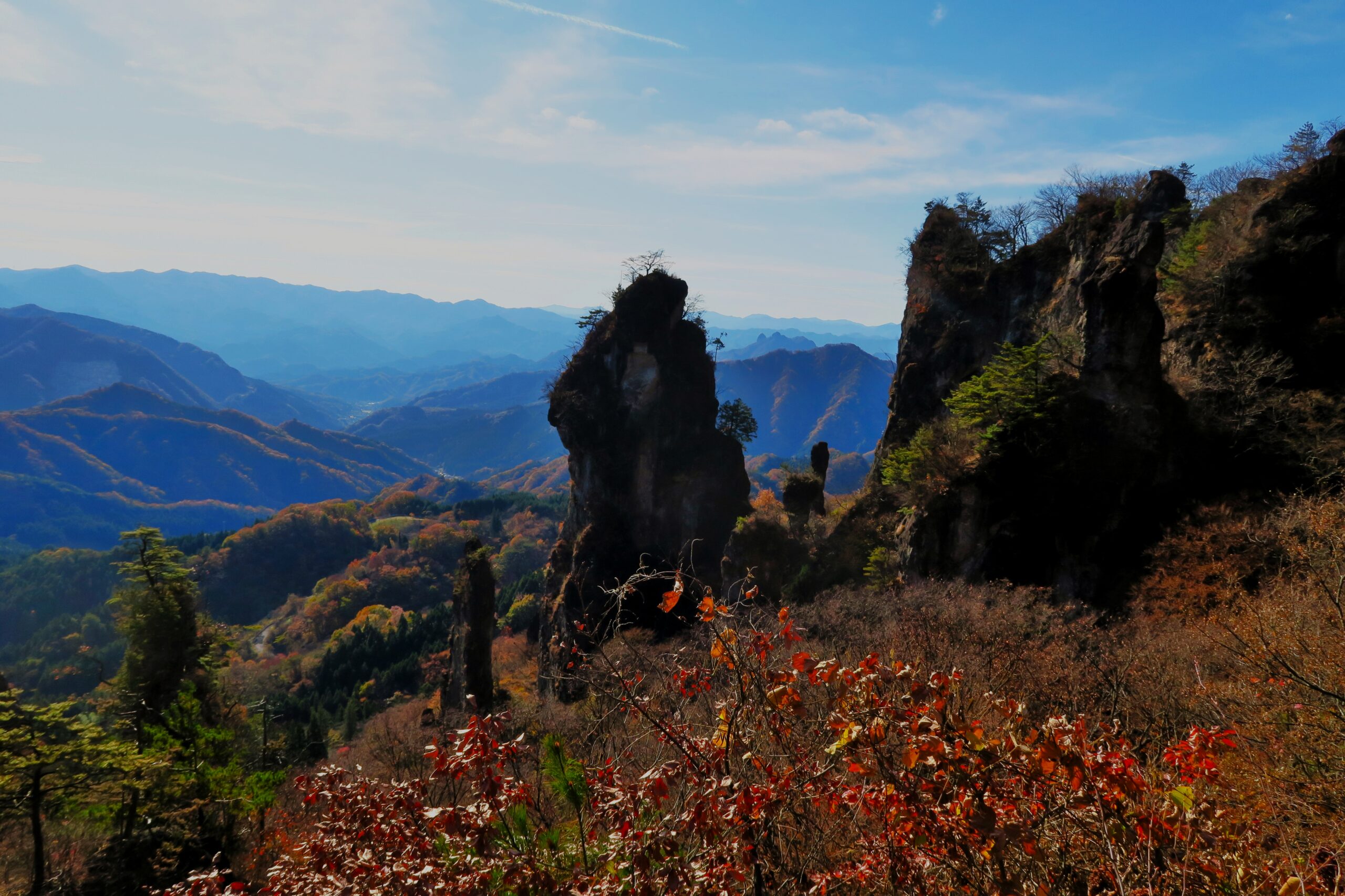 群馬県を代表する山といえば「上毛三山」すなわち赤城山、榛名山、そして群馬県南西部、昔は西上州と呼ばれた山域のシンボルともいえる妙義山です。白雲山、金洞山、金鶏山の三山からなり、過去に火山活動の記録はないものの山体は火砕岩の一種のもろく浸食されやすい凝灰角礫岩で、山容は非常に厳しい。裾野の広がりが少なく、そそり立つ峰々の鋭く尖ったゴツゴツとした山姿のみならず、大絶壁や石門群、大砲岩等、奇岩奇石が林立するのが特徴で、日本三大奇勝(耶馬渓・寒霞渓・妙義山)の一つとされ、“日本のドロミテ”とも呼ばれる大自然の造形美は見事です。三千年前縄文人が神の山と崇めた信仰の山で、まるで中国の水墨画のような姿と深い森、そして自然の営みを感じさせる妙義山の代表的なモニュメント「石門」があり、岩肌がはっきり見える姿に圧倒されます。