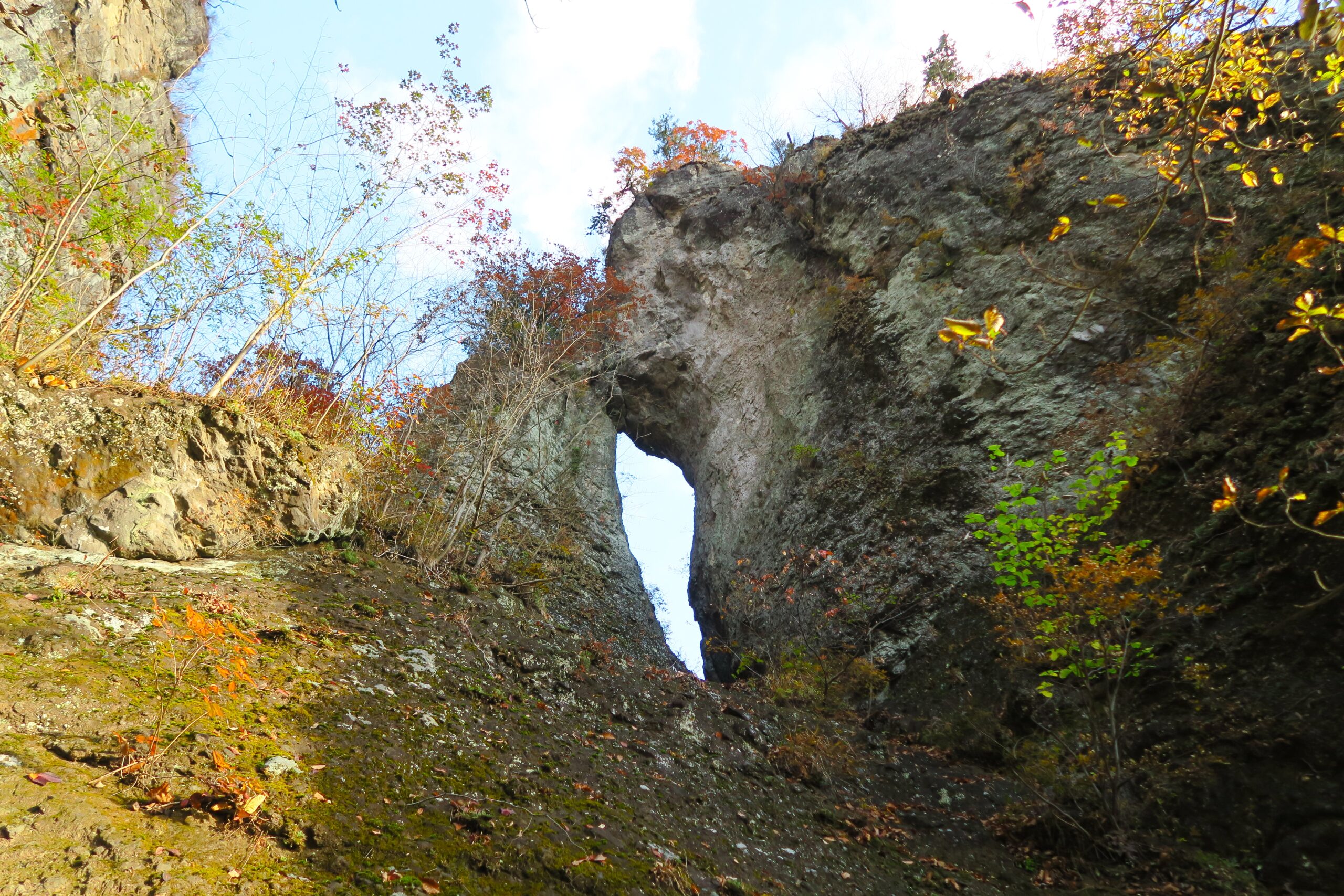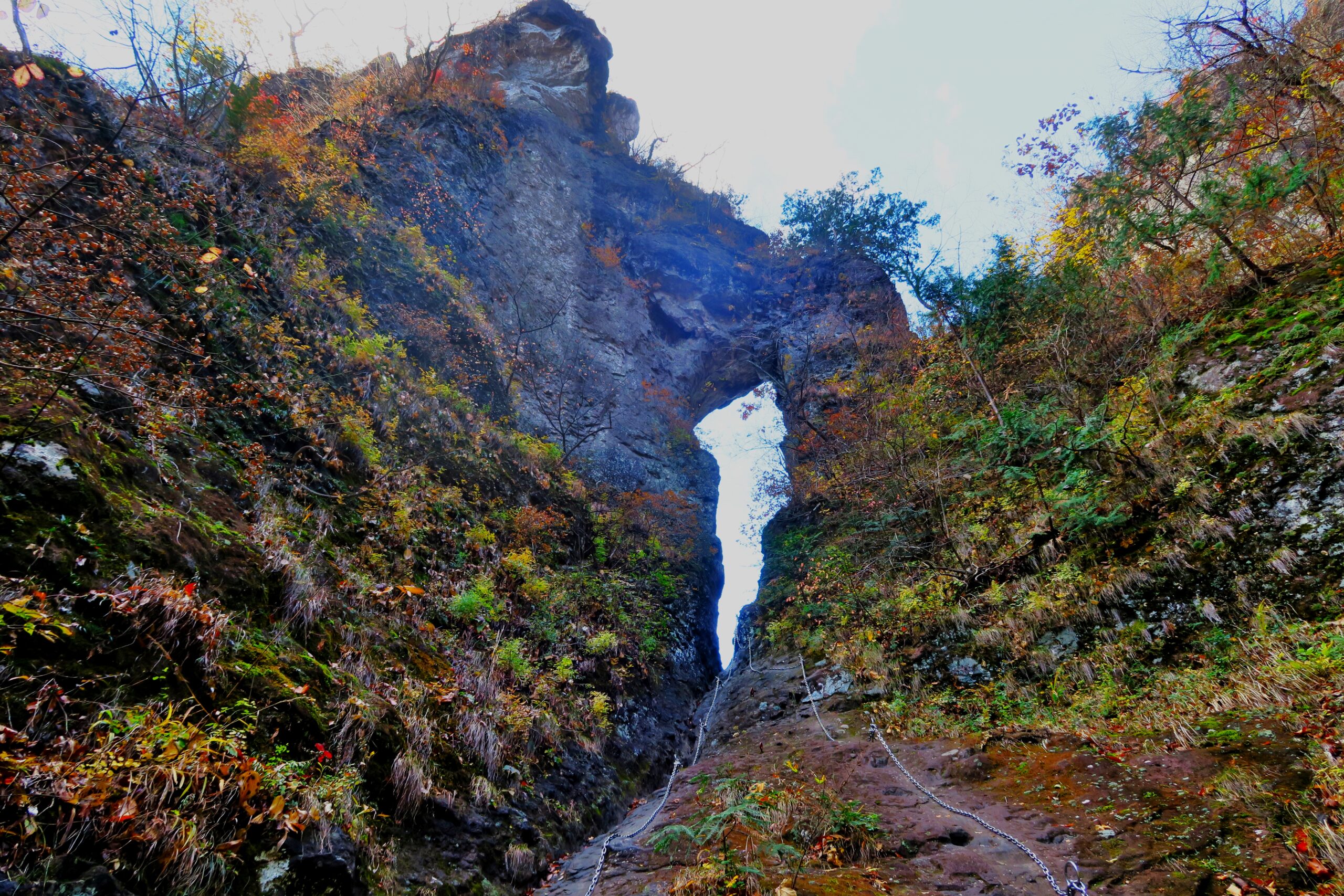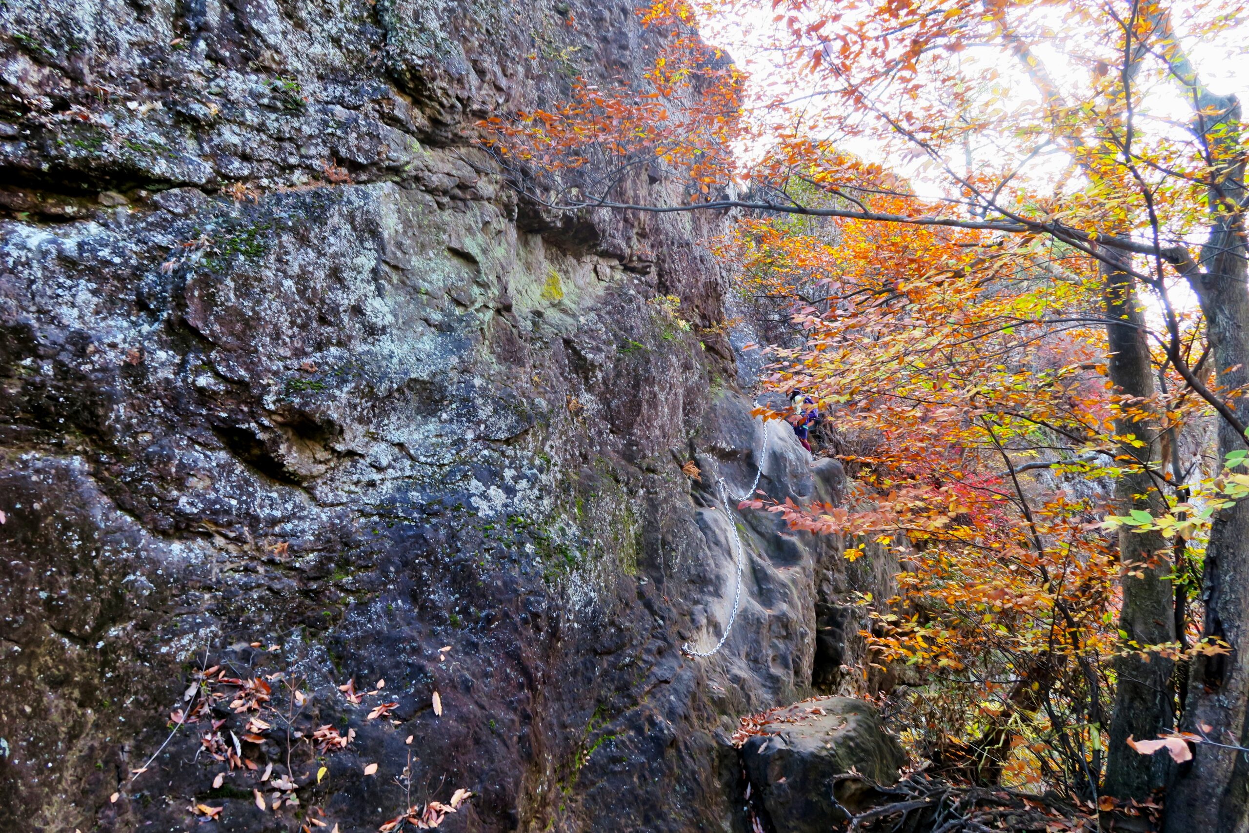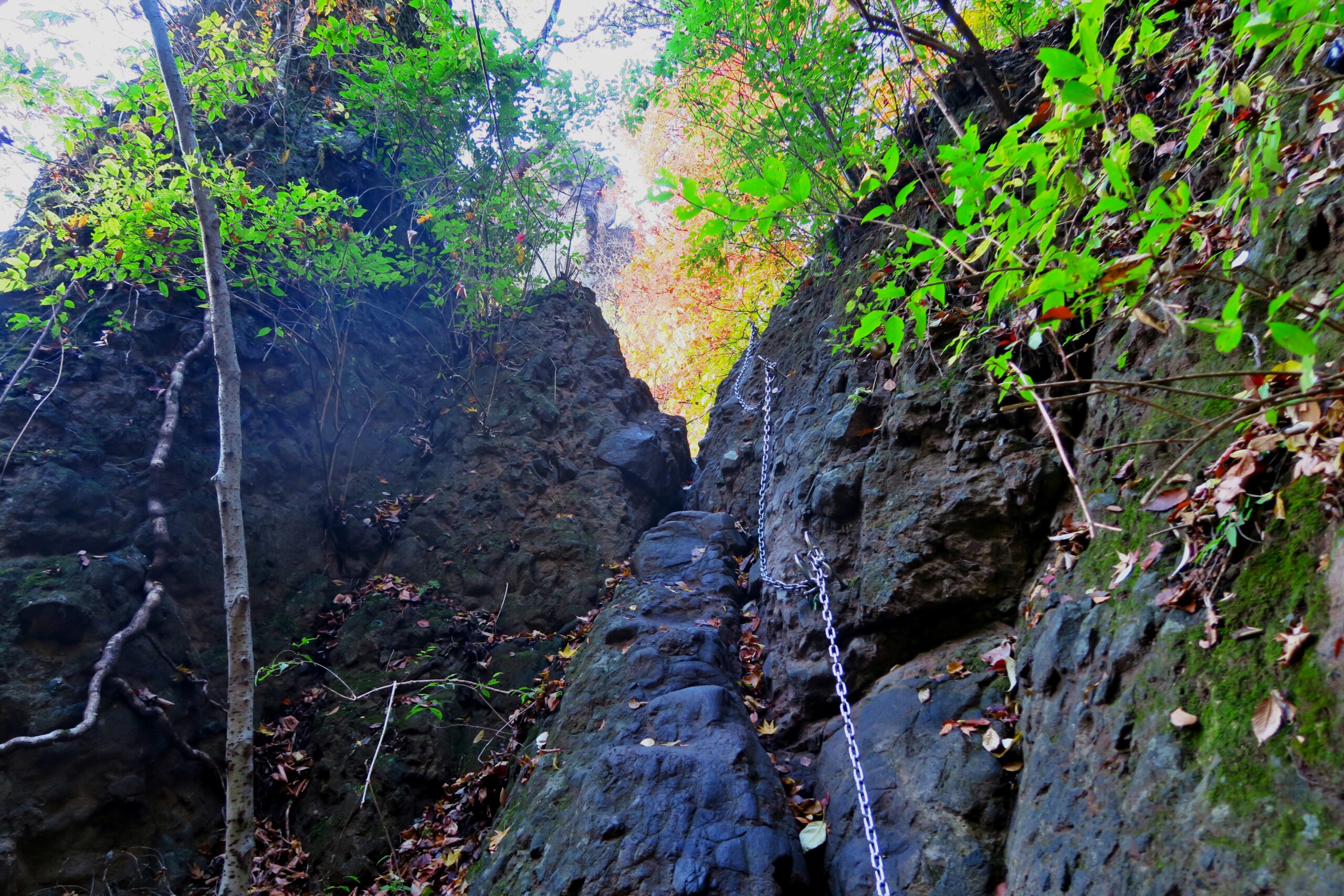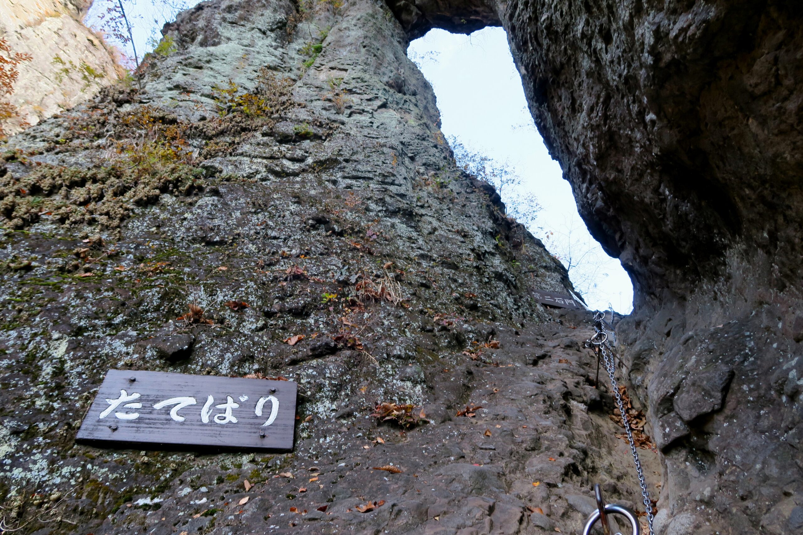 驚きが醒めぬまま整備された登山道を進むと上部にそそり立った岩に縦に細長く穴が開いた第二石門が見えます。「カニのよこばい」「たてばり」「つるべさがり」と呼ばれる鎖場は「第二石門」をくぐるためのこのコース最大の難所です。切り立った地形ゆえに高度感はあるものの足場も鎖もきちんと整備されているので、実は難なく通過することができます。