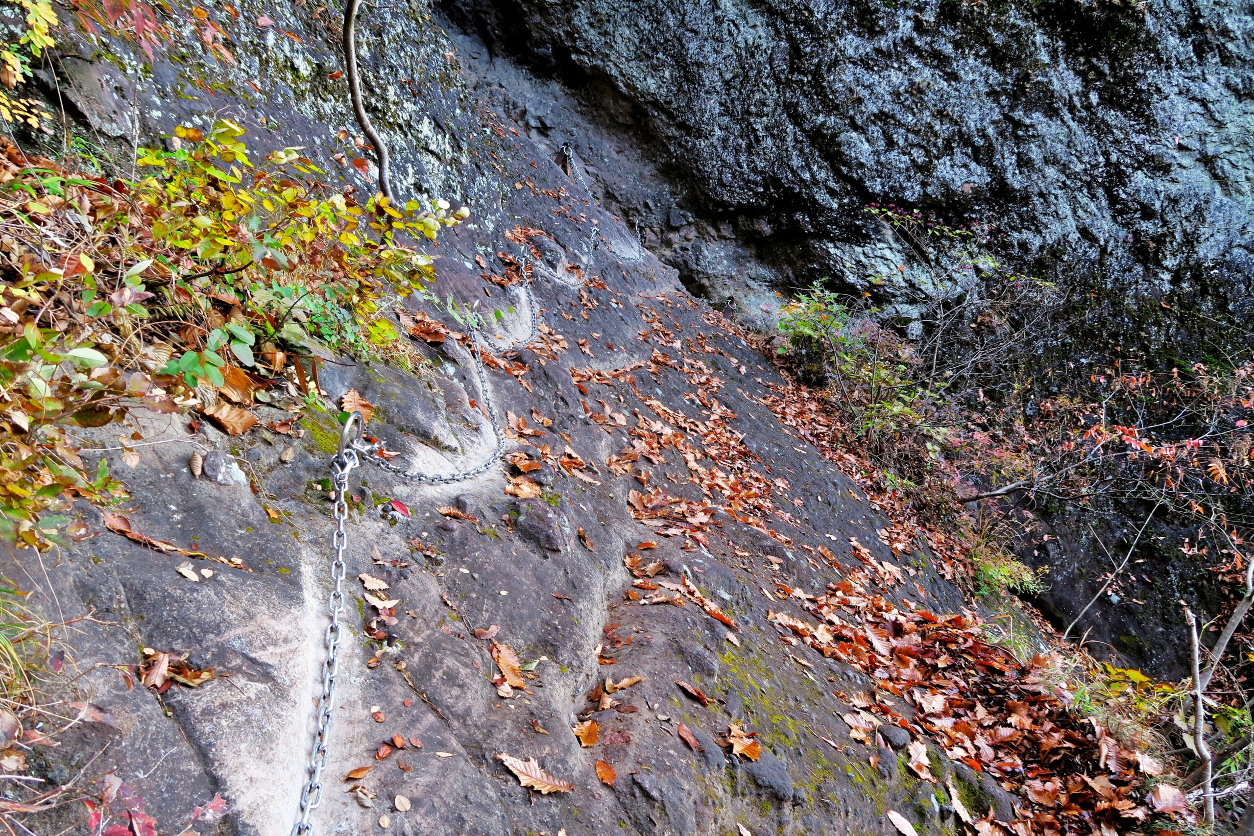 まずは第二石門下の「カニのよこばい」は、10mほどトラバース(横移動)していきます。鎖を握り締め、岩のくぼみに足を載せて慎重にかにのように横歩きで進みます。谷側の傾斜も緩く、足を置くところにはほとんど窪みがつけられていて、足跡を辿っていけばすんなり通過できます。