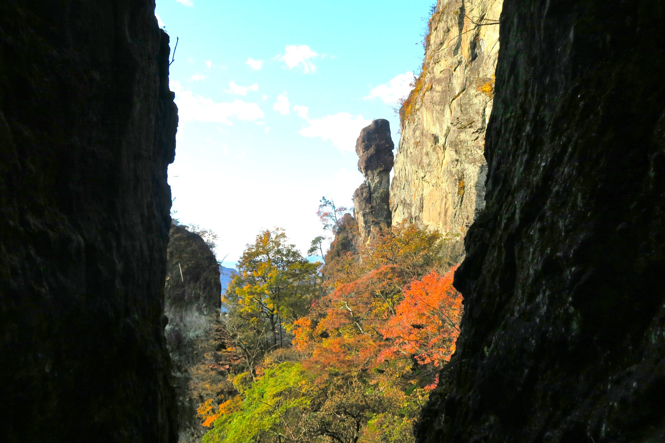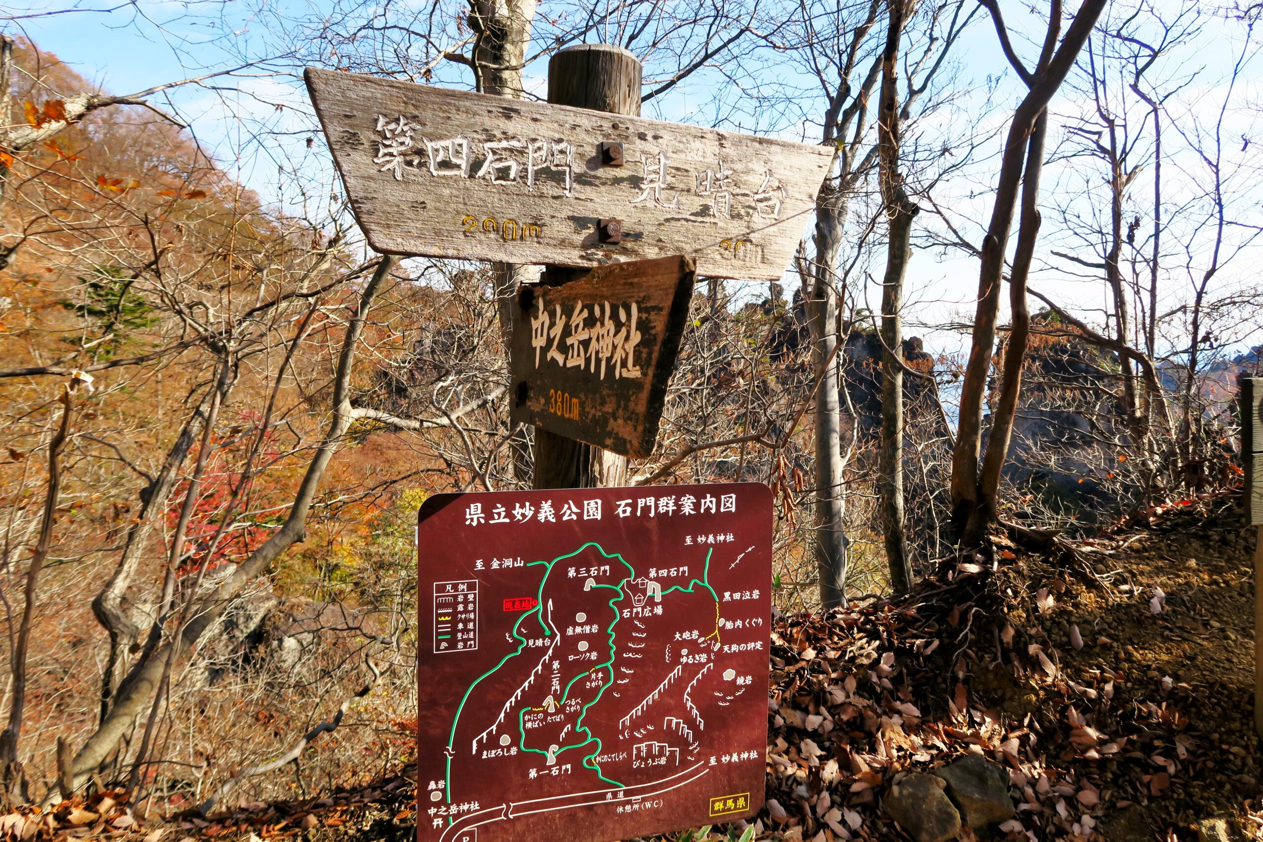 妙義山の主峰である白雲山と金洞山を結ぶ縦走路は、難易度が高いことで知られます。尾根道は身の幅しかなく、ほぼ垂直に近い長い鎖場の連続、もちろん登山初心者が登れるような場所ではありません。しかしこのたけだけしい山塊の中に、初心者でも楽しめるトレッキングコースがあり、それが「石門めぐりコース」です。
