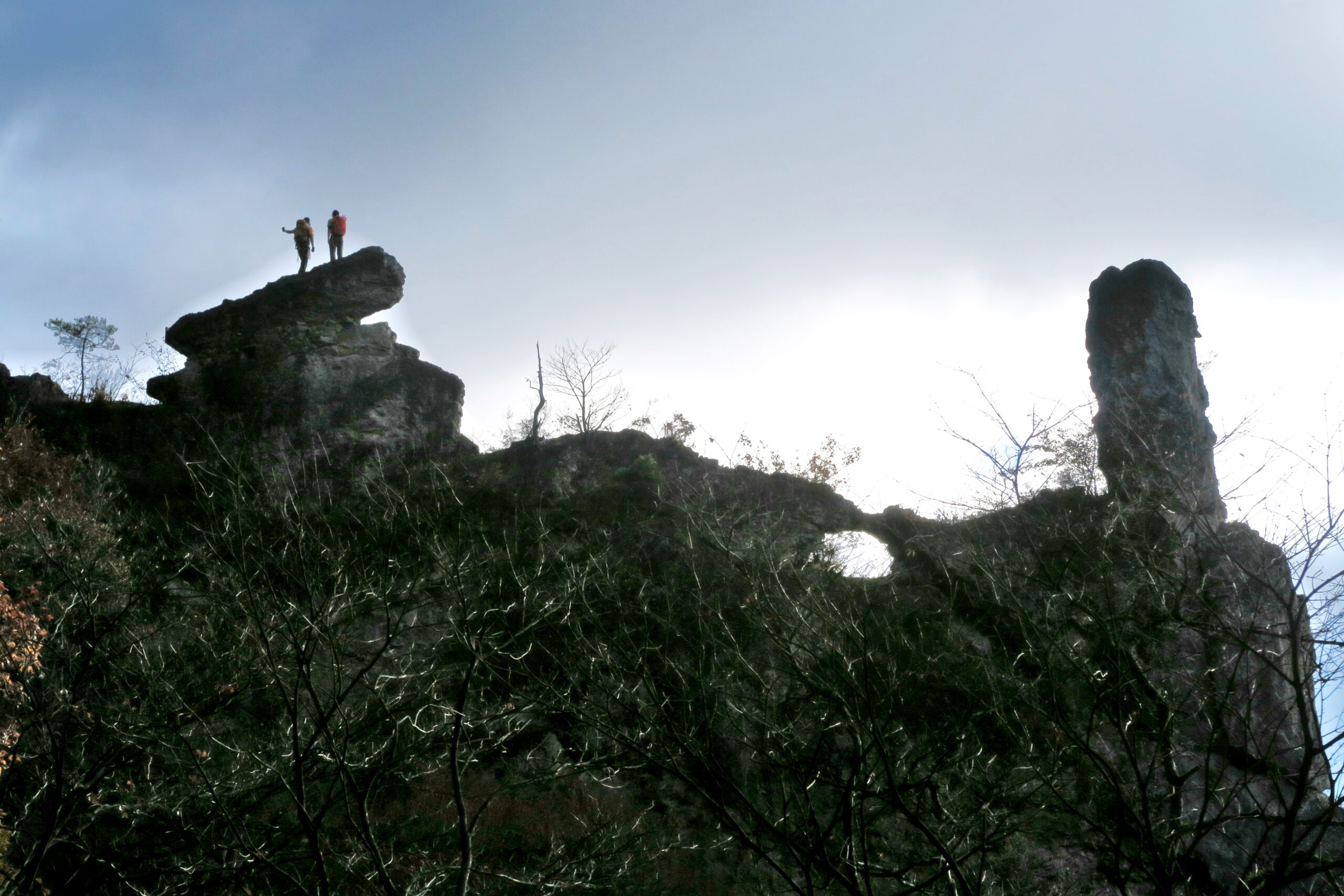 上の分岐から2、3分の急傾斜を歩くと視界が開け、陽光に輝く巨大なアーチ「第四石門」が現れます。「第四石門」は、細長くアーチ状になっていて、大きな穴の向こうには、まるで宙に向けられた大砲のような形の、その名も「大砲岩」が見えます。