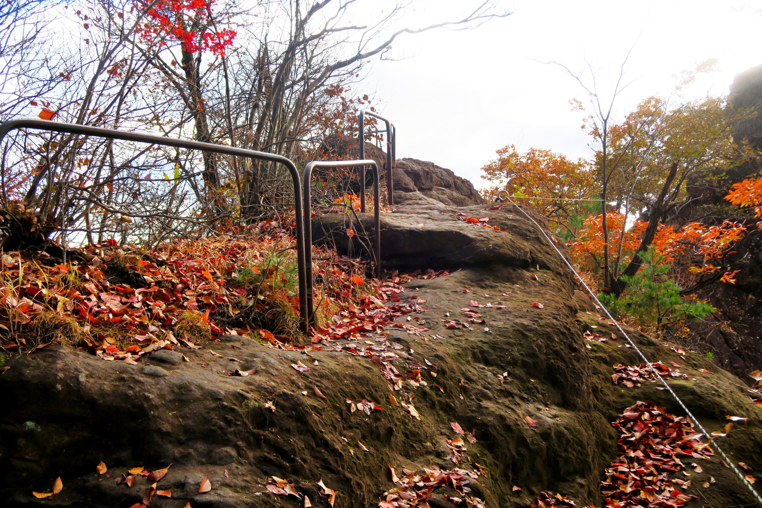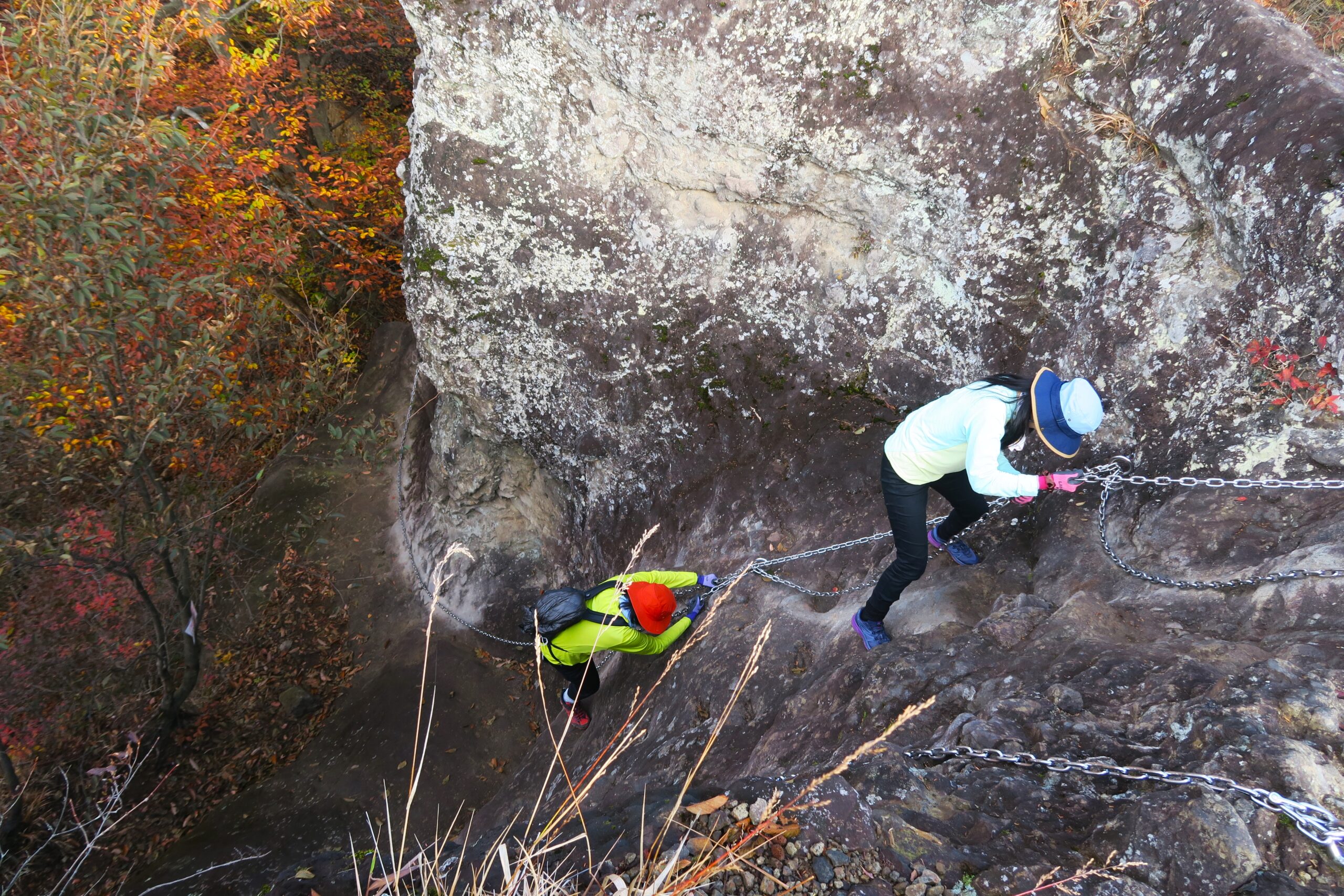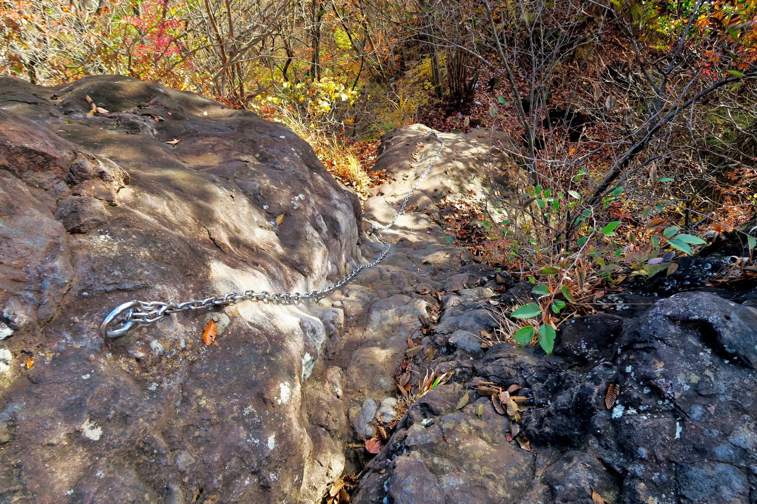 石段の登山道を歩き始めてすぐに高さ3mほどの鎖場に慣れるためなのか「カニのこてしらべ」というスポットに出会います。身長より少し高いぐらいの鎖場で、軽くウォーミングアップ程度ですが、冒険心をくすぐります。初めてであれば少しびっくりしますが、実際に鎖につかまって登れば、勇ましくなった気がします。岩を上る足の置き場には窪みがあり初心者でも難なく登れます。ぜひかにからの挑戦を受けてたちましょう。無理な人には横から迂回ルートもあるので安心です。全身を使い鎖場を登り切り、岩上にでます。