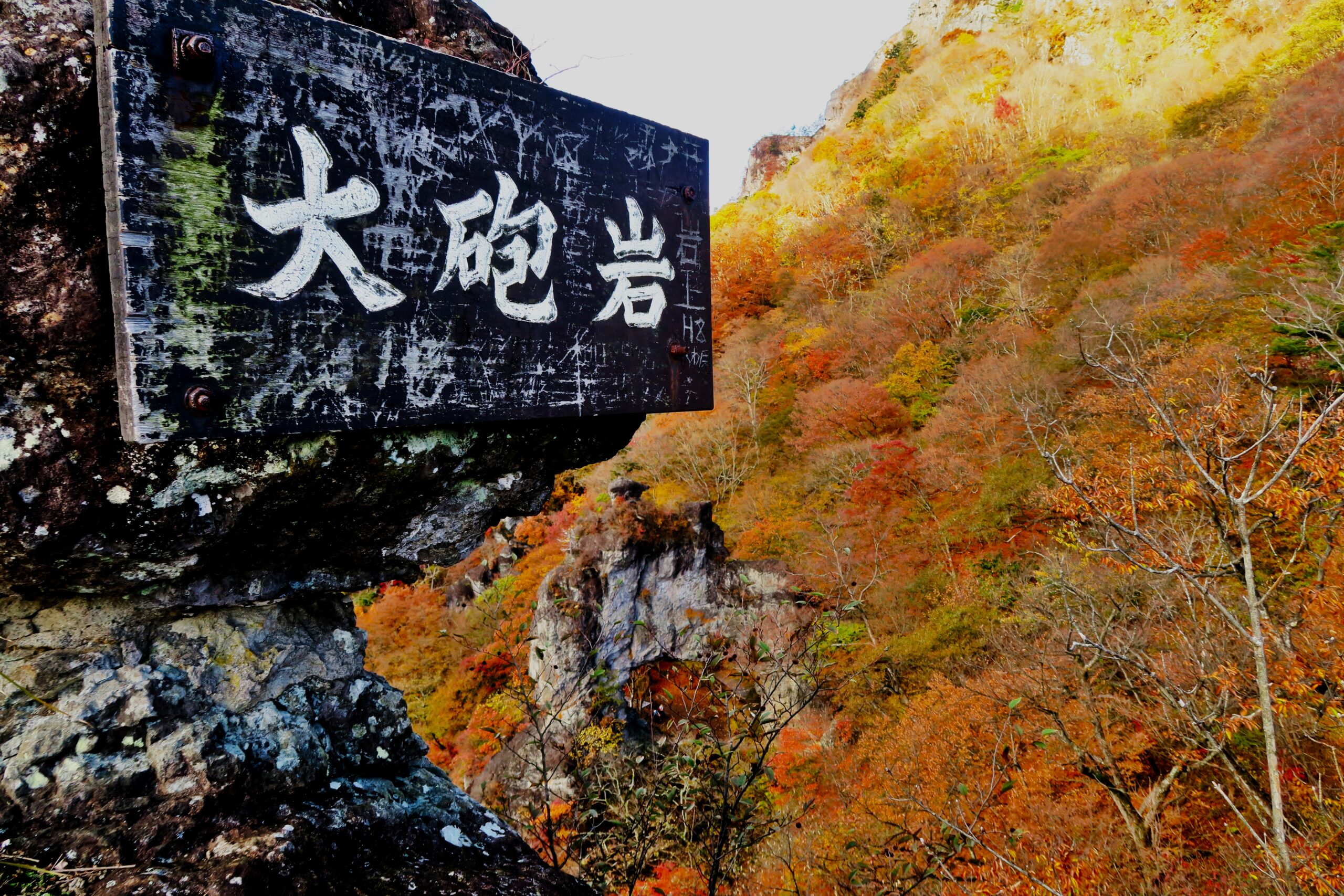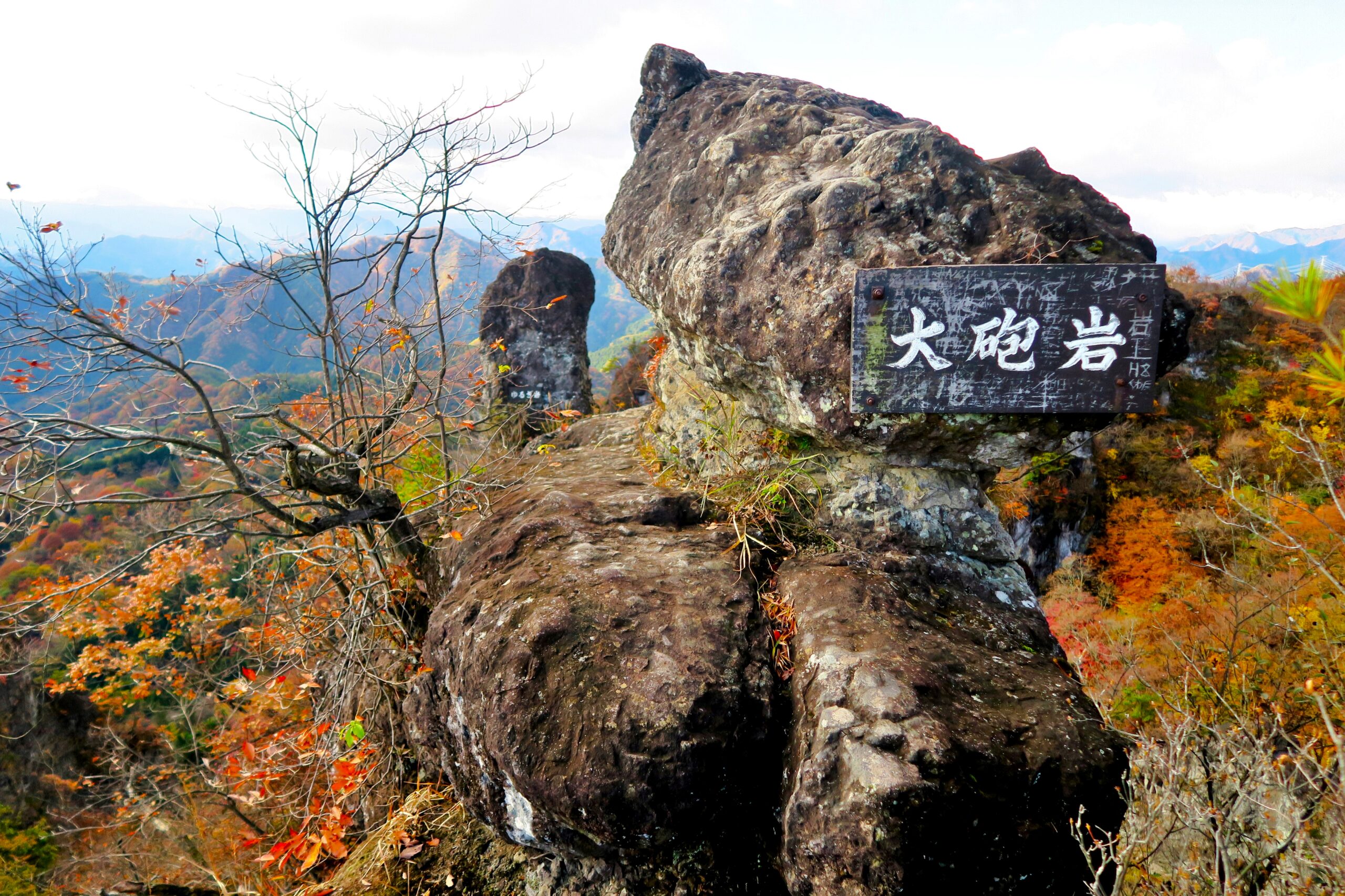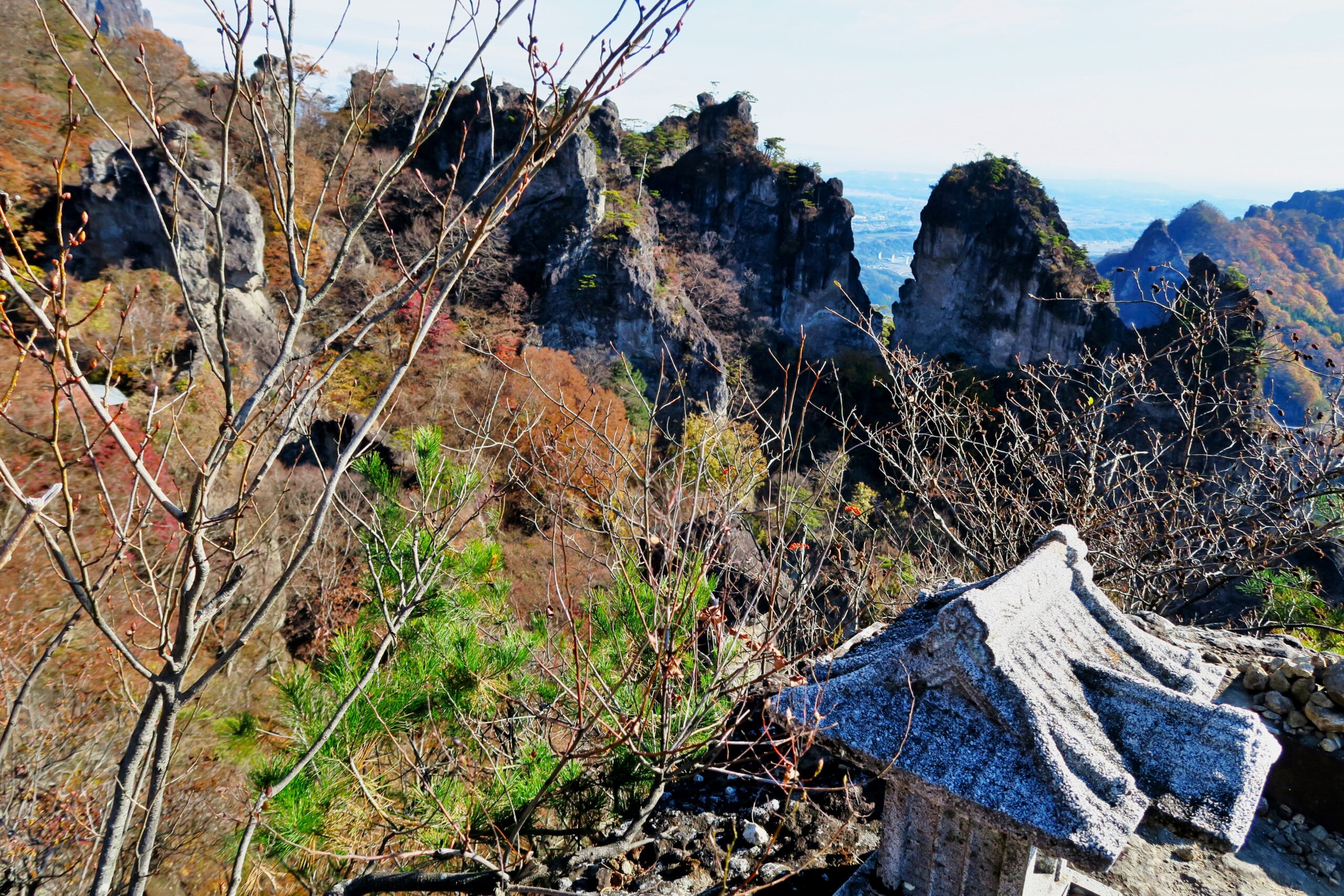 本当に大砲そっくりで、自然が作りだした造形にこれが妙義山かと見入ってしまいます。石門や大砲岩は、江戸時代の書物にも書かれていて、古くから信仰と観光を兼ねた『妙義詣で』で人を集めた山でした。麓からは決してその全容が見えない石門や奇岩の連続する妙義山は、その懐に奇妙かつ美しい造形を秘めていました。だからこそこうして歩いて登って見に来る価値があります。大砲岩に登っている人影が見えますがこれからそこを目指します。