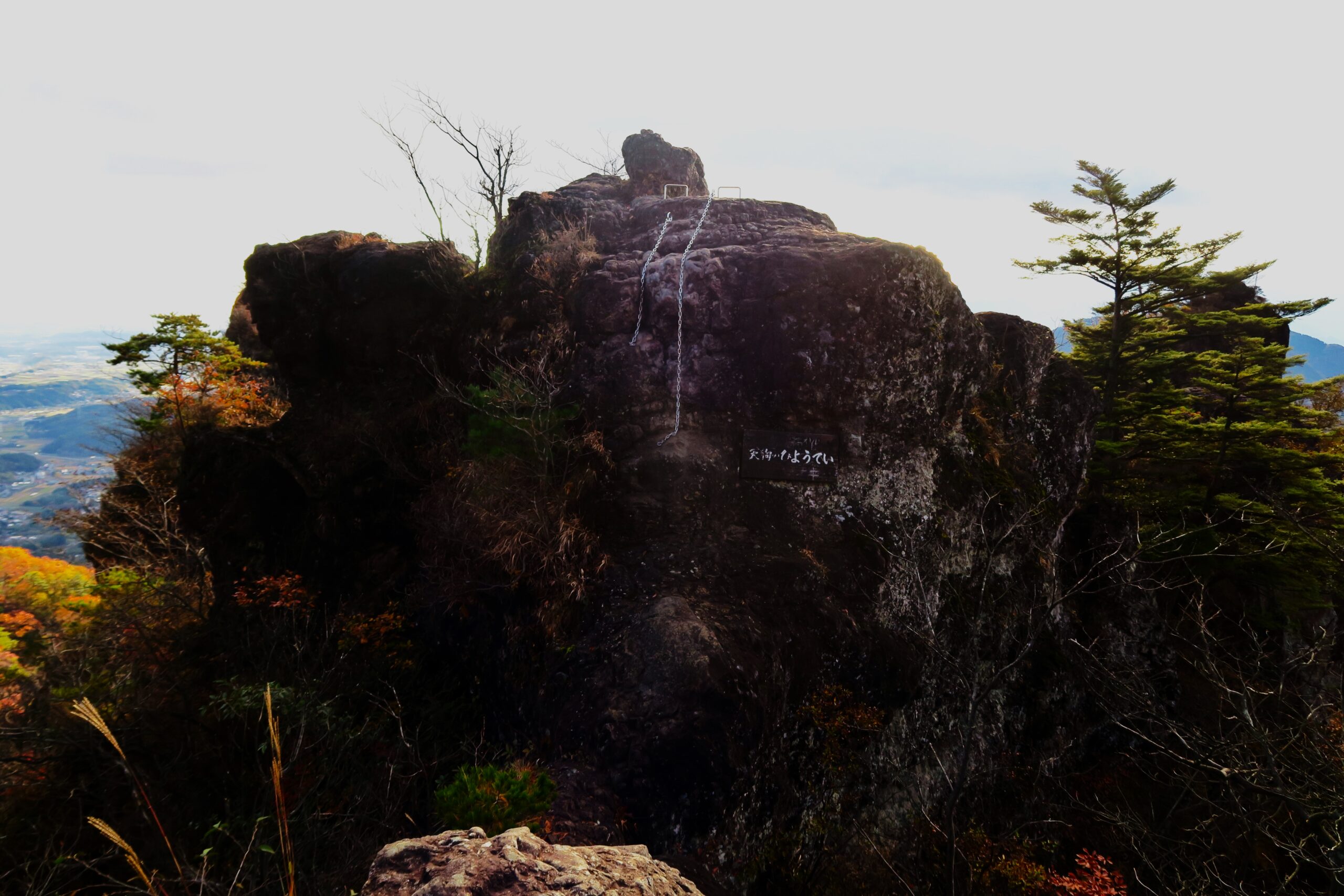 正面には「天狗のひょうてい」と呼ばれる展望台のような岩が見えます。かなり細い岩場道を進んだ先の3mほどの垂直の岩壁を登るこの鎖場は難易度が高い所です。無理は禁物です。
