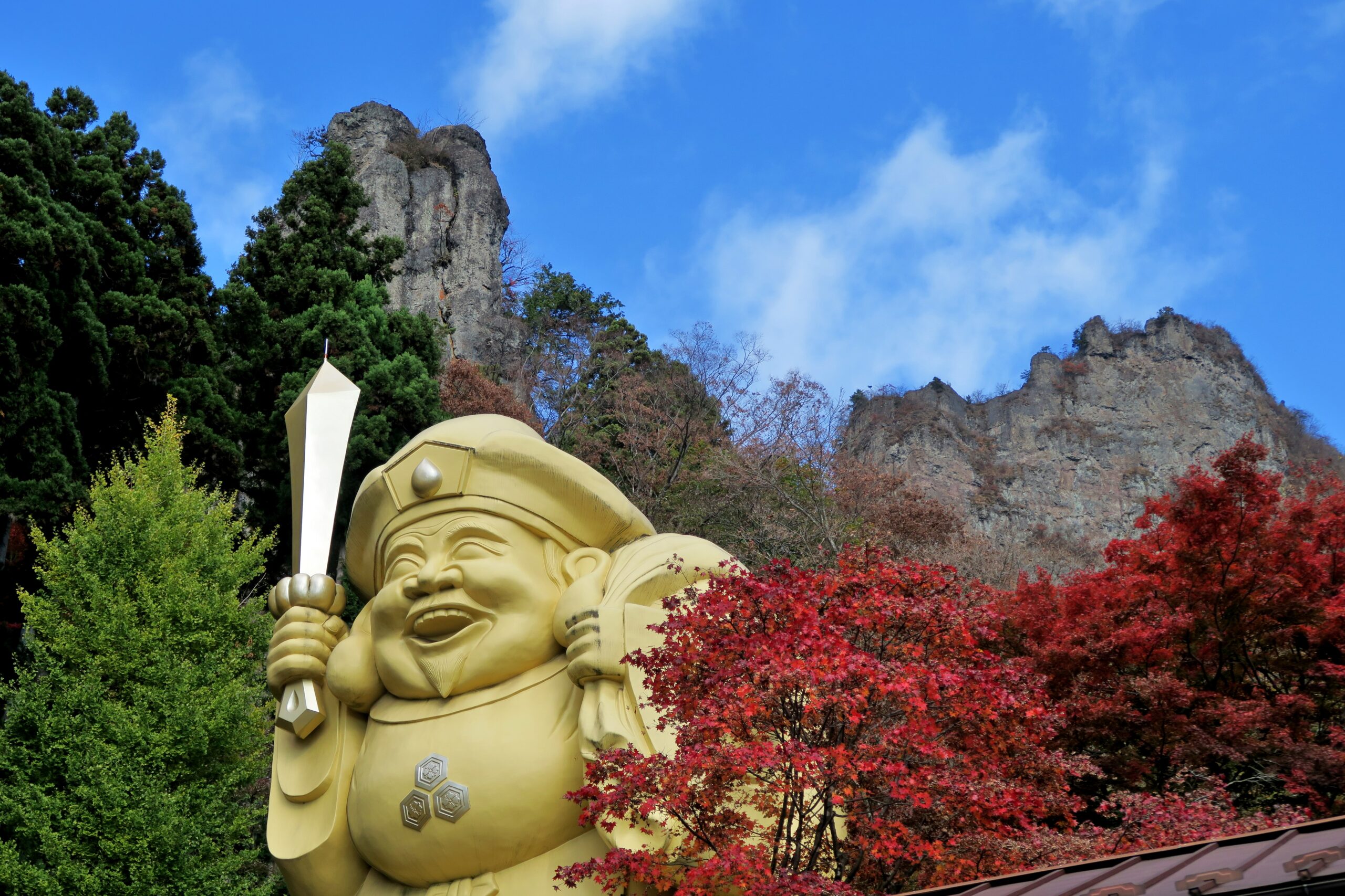 一般的に大黒天は木槌を持っていることが多いのですが、高さ20m、重さ8.5tの巨大な黄金剣を持つ大国様が特徴的で、県立妙義公園駐車場からも鳥居の向こうにある黄金に輝く巨大な大黒天像は見つけやすく目印になります。