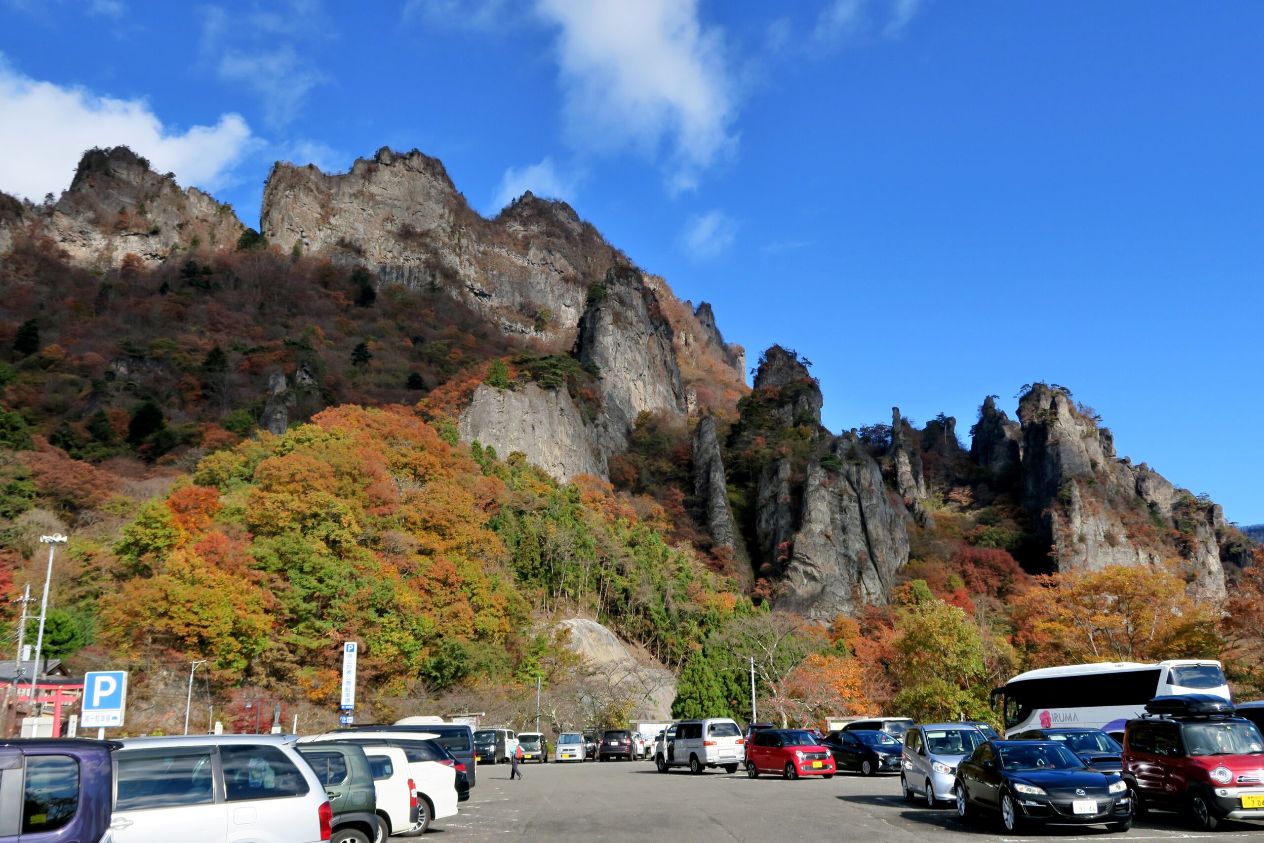 出発地の中之嶽神社の入口前にある県立妙義公園駐車場(トイレも完備し400台駐車可能)に車をとめます。標高720m、ここから前方を見上げるとさっそく荒々しい岩山が眼前に迫ってきます。飲料水の自動販売機もあり、トレッキングの準備をしっかりしていきます。ここは「県立森林公園 さくらの里」の駐車場でもあり、さくらのシーズンには紅葉シーズンとはまた違った華やかな雰囲気になります。