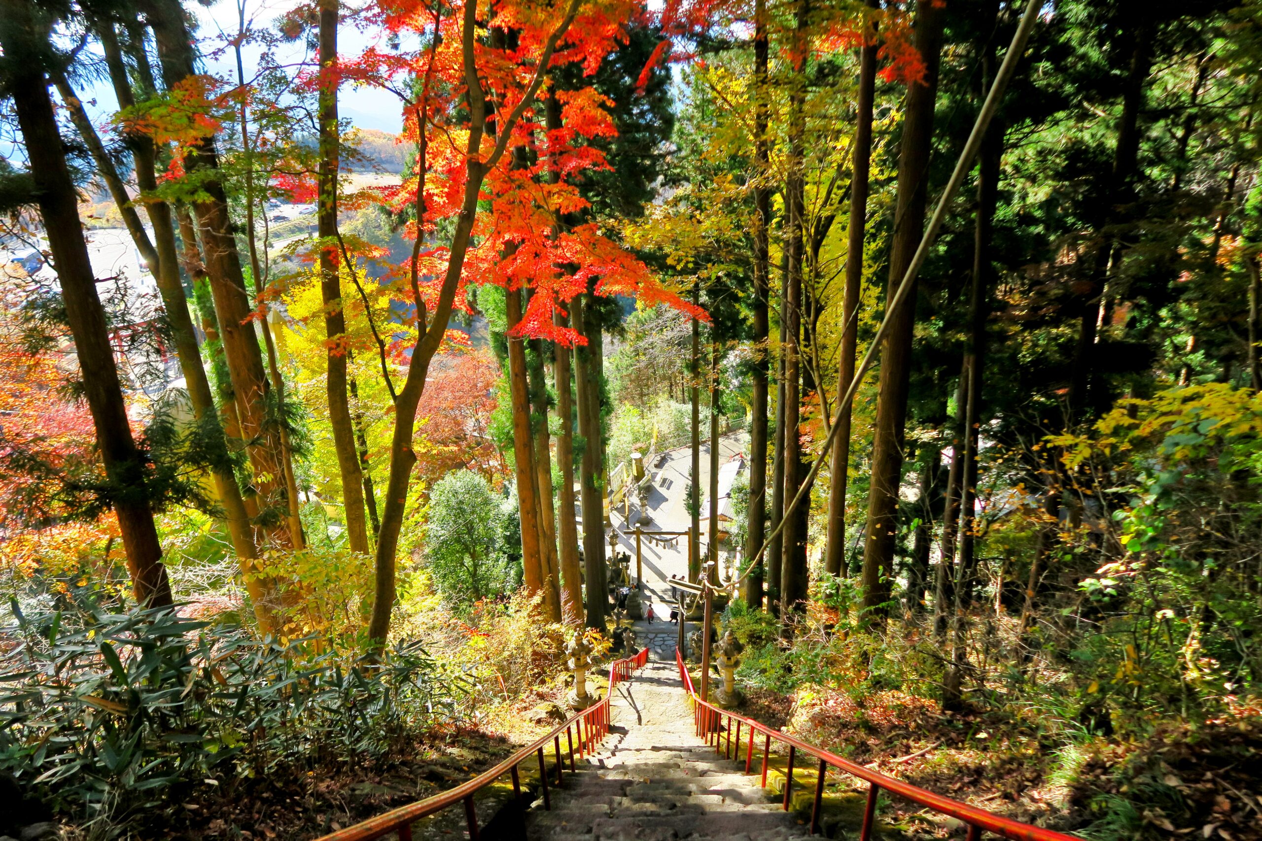 拝殿からは145段、斜度40°の長い急な階段を神社に祀られている黄金色の大黒様を見ながら下りていきます。