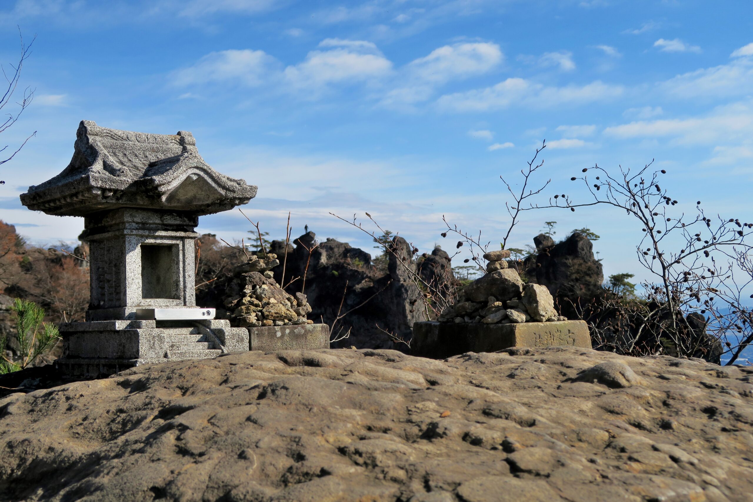 手前の岩は足場もあって上に登ることが可能で、奥の岩には小さな祠があります。