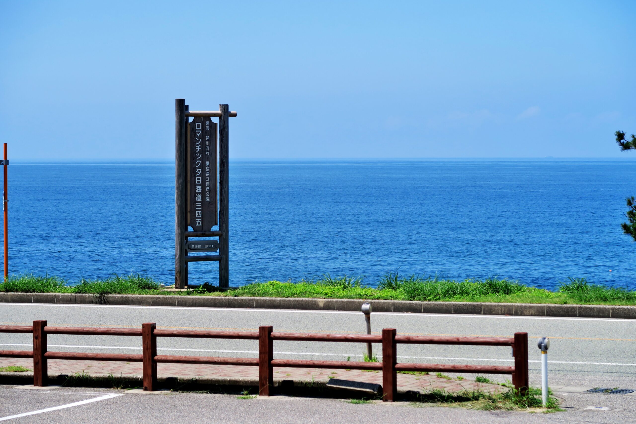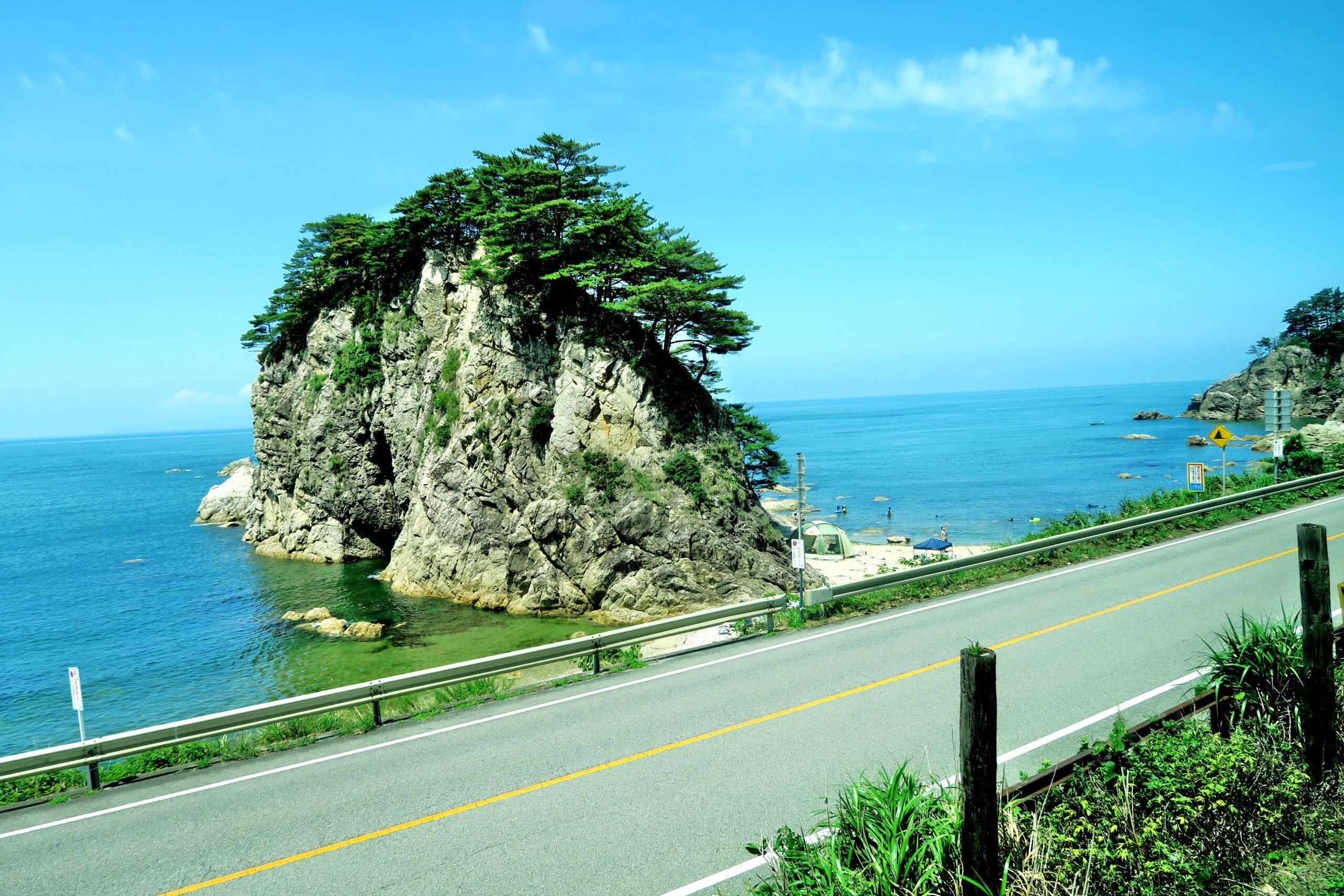 三面川を渡って小さなトンネルをいくつか抜けるときらきら輝く日本海がから車窓に現れます。列車は海際を走り、次の桑川駅は、日本百景にも選定されている県下有数の海岸景勝地「笹川流れ」の最寄り駅です。「道の駅 笹川流れ」が併設されていて国道345号(日本海夕日ライン)とJR羽越本線が海岸に平行して走っています。桑川駅から勝木駅まで海と奇岩、白砂の浜がつくり出す名勝「笹川流れ」の絶景が続きます。