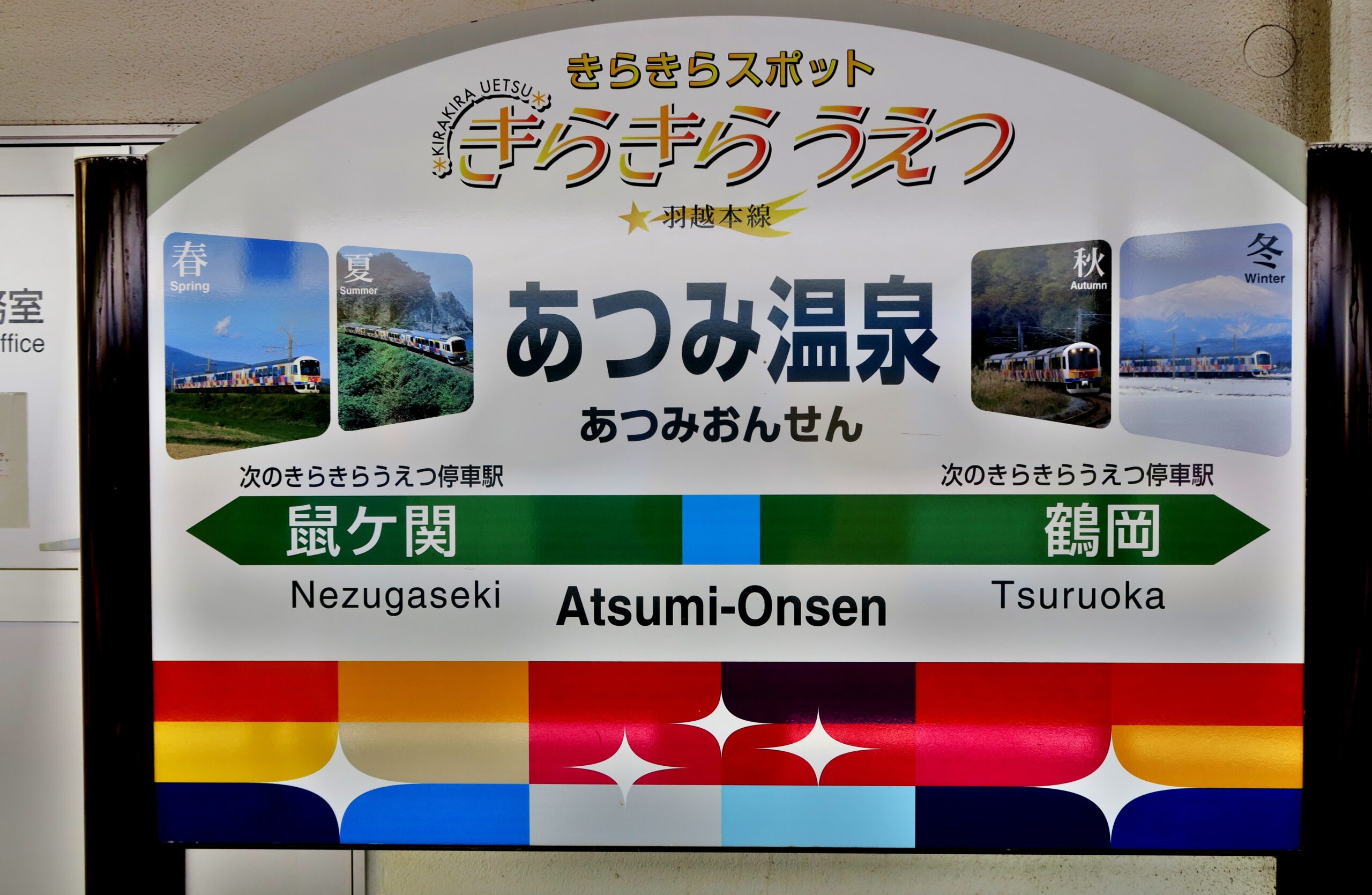 勝木駅、鼠ヶ関駅、あつみ温泉駅と停車していきます。温海川を少し内陸に入ったほとりに湧く「あつみ温泉」は開湯1000年以上の古湯です。